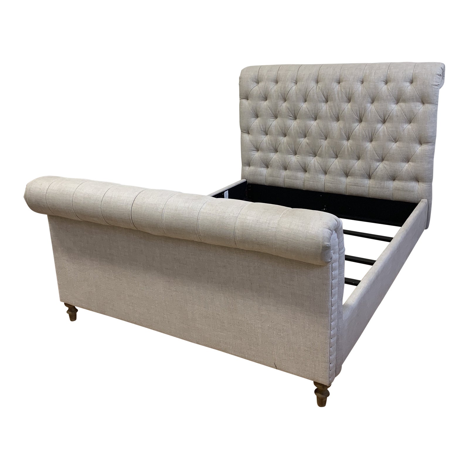 Design Plus Gallery presents a Restoration Hardware Queen Size Chesterfield Bed Frame. Rolled headboard and footboard add to the inviting feel of the tufted construction of this cohesive frame. Fully upholstered In a light and earthy Belgium linen. Visible wear on fabric. Legs made of turned wood. Timeless style for any soothing bedroom space.
