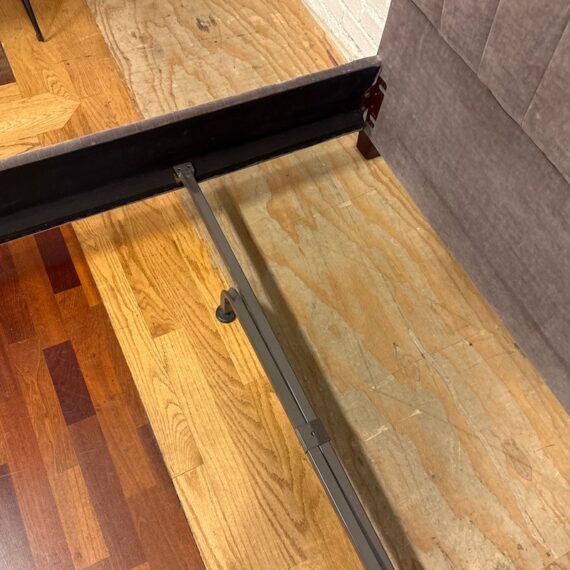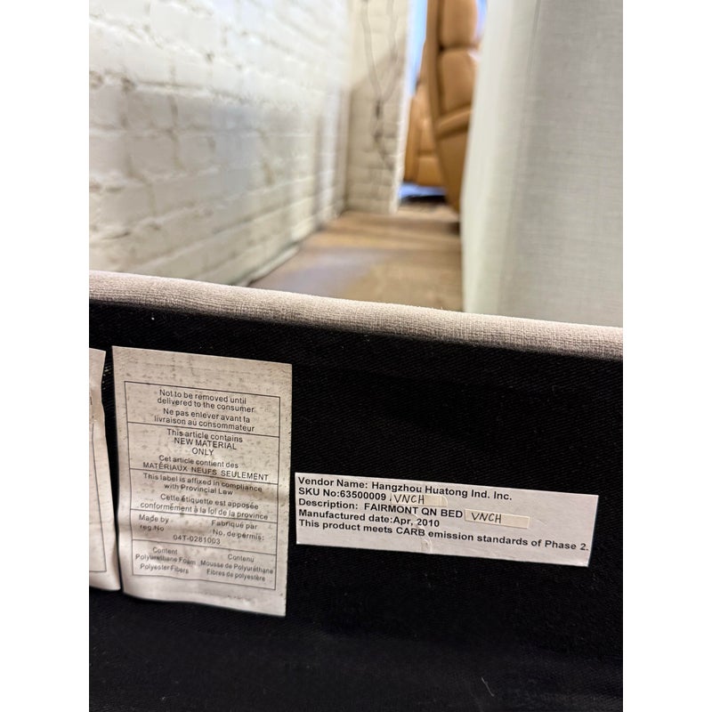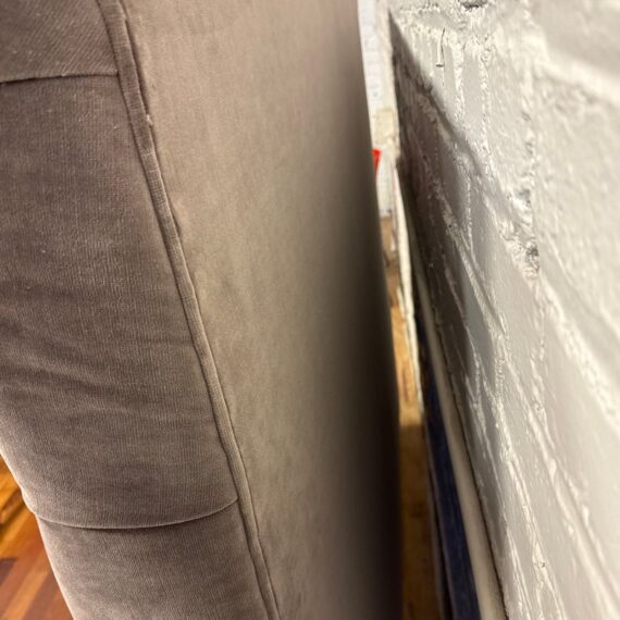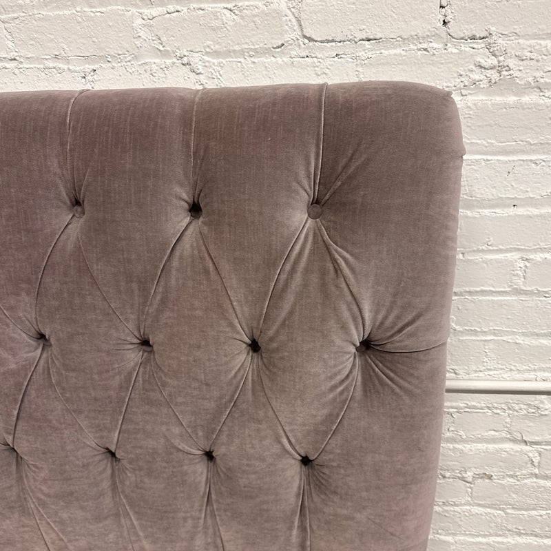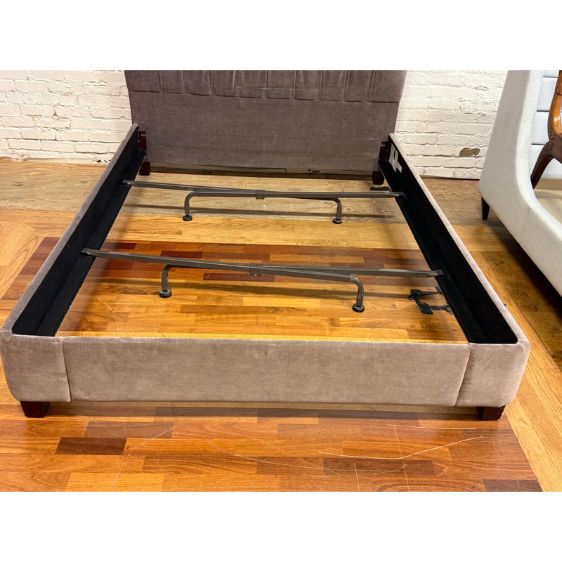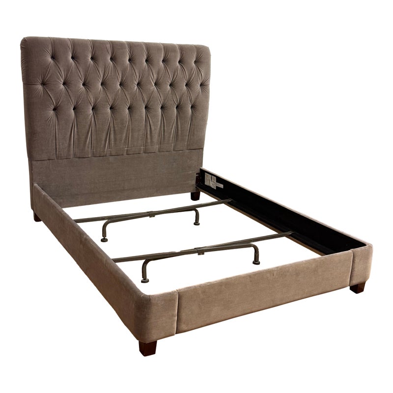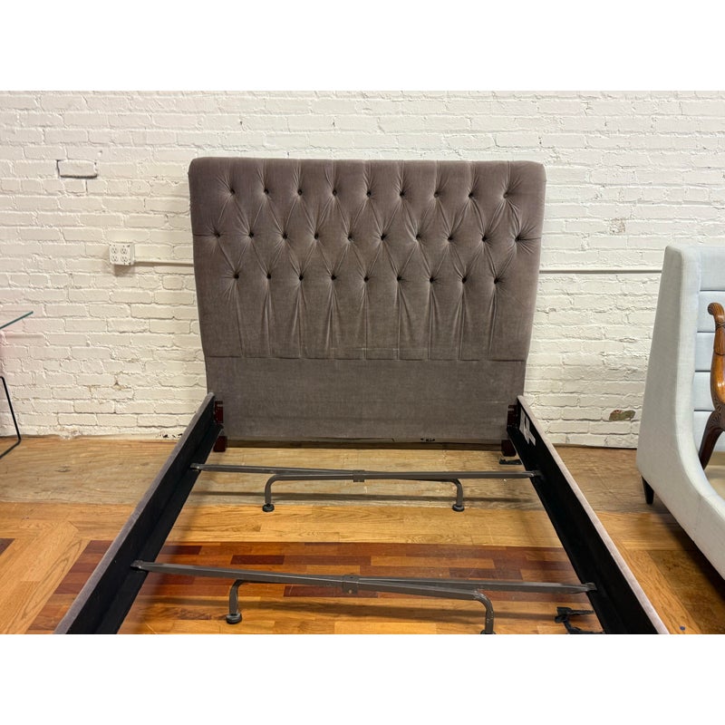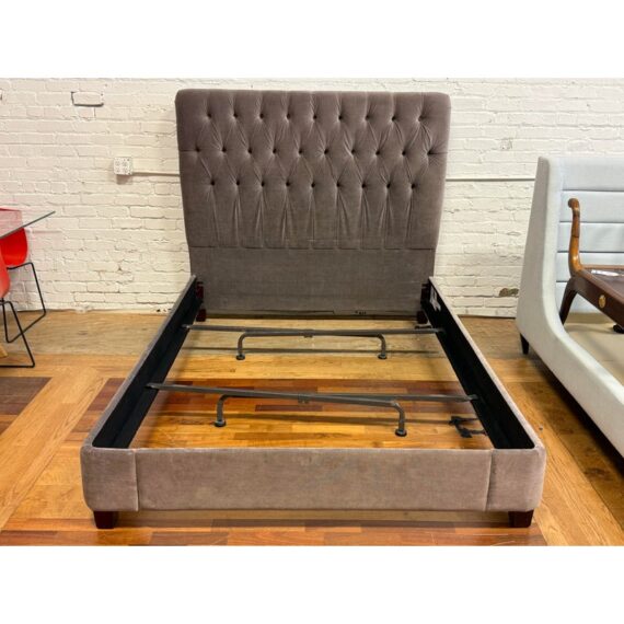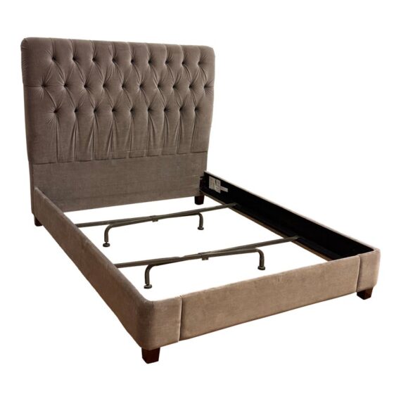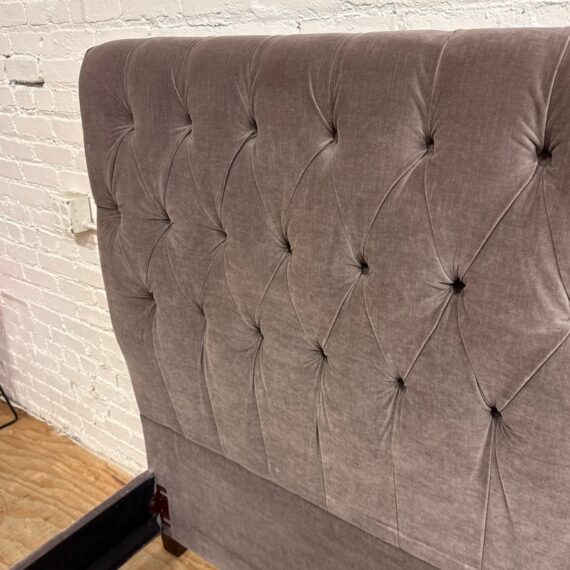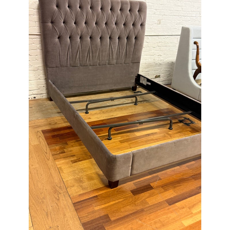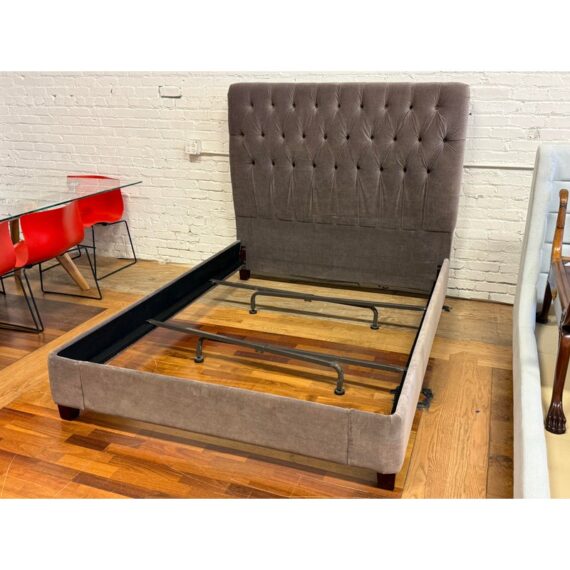 Design Plus Gallery presents the Velvet Fairmont Queen Size Bed Frame from Restoration Hardware. This frame is indulgent with tufting and cushioning surround you their idea of luxury. A celebration of simple forms with the luxe like material of poly velvet in a medium brown, Mocha tone lends itself to sumptuous refinement of 1930s Paris. The frame needs a box spring for best sleep performance. This style of bed is no longer in production with the brand is in fair condition for its usage.