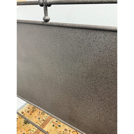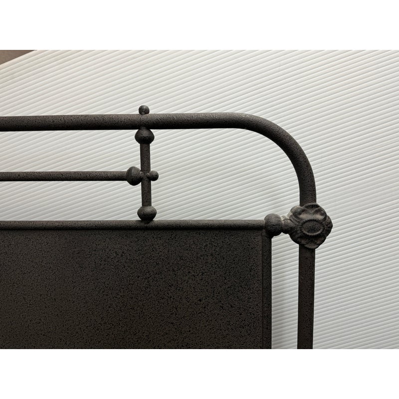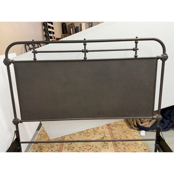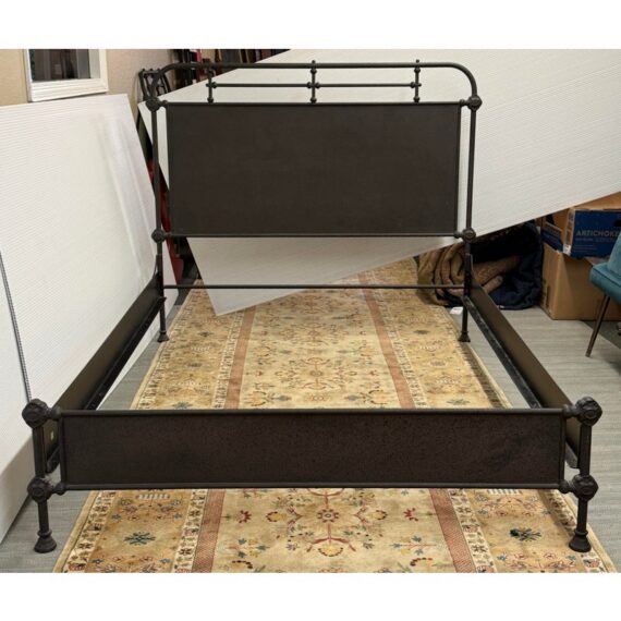 Design Plus Gallery presents the Queen Size Academie Bed Frame from Restoration Hardware. The bed employs industrial materials and masterful finishing techniques, with their reproduction looking much like its early-20th-century French predecessor. It is crafted of iron and steel with cast rosettes at the joints. Includes a metal support system; requires a standard mattress and box spring and is sealed with a distressed, oxidized finish that lends the patina of age. The brand no longer produces this bed, and the frame is in good overall condition with wear that is consistent with usage.