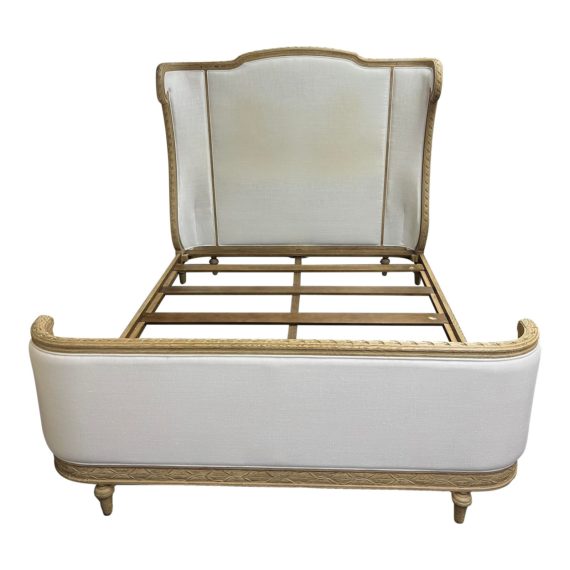 Design Plus Gallery presents a Queen Size Josephine Bedframe by Restoration Hardware. Evoking the romanticism of turn-of-the-century French design, this elegant bed is grand in both scale and beauty. Distinguished by hand-carved flowing curves, corbels and turned legs, the classic bed is expertly constructed of hardwood with enduring mortise-and-tenon joinery. The antiqued natural finish details the wood, bed is upholstered and welted in white linen. Light soil on headboard, as shown.