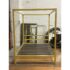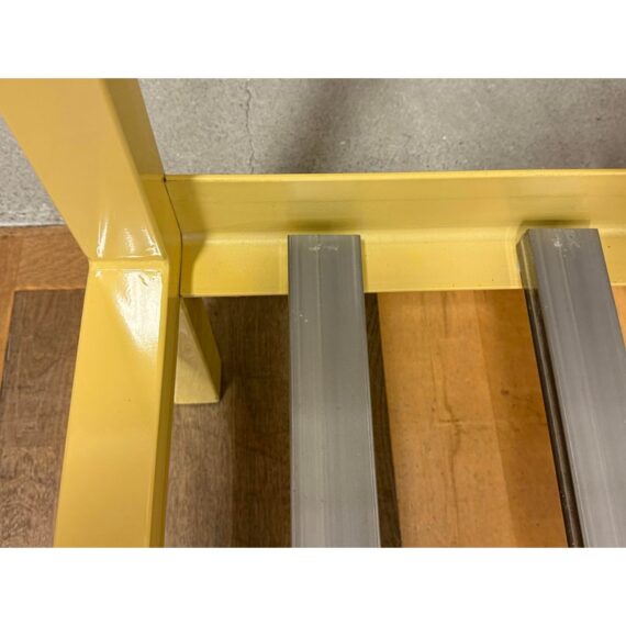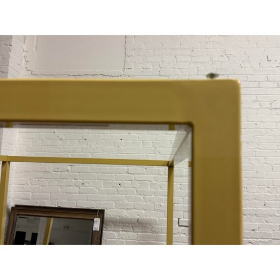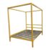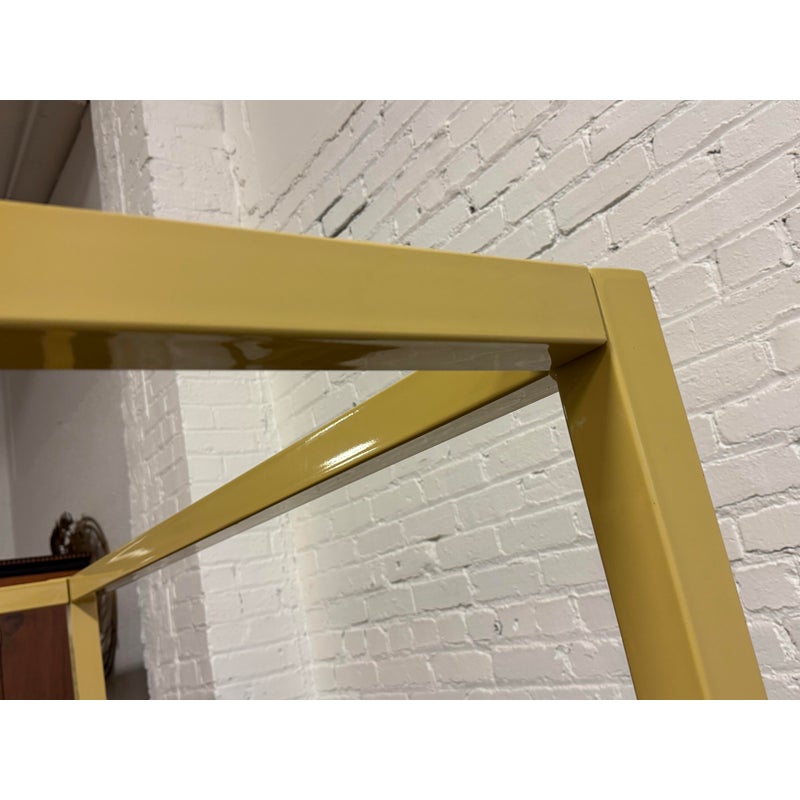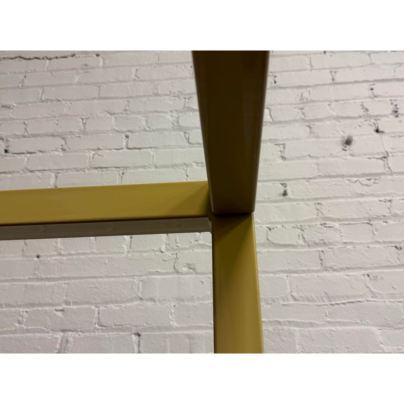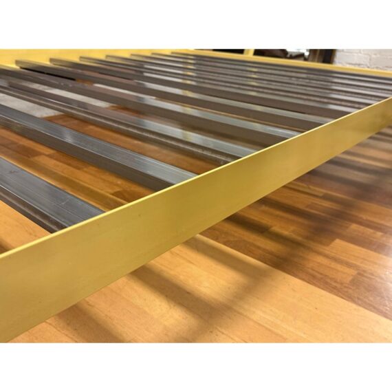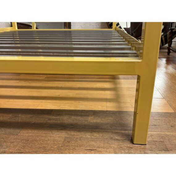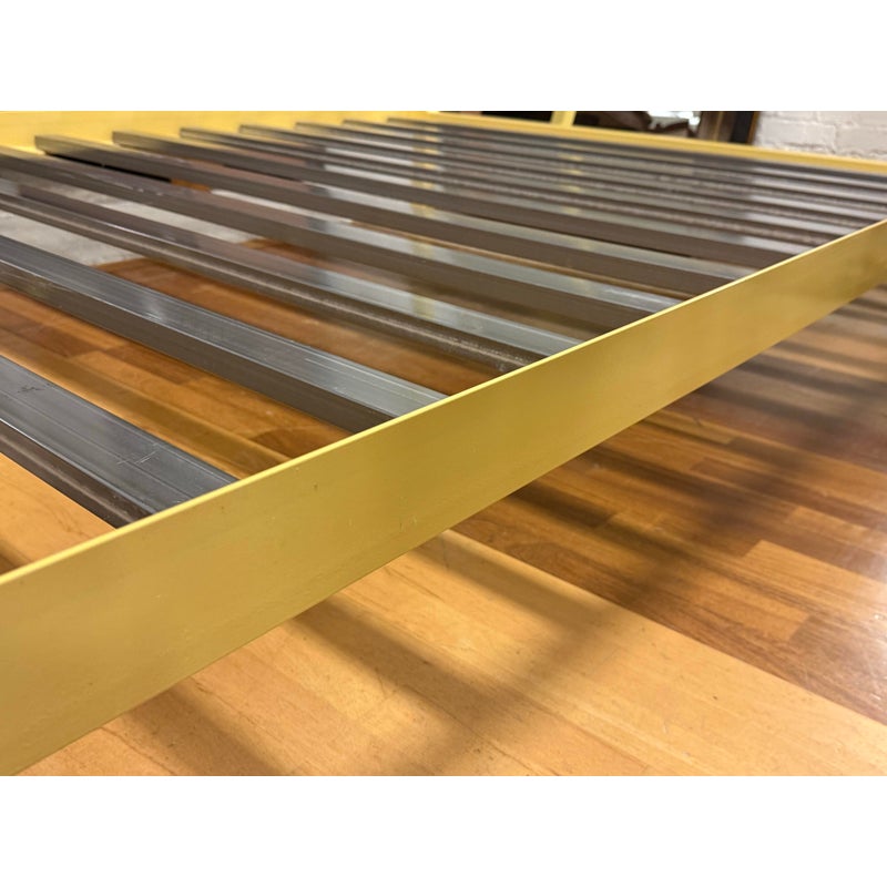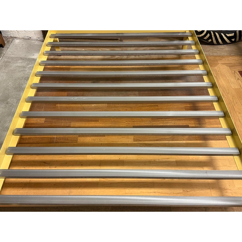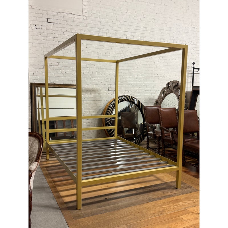 Design Plus Gallery presents a Queen Size Architecture Bed Frame from Room & Board. This bed frames design pairs a linear silhouette made of steel and given their Saffron finish. It has metal slat support for you to have a balanced, open profile. The headboard includes two horizontal rails, and the canopy structure continues the streamlined geometry throughout the frame. It is in good condition with visible and minimal wear from usage with one missing screw to support the top canopy. Made in the USA.