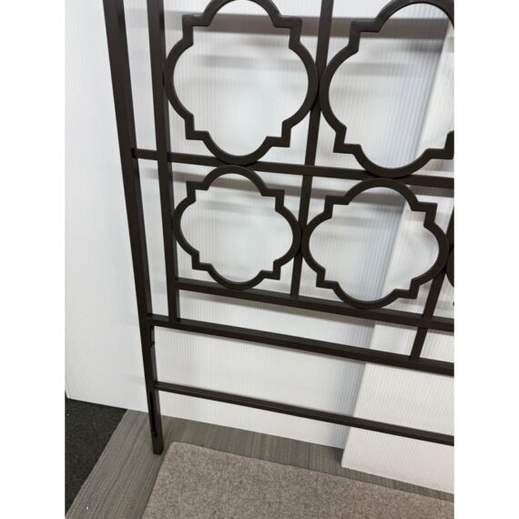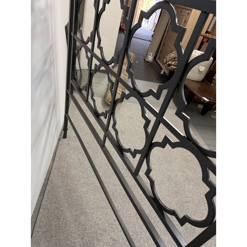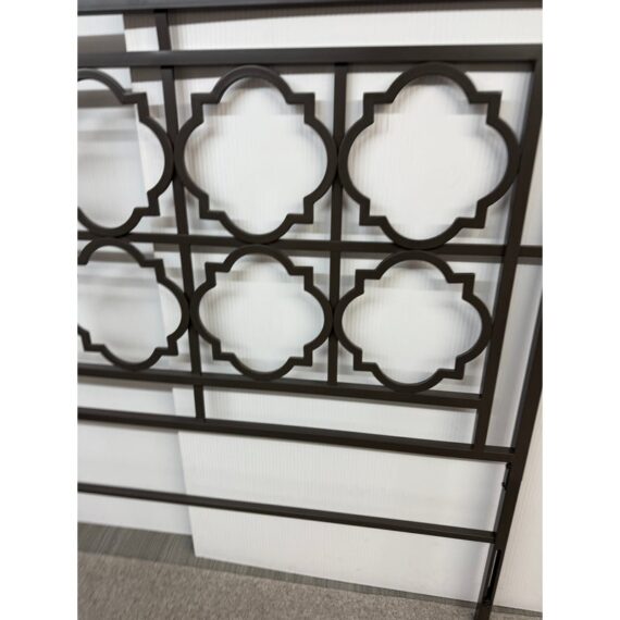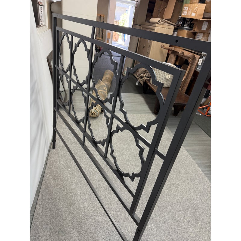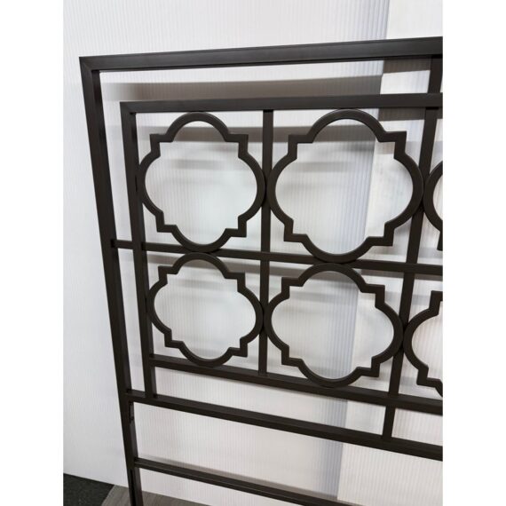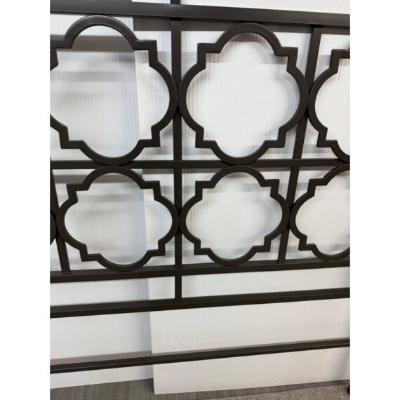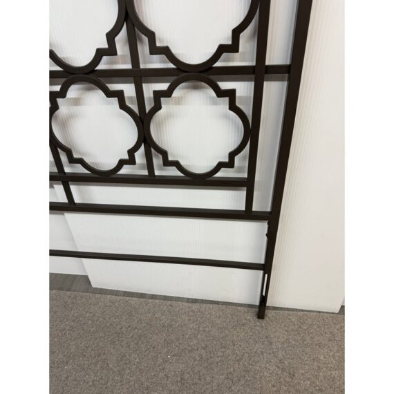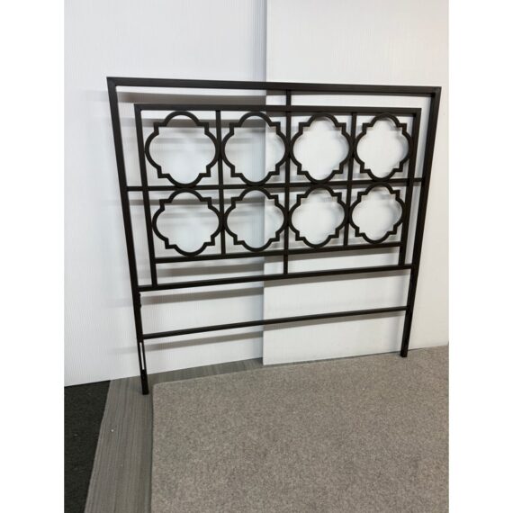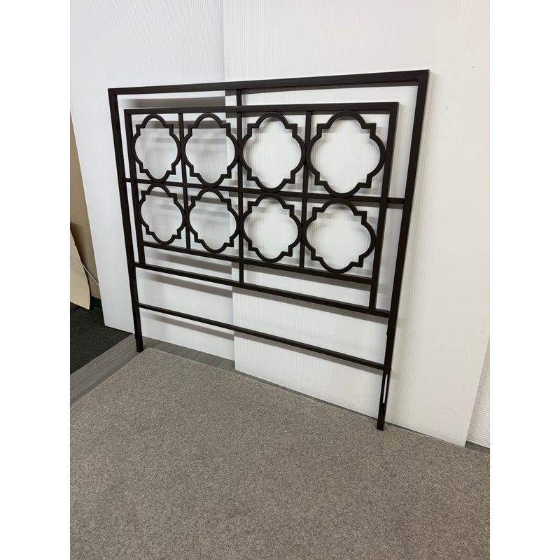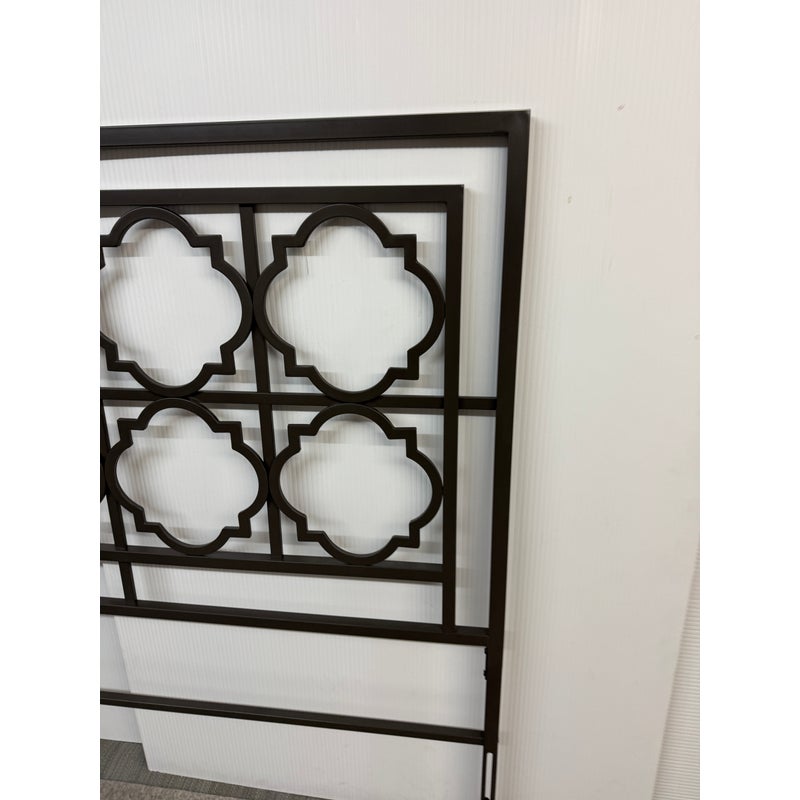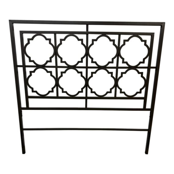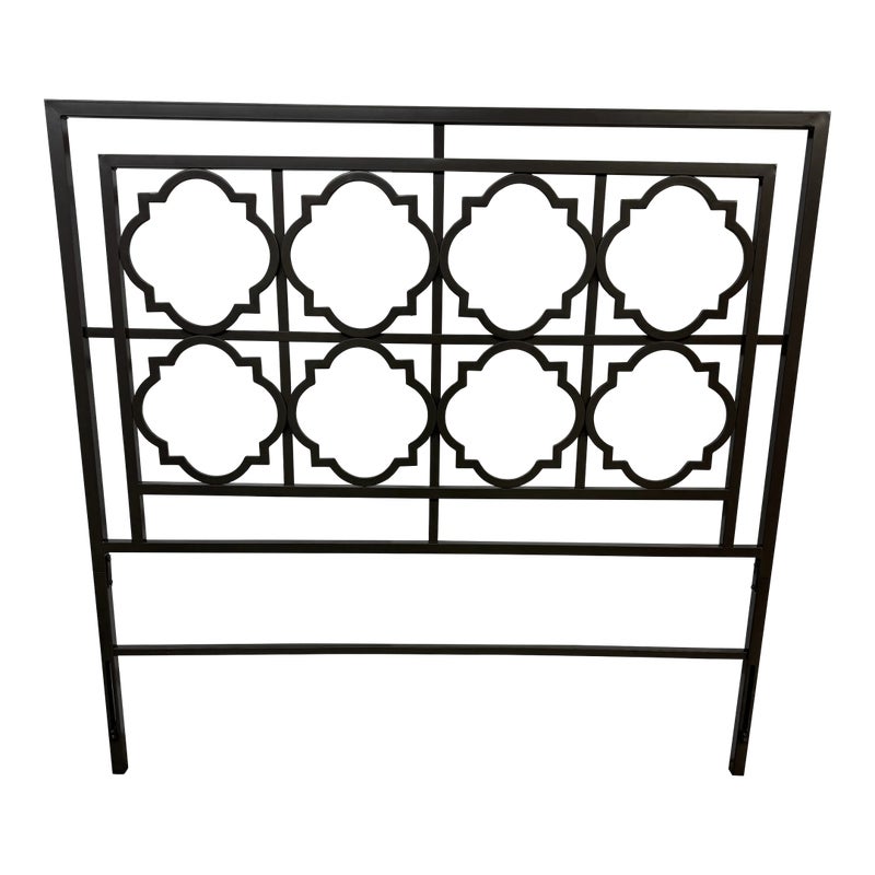 Design Plus Gallery presents a Queen Silva Headboard from Safavieh. The style gives reference to Italian antiques with a quatrefoil design that will give off a graphic design element in your space. Antiqued iron finish is bold against any backdrop. Height is adjustable. Condition is good for age and use.
