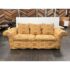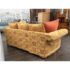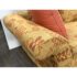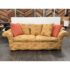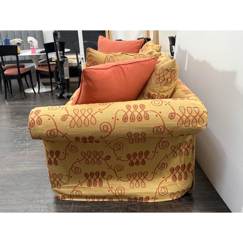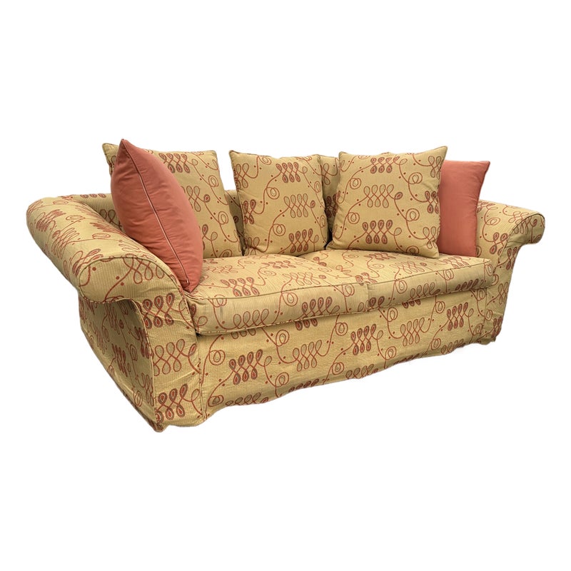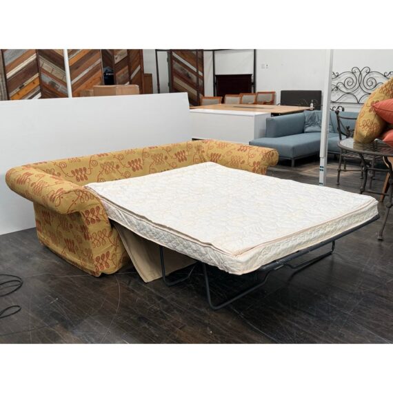 Design Plus Gallery presents a Queen Size Bespoke Slipcover Sleeper Sofa from Shabby Chic. This sleeper sofa has a golden yellow slipcover with an orange looping motif across the arms, base, seat cushions, and back cushions. Rolled arms, loose back pillows, and coordinating solid orange accent pillows give the piece a relaxed Shabby Chic character. The sofa opens to reveal a queen size pull-out mattress on a metal frame. The slipcover design adds texture and casual charm while keeping the patterned upholstery as the focal point. It is in good condition with visible stains and marking on white fabric frame, and minimal wear from usage.