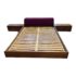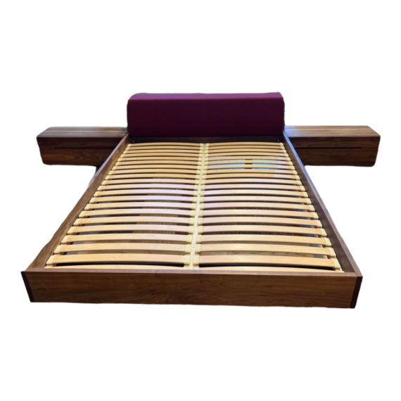 Design Plus Gallery presents a Queen Size Fusion Walnut Bedframe + Nightstands from Zeitram. The Fusion bed comes across as light and levitating. The slanted head board lends the bed a dynamic appearance. The one-piece burgundy upholstery has an ergonomic shape to lean on. The sophisticated details, such as the solid wood rear of the head board underline the bed’s high quality and turn it into a special piece of furniture in any room to be viewed from all sides and angles. The flat cubical bedside tables with its two drawers offers ample storage options near the bed. Its unobtrusive design is perfect next to the Fusion platform frame. All are in good condition with wear that is consistent with age + use, light scratches on nightstands and frame. Made in Germany.