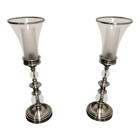 Design Plus Gallery presents a pair of glass and brushed Nickel finish table lamps by Quoizel. This crisp, industrial pair of table lamps are fashioned with alternating brushed metal and glass from top to bottom. Even the electrical cords are in a clear reflective wrapping down to the acrylic and metal plug itself.