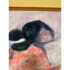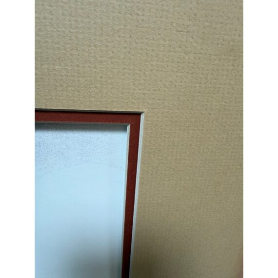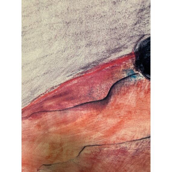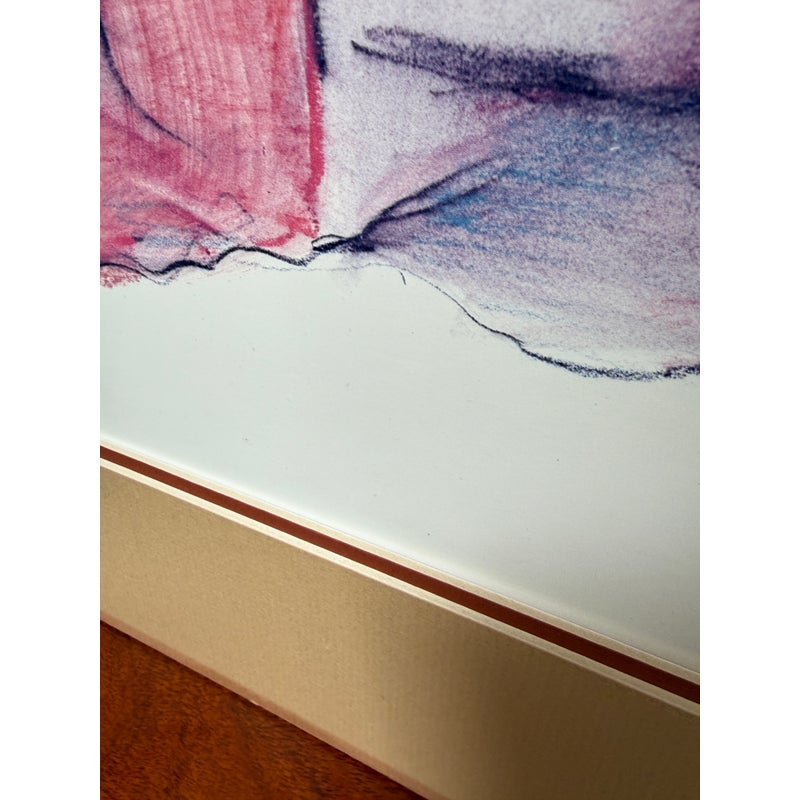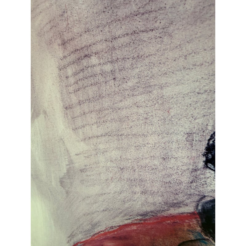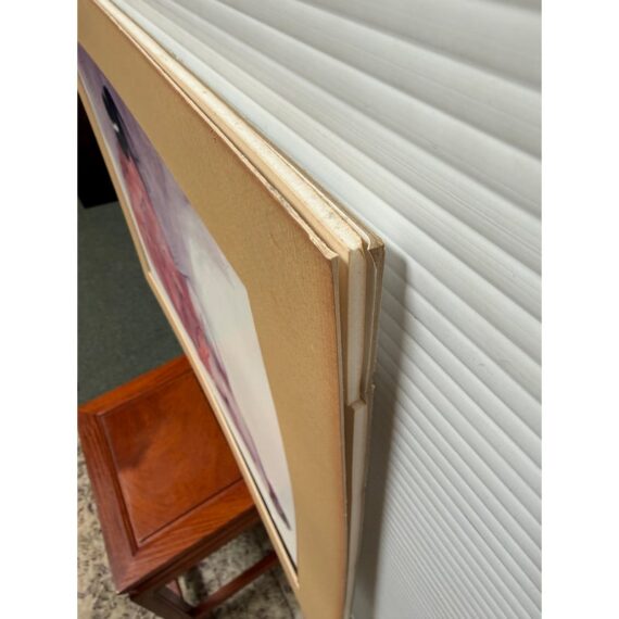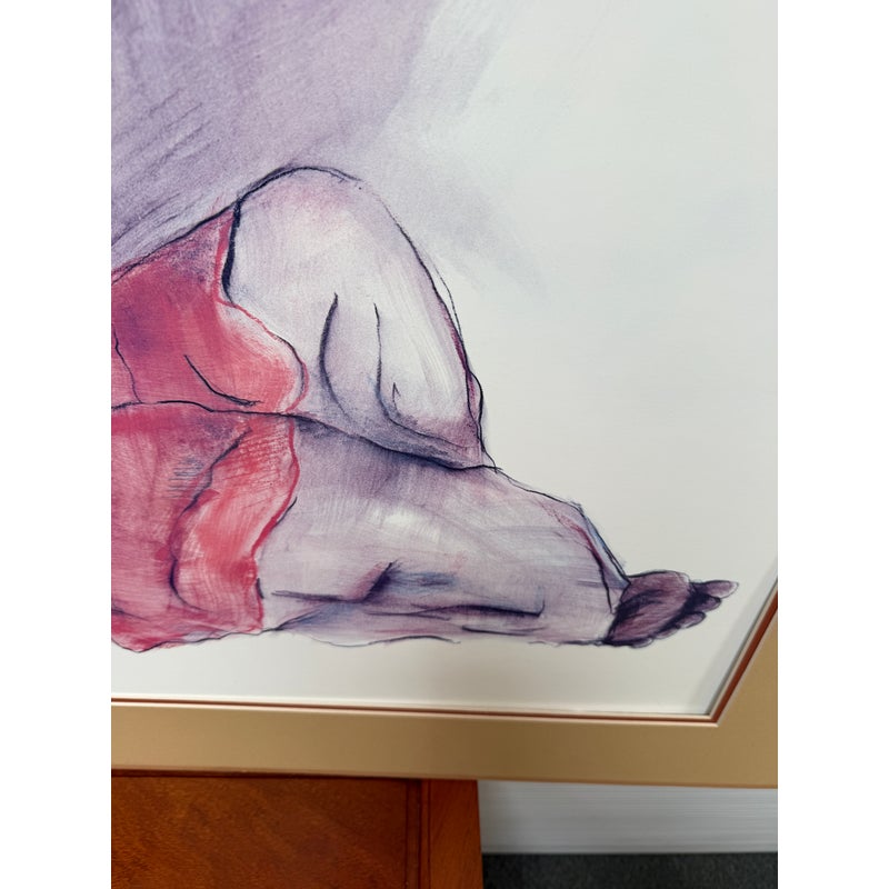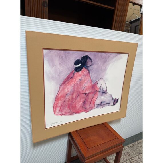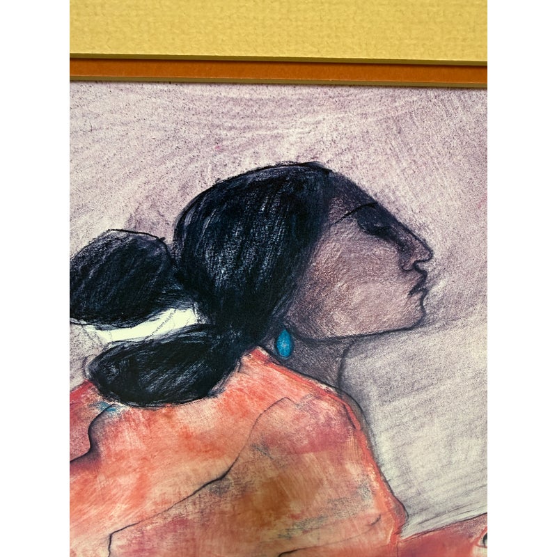 Design Plus Gallery presents an Original Artwork by R. C. Gorman. The painting is of a Native American woman seated on the floor with her head held upward and one knee held up while the other leg is long. the woman has dark hair half pulled up with a turquoise earring showing that contrasts her orange/red cloak. The background is bare and the artists signature and date, 1977 are on the lower left side. It has a wide, thick tan matte and is not in a frame. Overall fair condition with some bend in the matte.