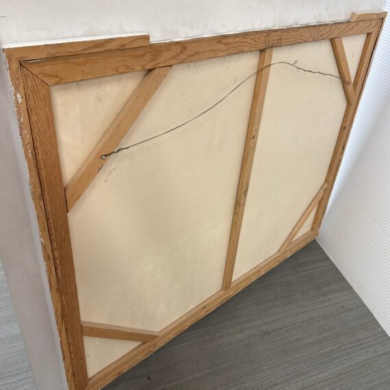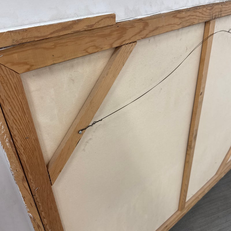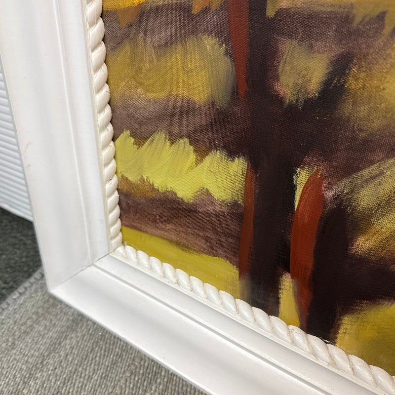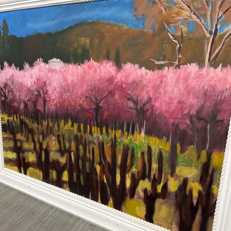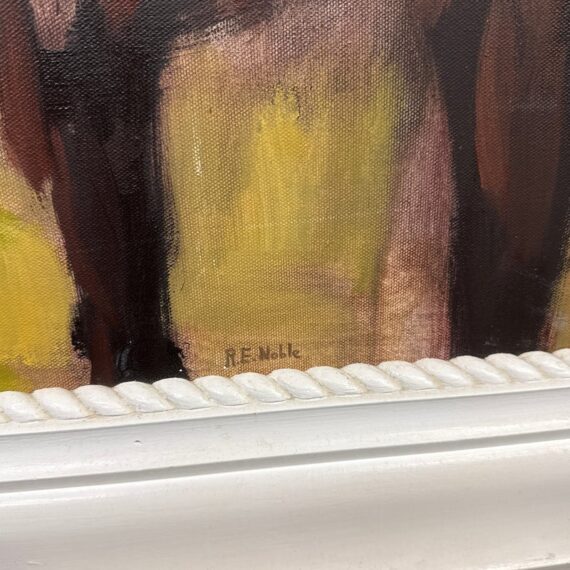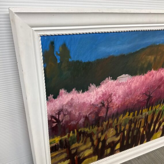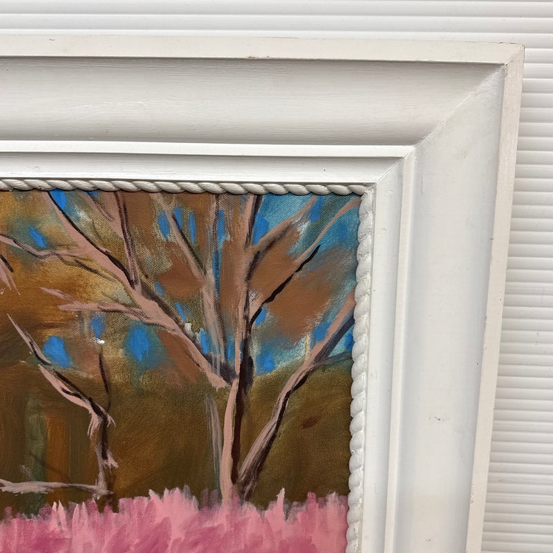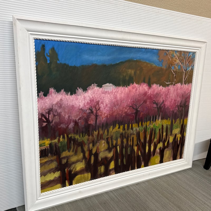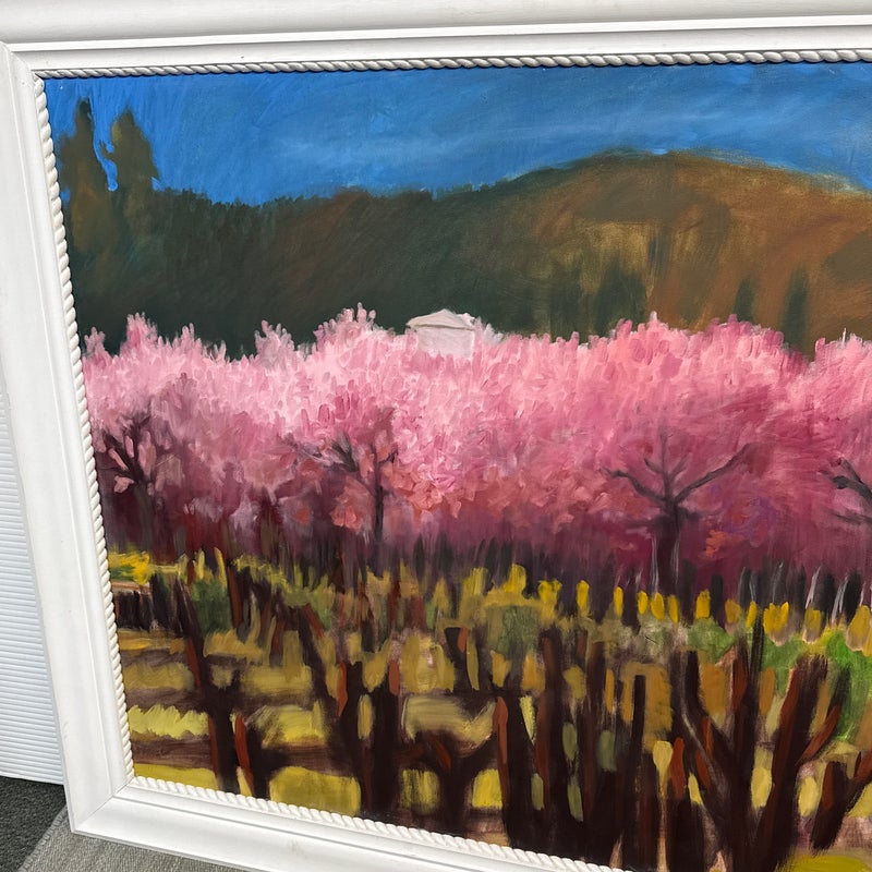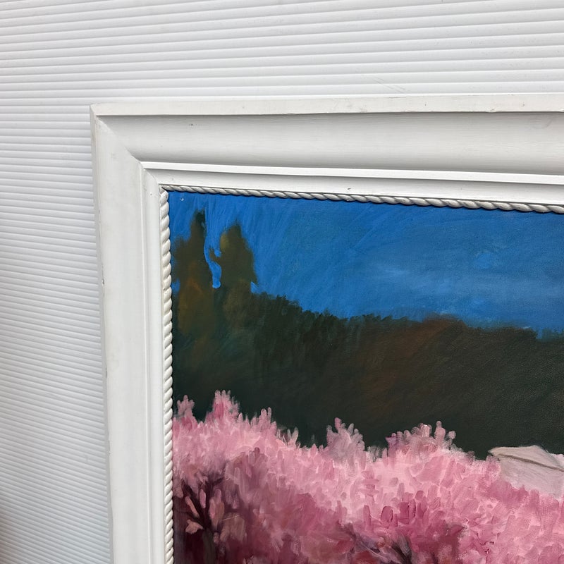 Design Plus Gallery presents an Original Landscape of Cherry Blossoms Signed by R. E. Noble. The painting has a great depth of color with layers upon layers of varying parameters of imagery. The most brilliant is the line up of fully engorged Cherry Blossom trees, side by side, making up a perfect canopy between the ground and the bright blue sky. The painting is framed in a solid white wood frame with the artists signature on the lower right side. It is in good condition with minimal visible wear for its usage.