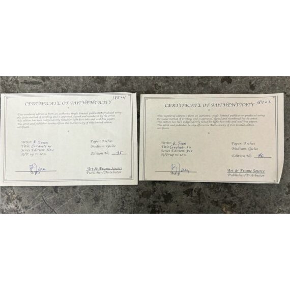Design Plus Gallery presents a Set of Two Limited Edition Giclée Prints Signed by Artist R. Jones. The duo are from Jones’s Cordial Series; Cordial III & Cordial IV. They are identically framed and signed in pencil + numbered. Cordial III is 46 of 500 and Cordial IV is 45 of 500. They both are in good condition with their certificates found on the backside of the frame.
