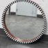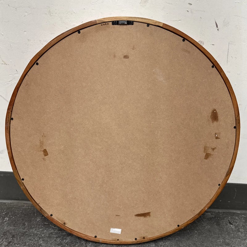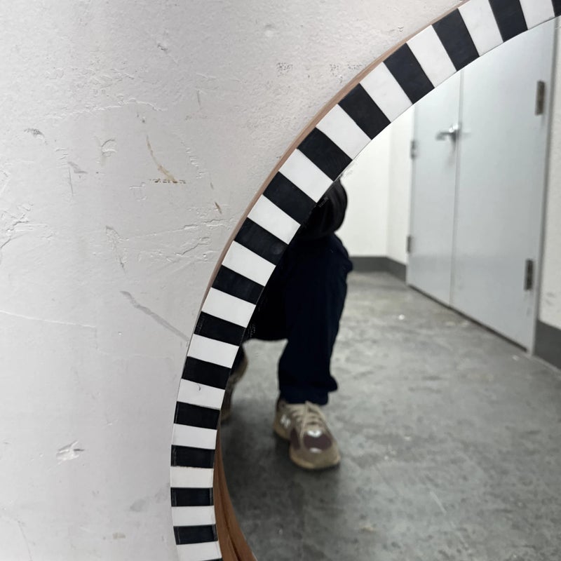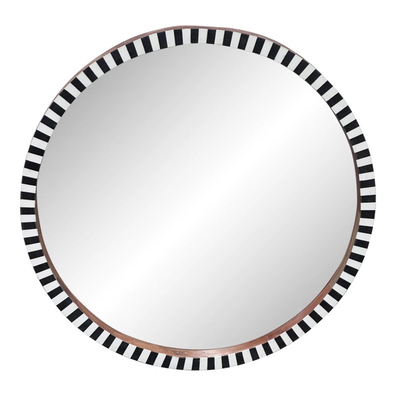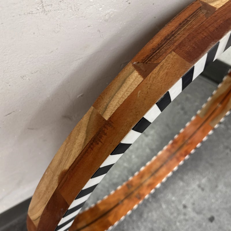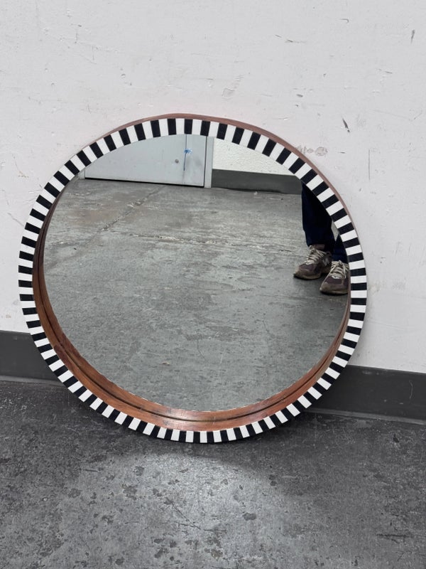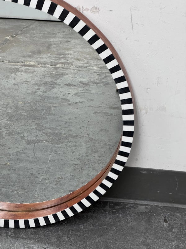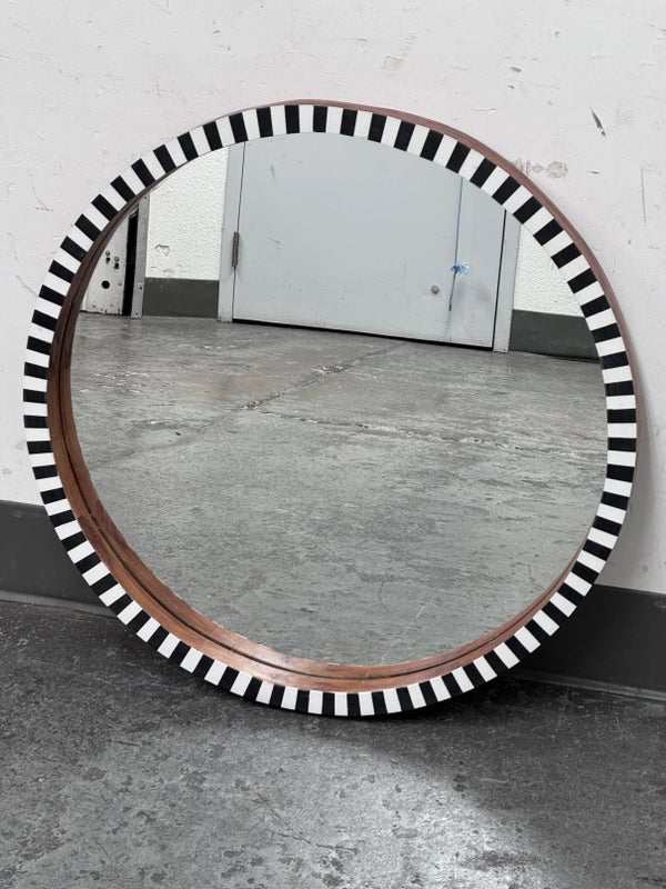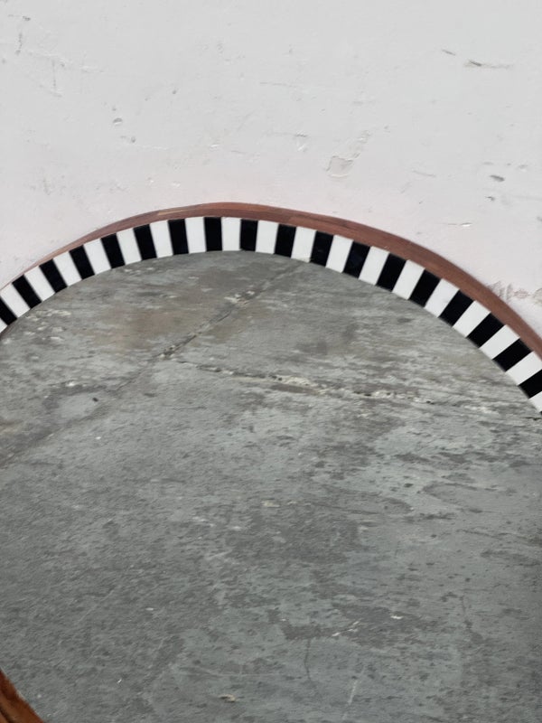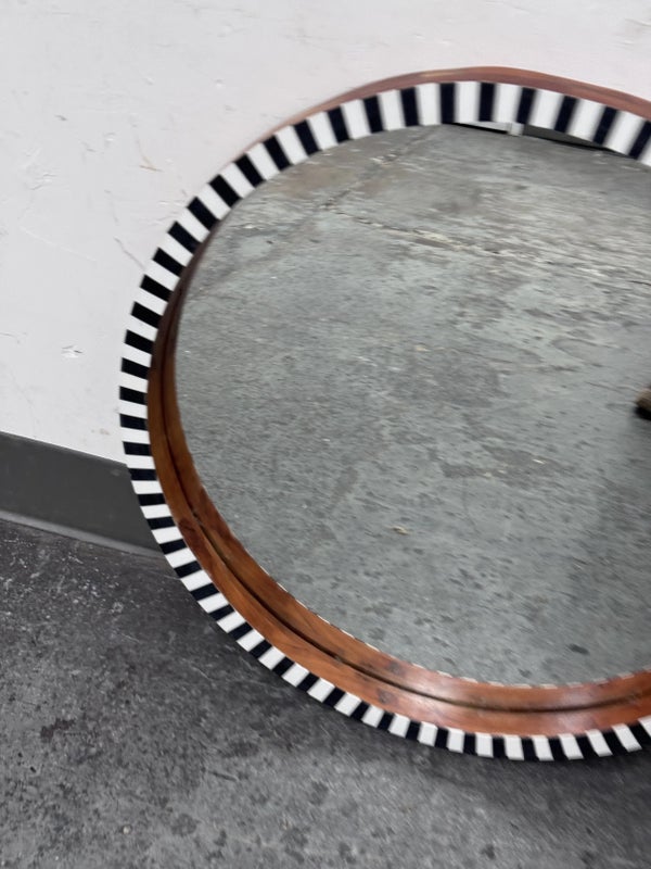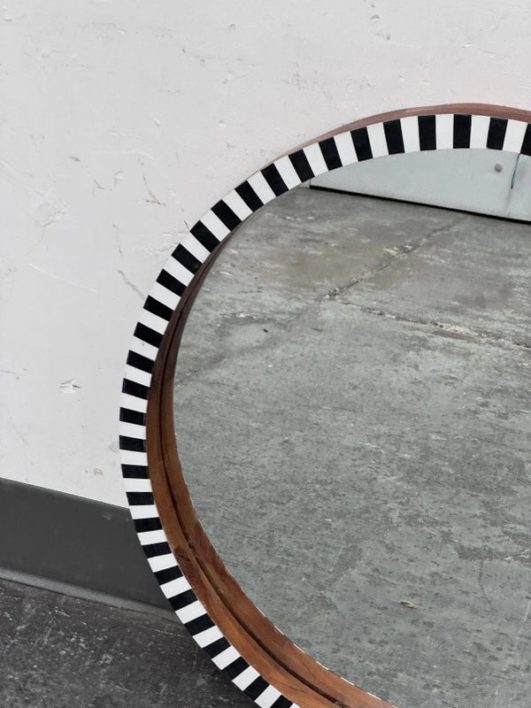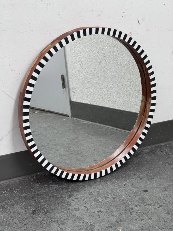 Design Plus Gallery presents a Painted Black + White Wall Mirror from R.K. Exports. The wooden frame is made of walnut solids and you can see their color on the inner lip of the frame and on the outer rim. The front of the mirror has alternating black and white rectangles going around the entire surface. Is in Is in good condition for its age with minimal surface wear that is consistent with use.
