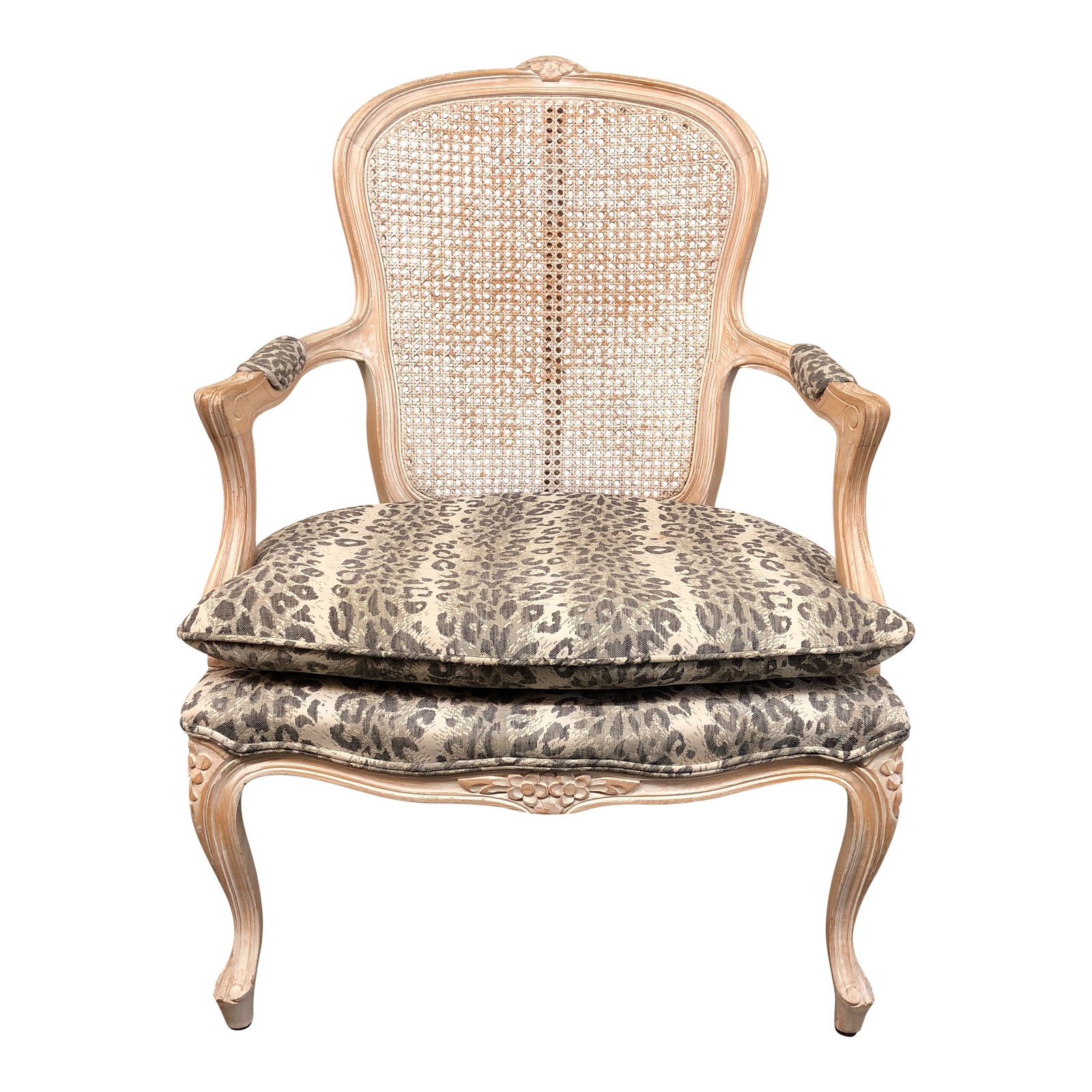 Design Plus Gallery presents classical and playful Rattan Bergere chair upholstered in a light cheetah pattern with strong and graceful cabriole legs. Includes Cheetah print arm rests and removable cushion. From Rafael Homes of San Francisco, CA. Arm Height: 25 inches. Seat Height: 17.5 inches.