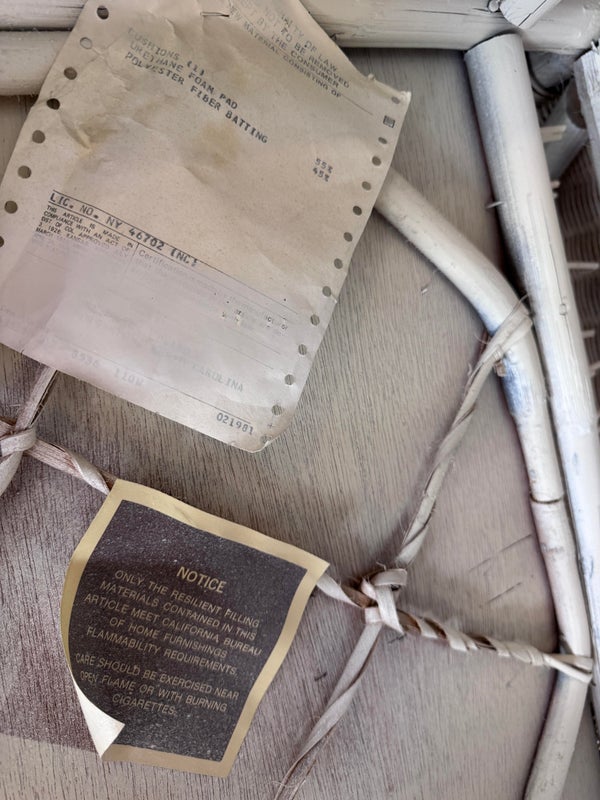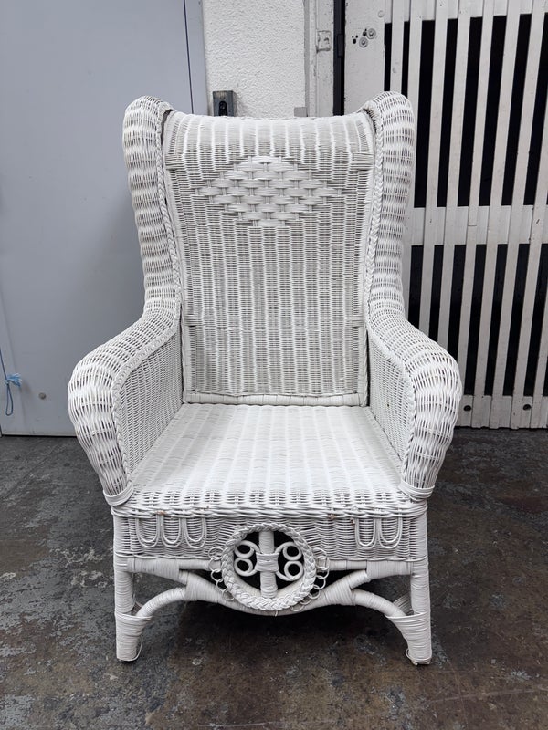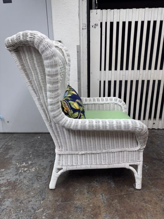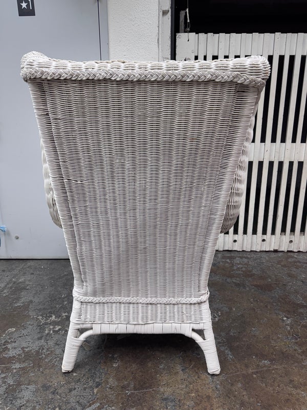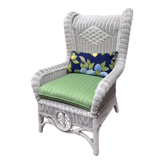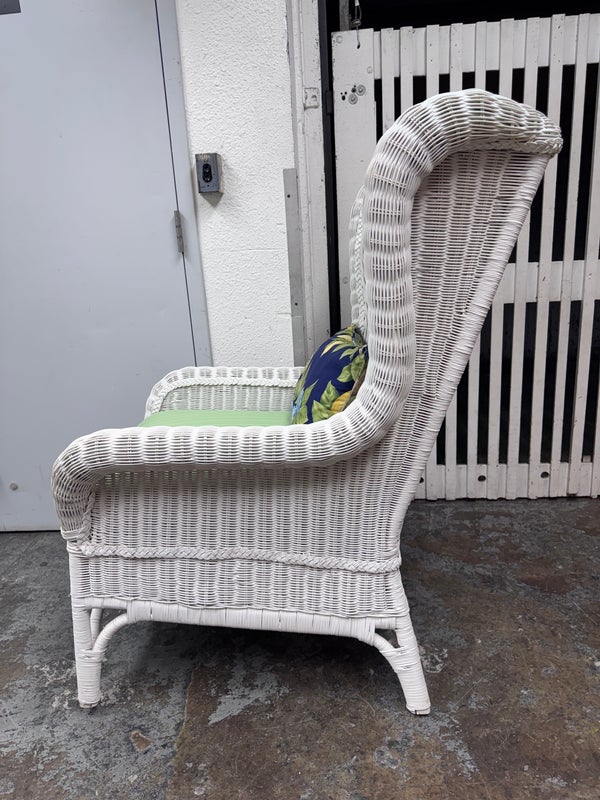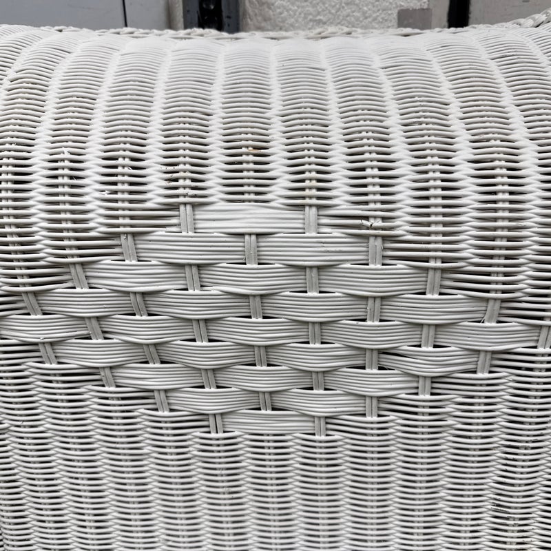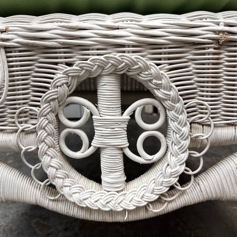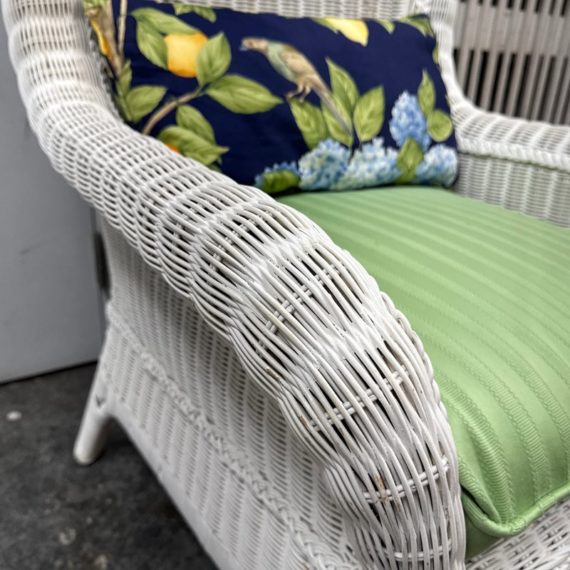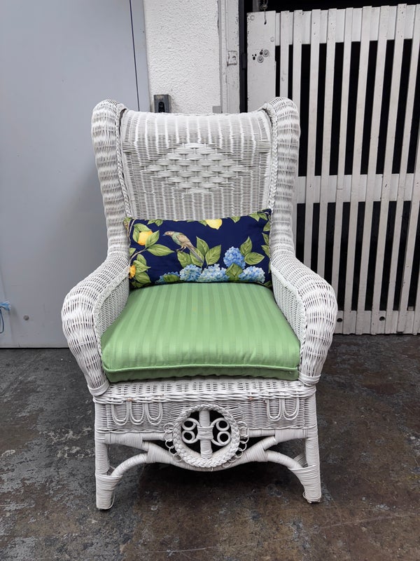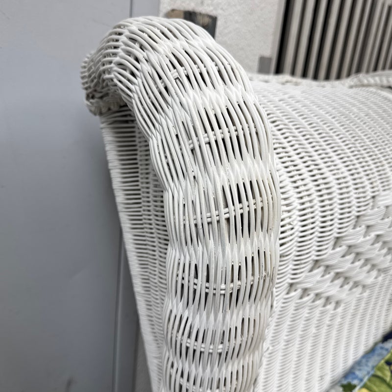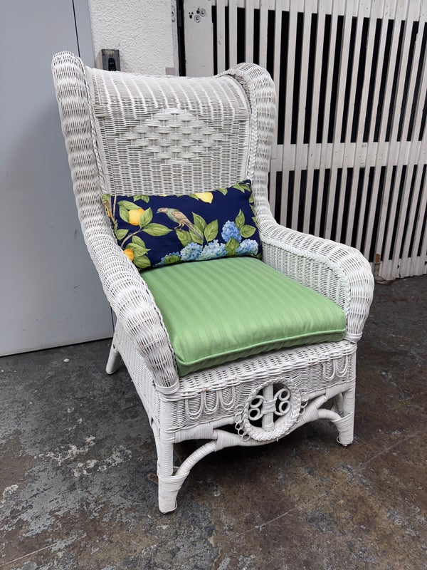 Design Plus Gallery presents a White Woven Wicker Chair from Ralph Lauren Home. Likely of vintage age, this romantic in/outdoor chair gives that Southern Hospitality Shabby Chic feel to it with its feminine details. Comes with accent lumbar pillow and seat cushion in coordinating colors. There are areas of use that are considered consistent with its age + use. No brand label attached.