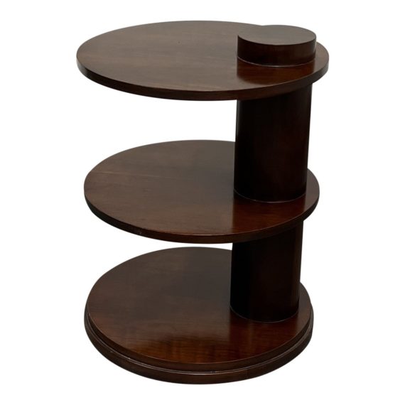 Design Plus Gallery presents a Ralph Lauren Mercer Street End Table. Tiered table showcases a dark french walnut finish. Sculptural form is mad of walnut solids and french walnut veneer. There is visible wear through out, side table is in good condition.