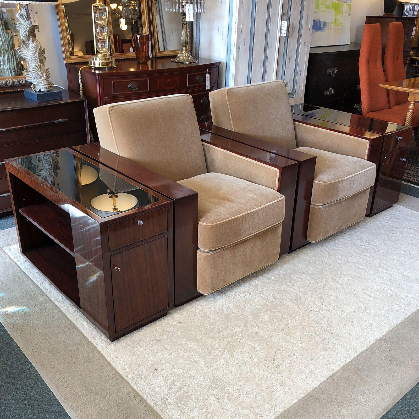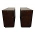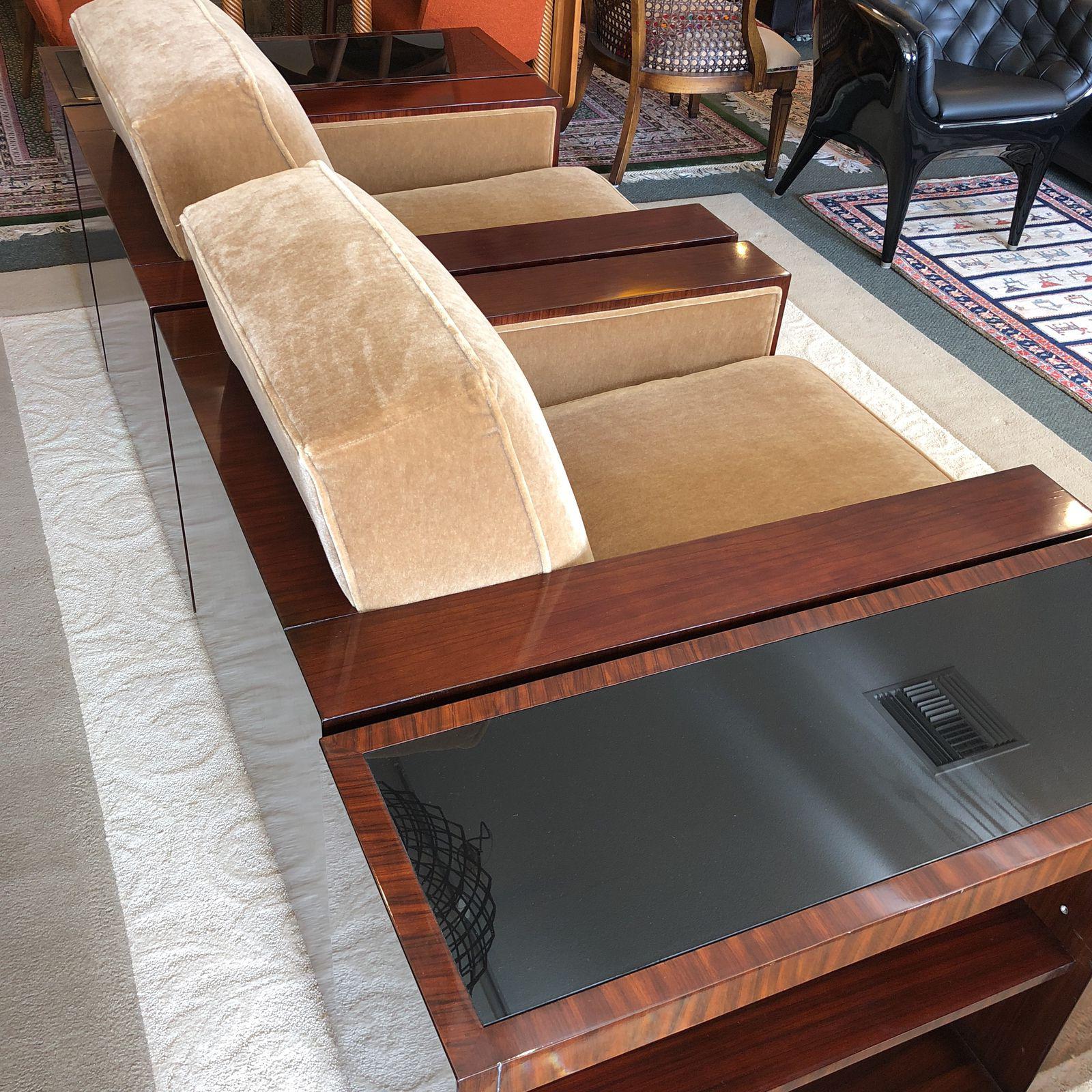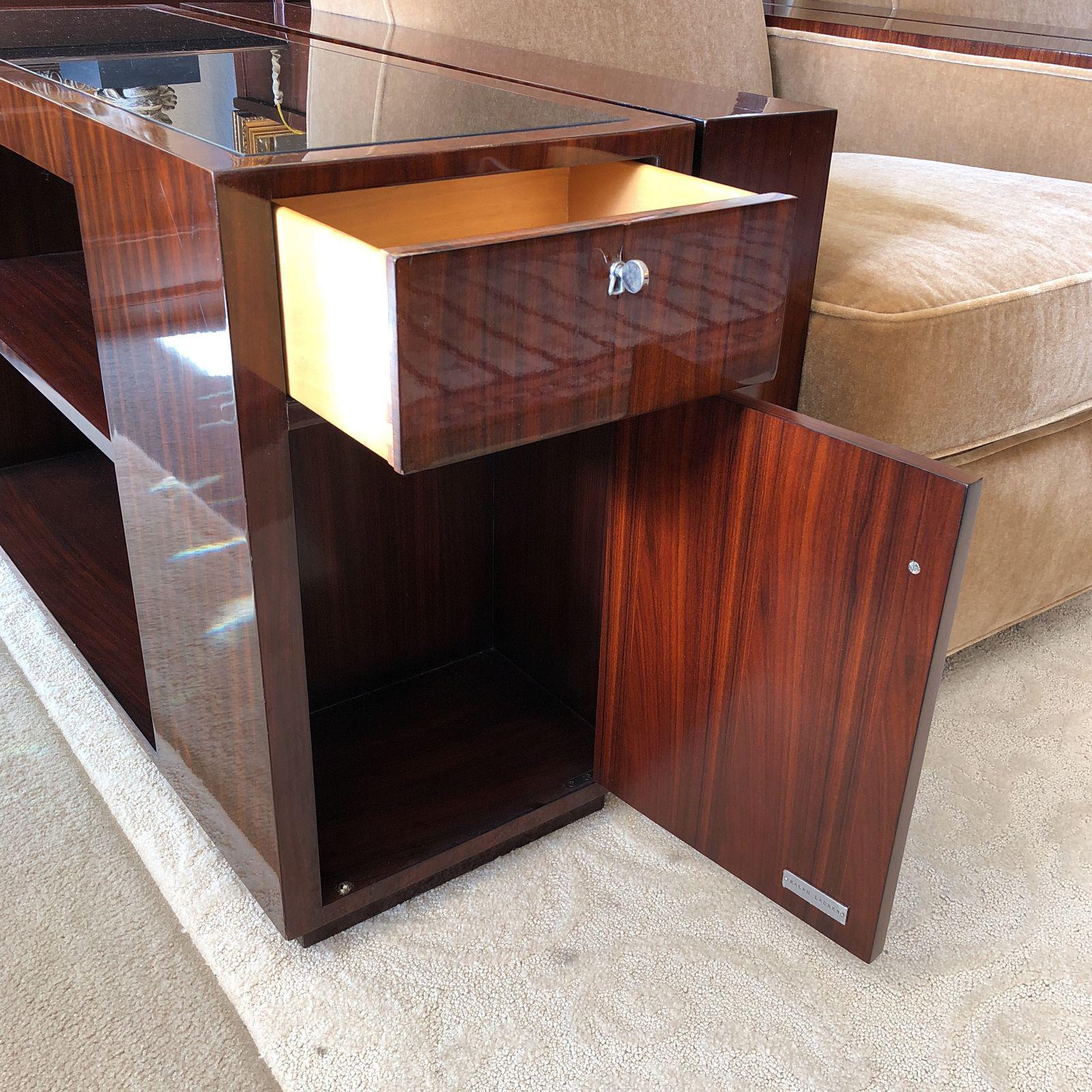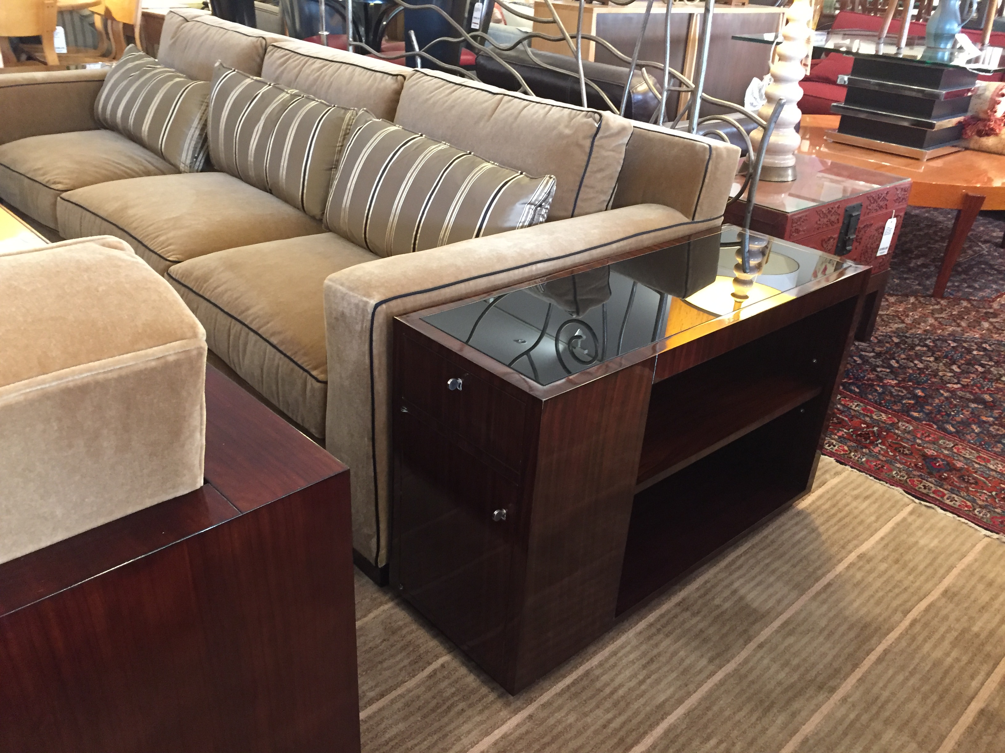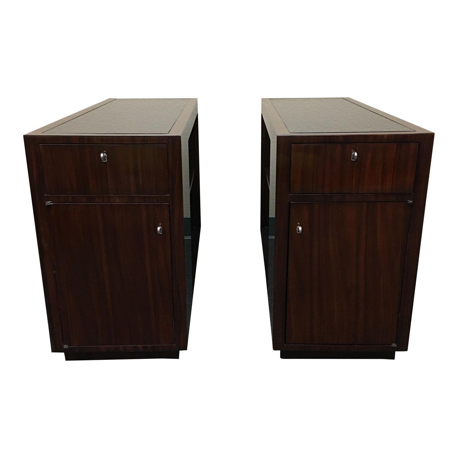 Design Plus Consignment Gallery presents an elegant pair of side tables from Ralph Lauren. The Modern Metropolis silhouette is elegant with simple lines and luxurious materials, providing abundant storage. The dark, rich finish allows the exotic wood grain to show through. The tops are inset with black glass for protection.