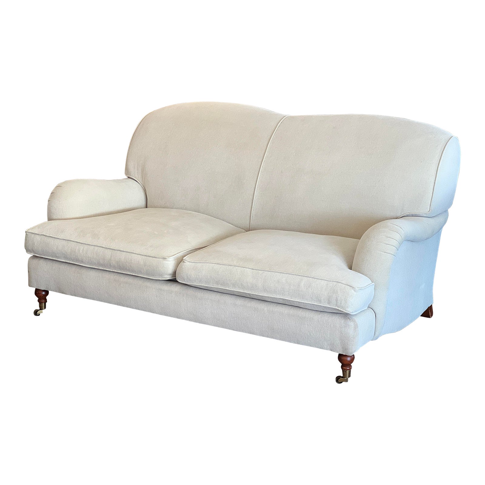 Design Plus Gallery presents a Somerville Loveseat by Henredon for Ralph Lauren. Classic padded canted back and pleated rolled arms create the classic English silhouette. A tight back with premium foam and generous layers of fiber batting along with seat cushions featuring enclosed springs, create inviting comfort. Turned wood legs finished with hand-cast brass front-facing casters. Made in USA. Light evidence of wear (spills, small holes) on cushions; condition consistent with age and use.