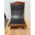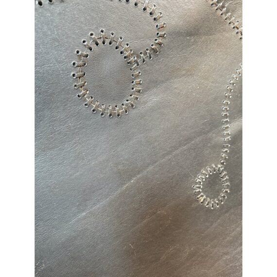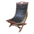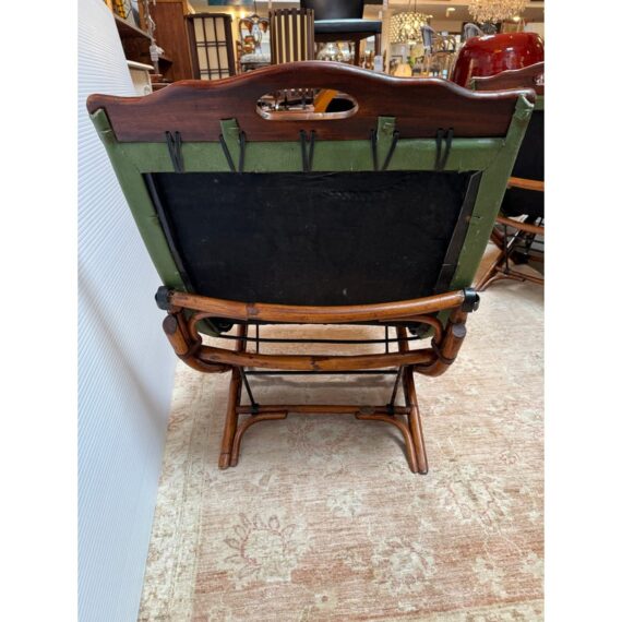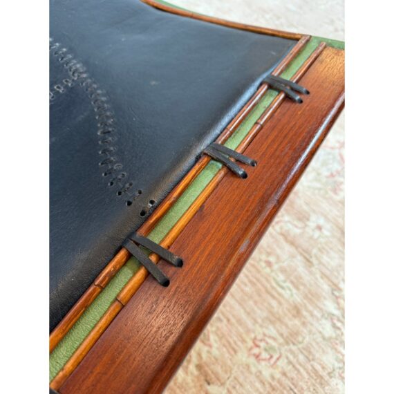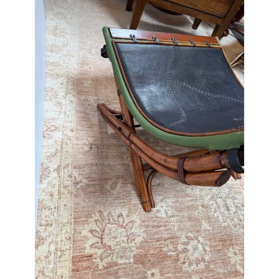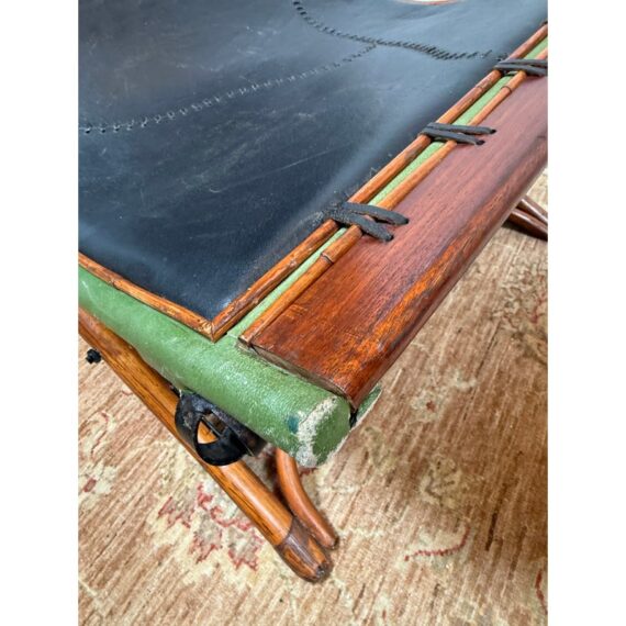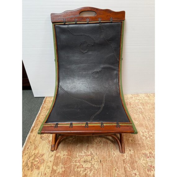 Design Plus Gallery presents a Custom Designed Lounge Chair by Ramon Castellano for Kalma, Spain. The unique chair from 1980 has a frame that is handcrafted from bamboo with dyed leather-wrapped wood and iron. The black cushioned sling is inset with saddle-stitched leather in a meandering black pattern then fastened to the frame with leather throngs. Intriguing from every angle, the iron braces unlatch to allow the chair to collapse. Chair is in good condition for age and use, with small scuffs on frame and leather.