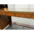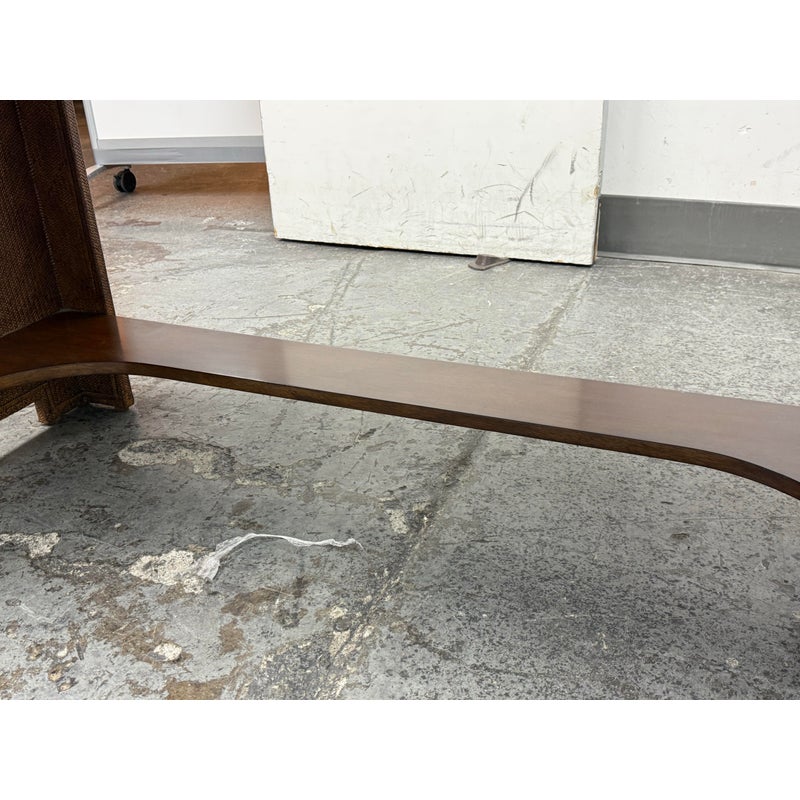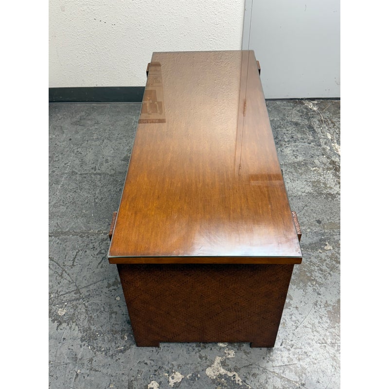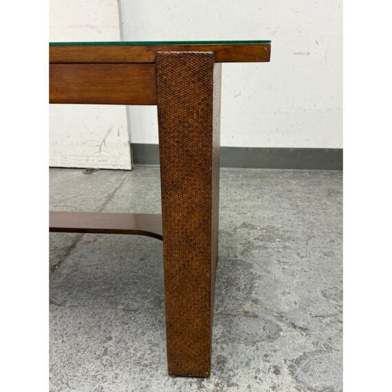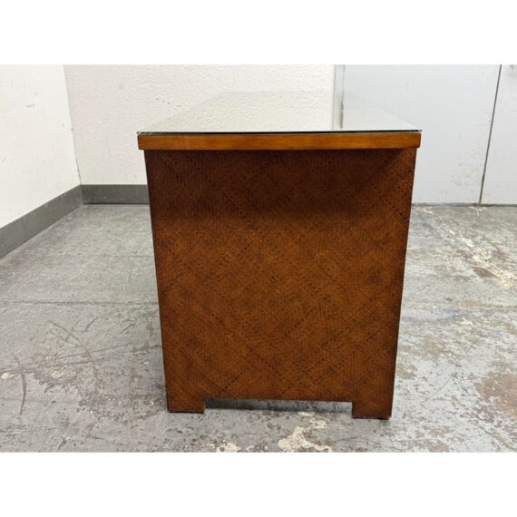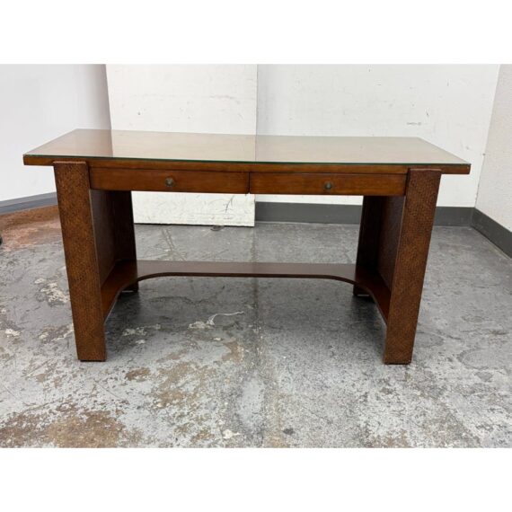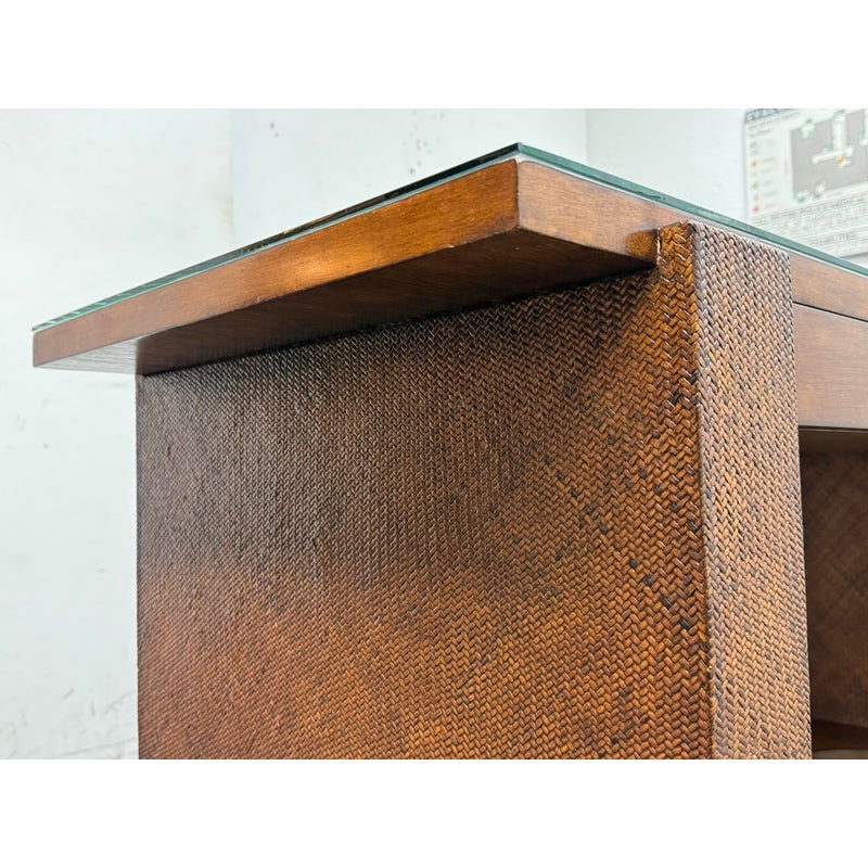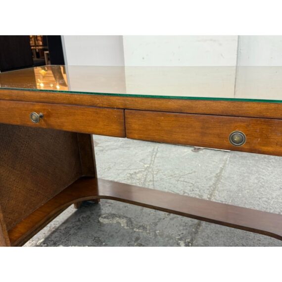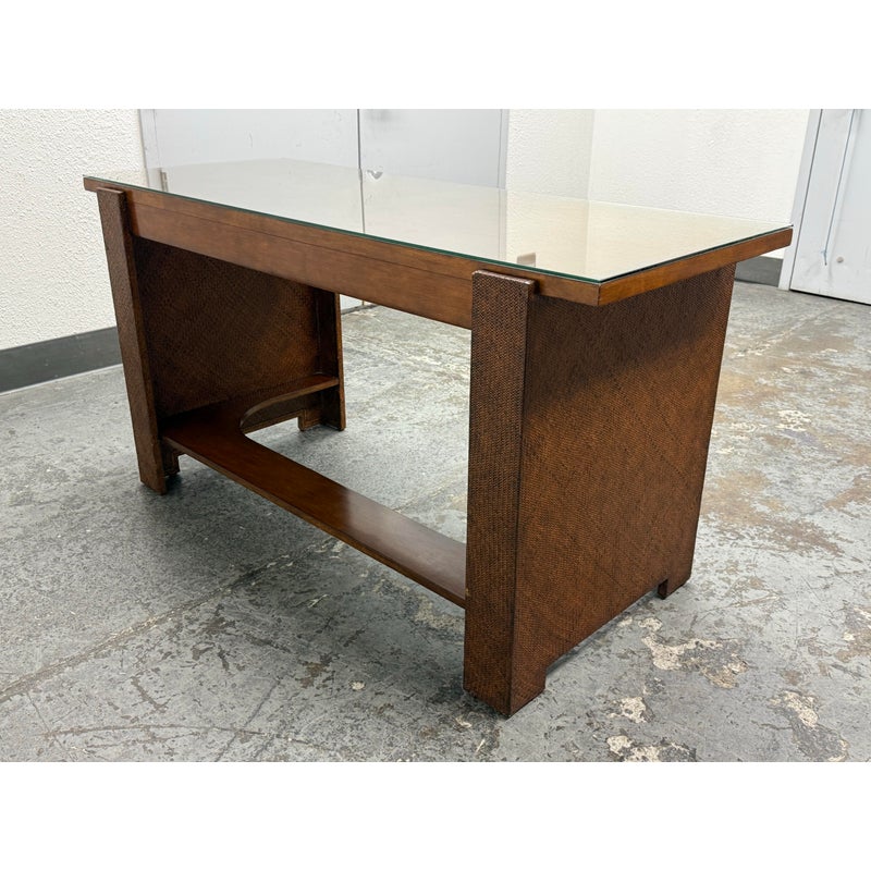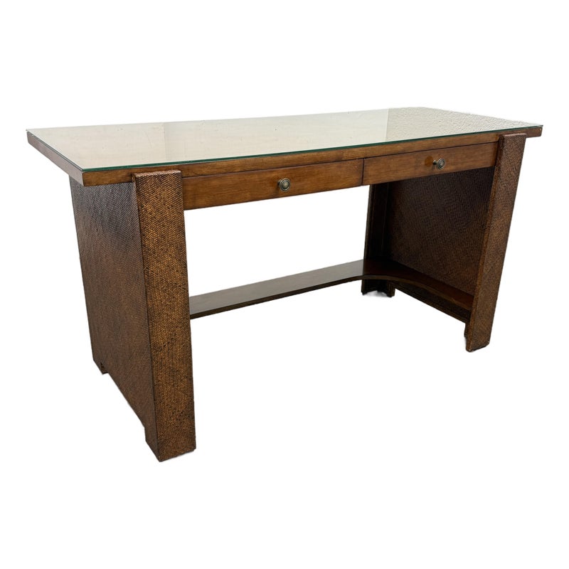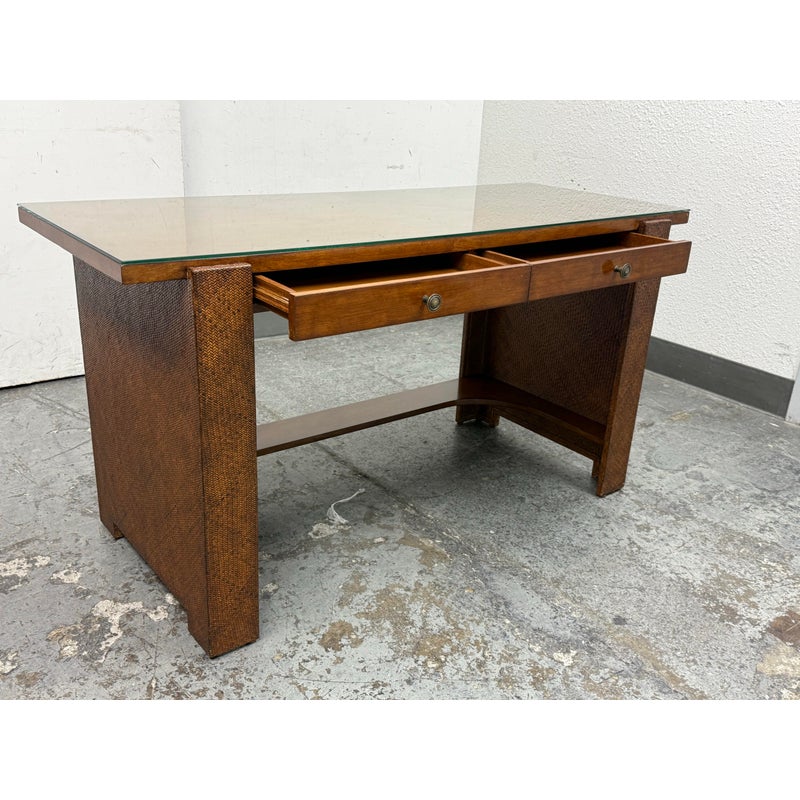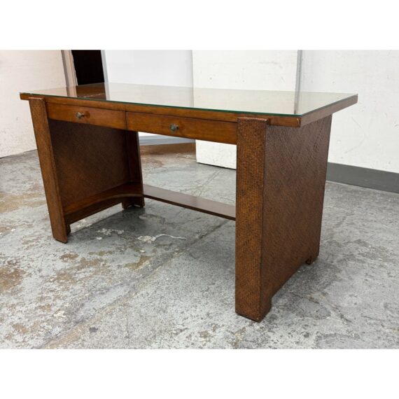 Design Plus Gallery presents a Glass Topped Writing Desk with Rattan Frame. The desk is fantastic with a warm auburn glow used in tropical settings around the world. The side of the desk are covered in woven rattan making the piece texturized and visually interesting. There is a foot guard at the base to rest on and a glass surface to protect the natural wood from exposure to various elements, such as scuffs and sun. There are two drawers that are ideal for storing handy items when writing. It is in good condition for its usage.