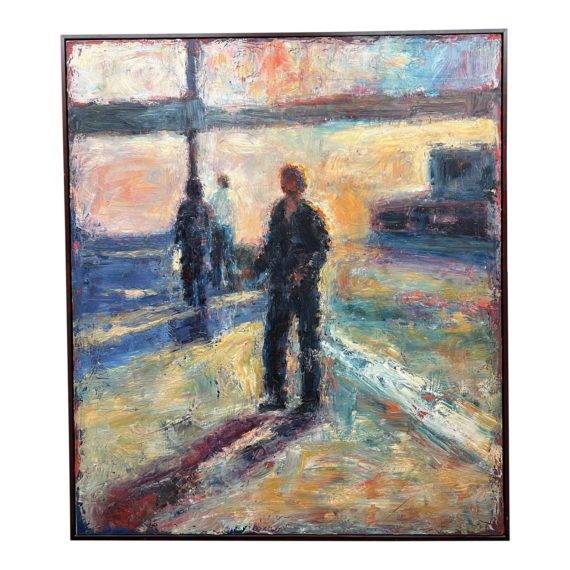 Design Plus Gallery presents “429” an original painting by Ray Jackson, 2003. A member of the the Outsiders, Ray Jackson’s art stand out. Instead of capturing California’s beautiful coastal and mountain scenes, he often paints urban scenes populated by people. Here, framed and in large scale, is a quiet cityscape in rich colors and brushwork. Little evidence of wear.