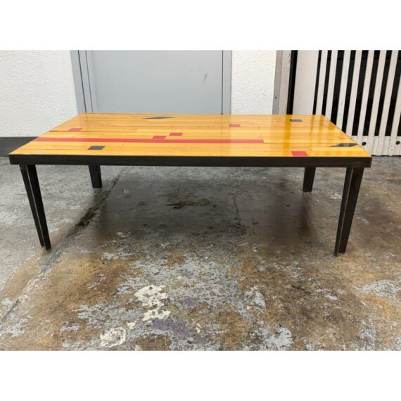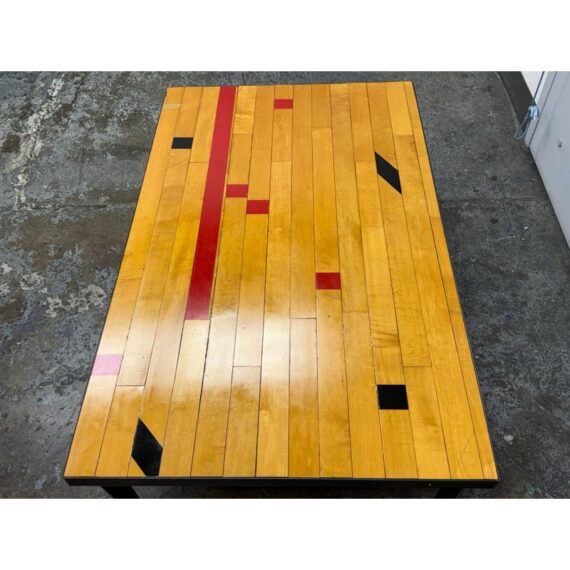 Design Plus Gallery presents a Gym Floor that is Refurbished into a Coffee Table. A collectors dream and a vintage lovers heart are meant for this table. Or maybe you are a huge fan and will feel like your court side rather than in your living room when the Warriors are on. Any way you look at it the top of this table is cool. It is inset steel legs for durability. Overall it is in as good of condition as when it was taken from the floor.