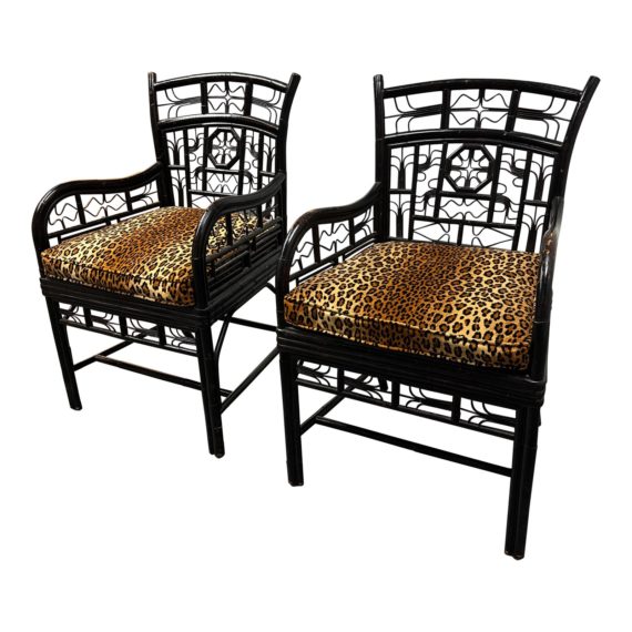 Design Plus Gallery presents a Pair of Indochine Mandarin Arm Chairs by Red Egg. S stunning pair of armchairs that exude timeless elegance and style. The chairs are made from bent wood in a black distress finish, giving them a unique and sophisticated look. These chairs are versatile and can be used in various spaces such as the dining room, living room, or bedroom. The cane seat is hand woven, adding a touch of craftsmanship and durability to the chairs. Additionally, the chairs come with cheetah print removable cushions, adding a fun and playful element to the overall design. Whether used as statement pieces or for functional seating, chairs are sure to bring a touch of luxury and comfort to any space. In good condition, with minimal wear from usage and age. Handcrafted in the Philippines and finished in North Caroline, USA.