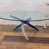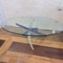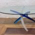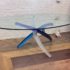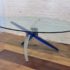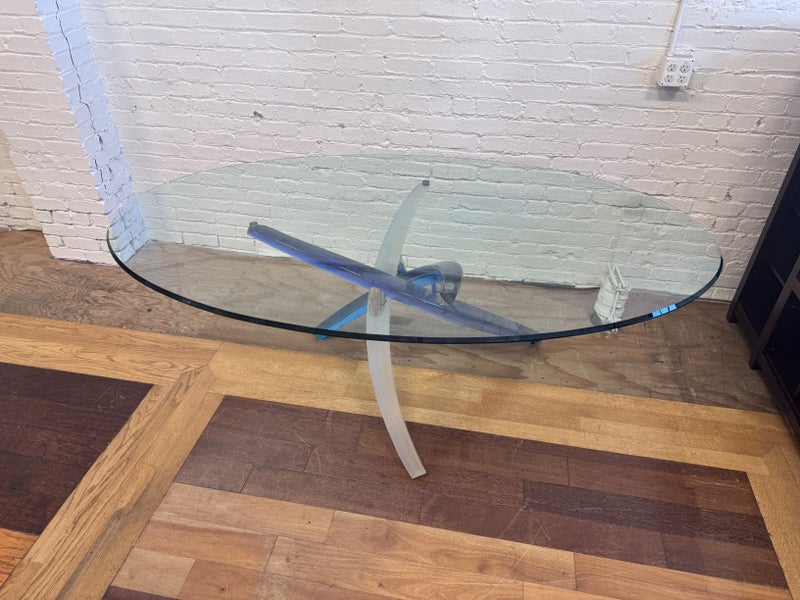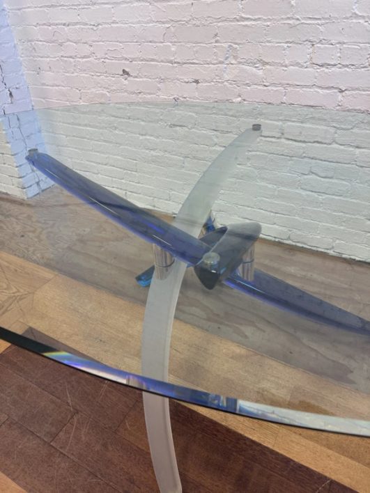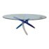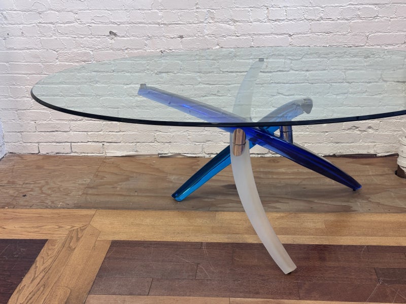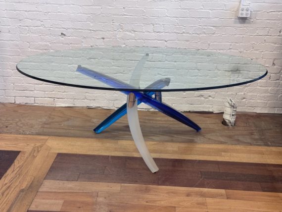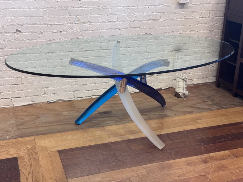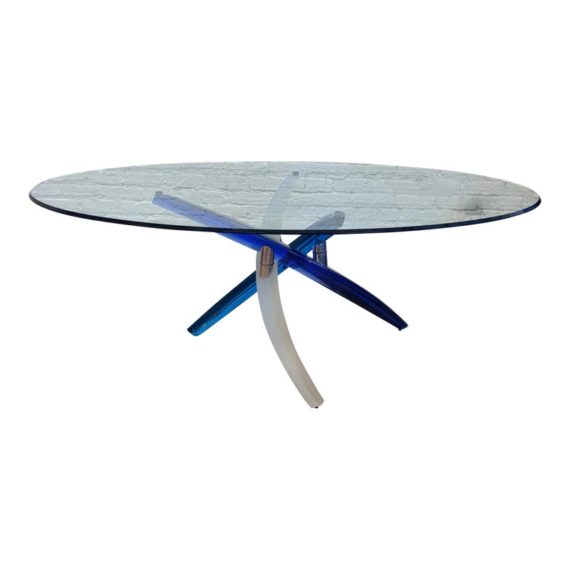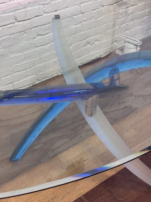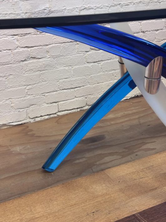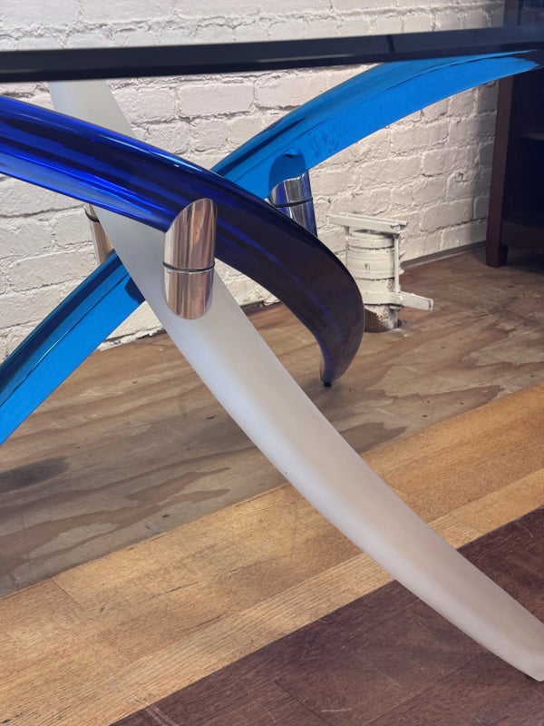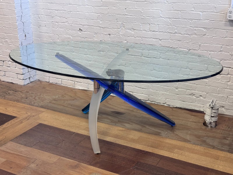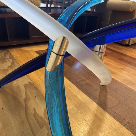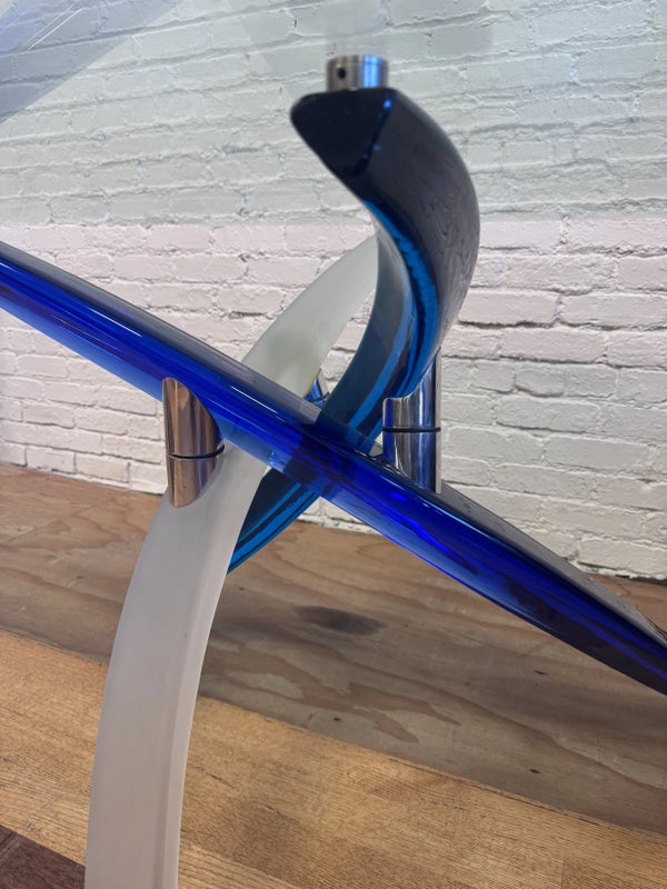 Design Plus Gallery presents the Fili D’erba Table by Reflex Angelo. Designed by Tulczinsky, the Fili D’erba Table base is made up of three elemental colors in Murano glass; teal, white and cobalt blue all wrapping around each other to assume a pedestal base. Oval glass top is 15 mm thick with 45° bevel. Small chip on edge of glass and one metal connection has been expertly glued. Is in Is in good condition for its age with minimal surface wear that is consistent with use. Made in Italy.