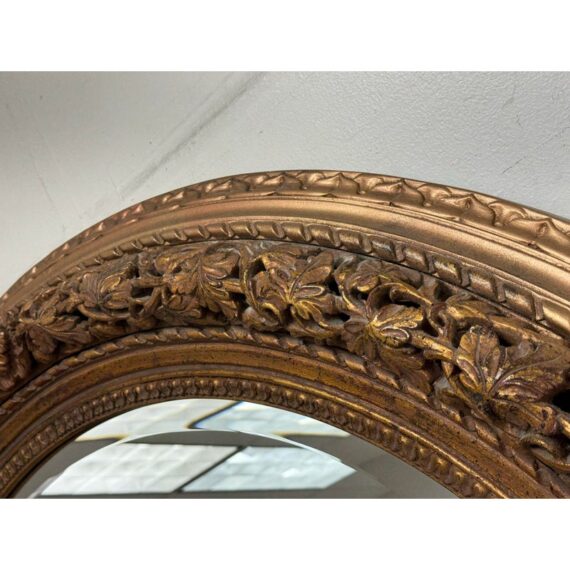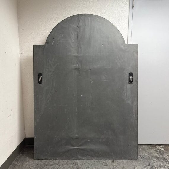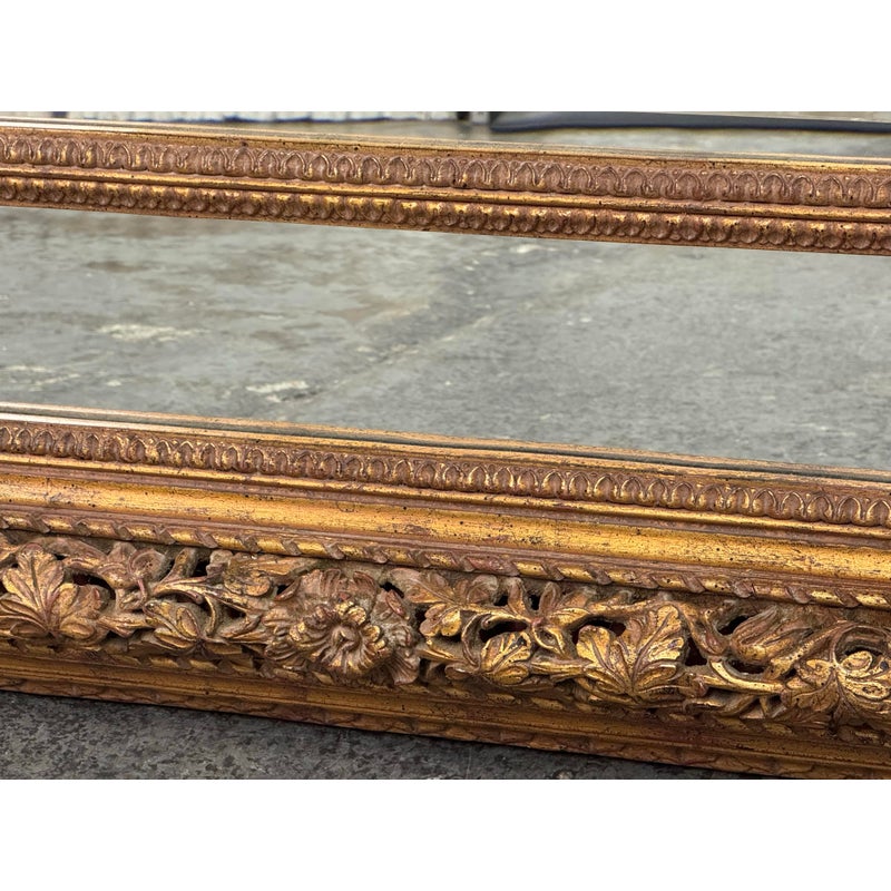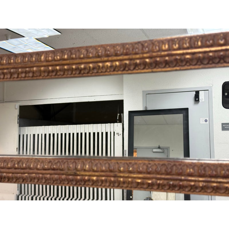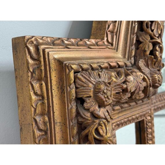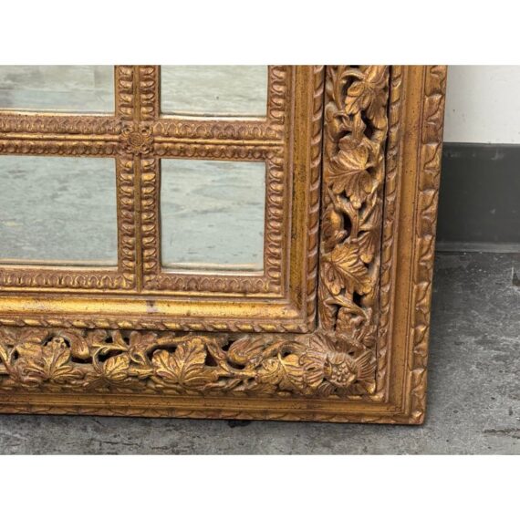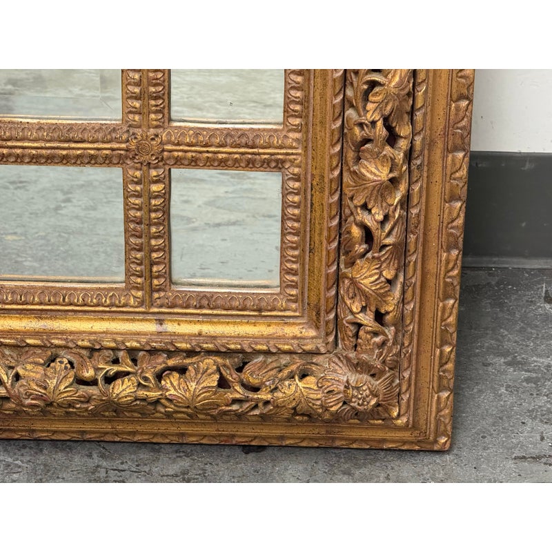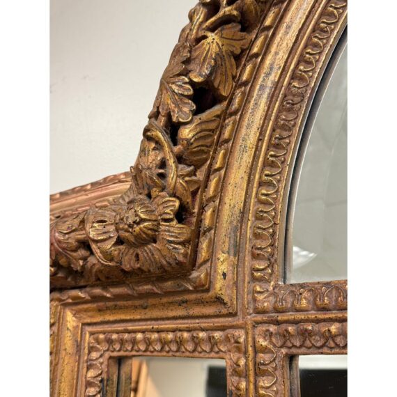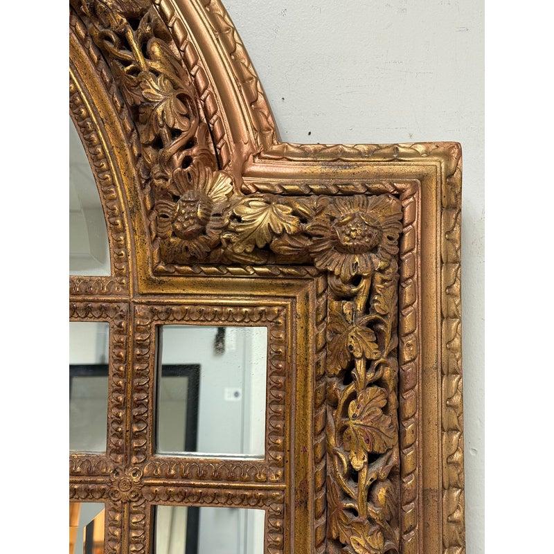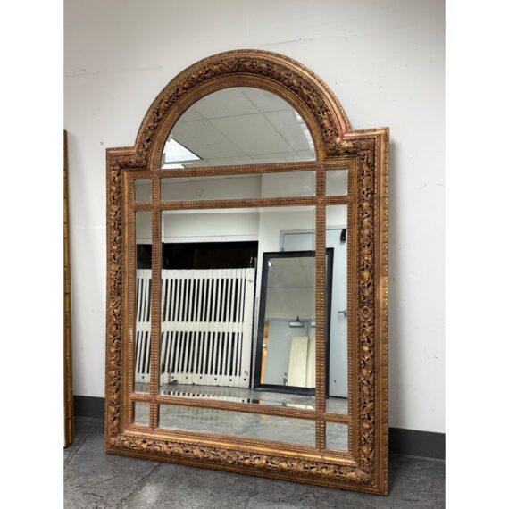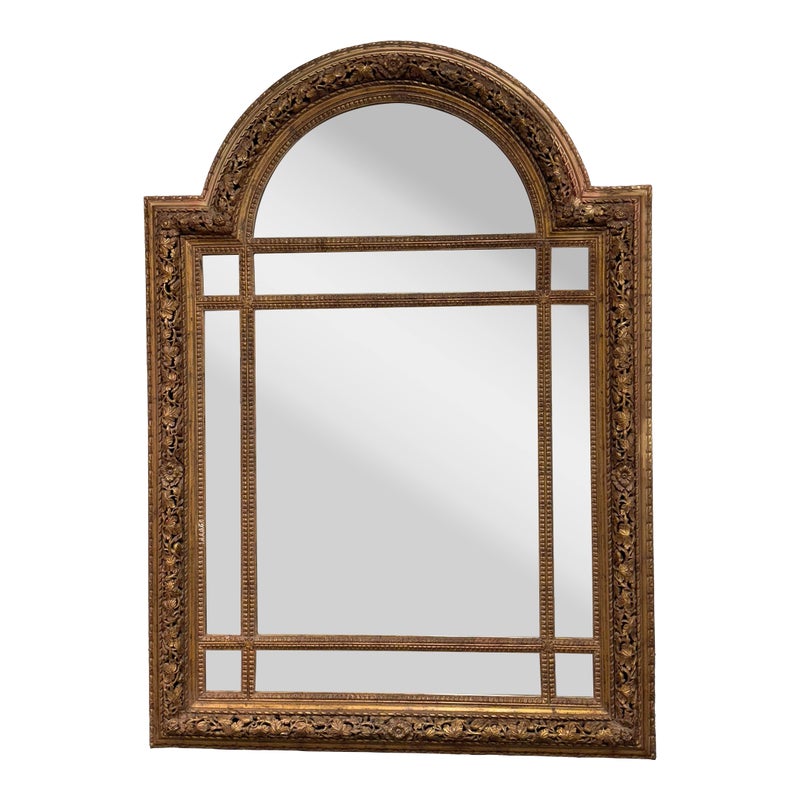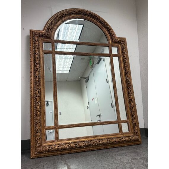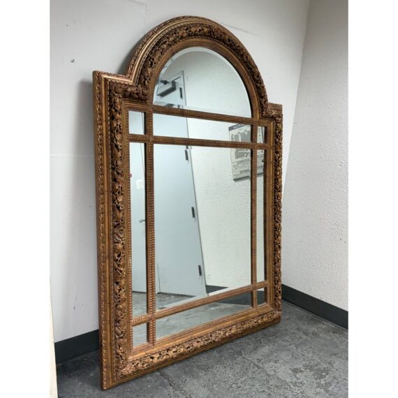 Design Plus Gallery present a Large Régence Style Mirror. The mirror commands attention with its grand scale and exquisite craftsmanship. Rising dramatically, the mirror features an arched top that lends a sense of graceful elegance to any space. The sturdy frame, built with a panel design, exudes the symmetry and ornate refinement characteristic of early 18th-century French interiors. Carved florals and botanical motifs adorn the wood, their intricate details evoking natural beauty and skilled artistry. Finished in a rich, dark rustic gold, the mirror radiates warmth while highlighting the depth of the carving. Suitable for use as a statement wall mirror or as a leaning floor mirror, this piece brings historic opulence, sophistication, and timeless appeal to both traditional and transitional decors. In good condition, visible and minimal wear from usage.