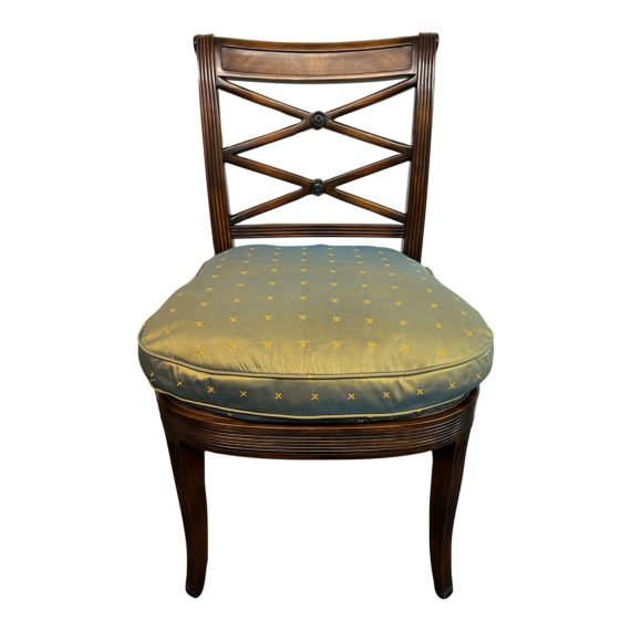Design Plus Gallery presents the Regency Style Cane Seat Chair + Satin Cushion. Features a walnut finish. A loose satin cushion is embroidered with flower studs. The chair’s back has a crossed pattern, and features round wood accents in a darker finish. Purchased in 2009 from Flegels Furniture Store. Minor wear from use; chair is in good condition.