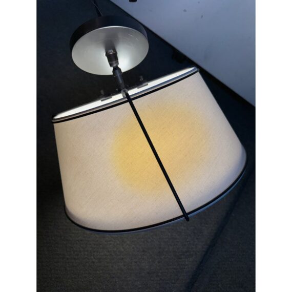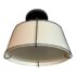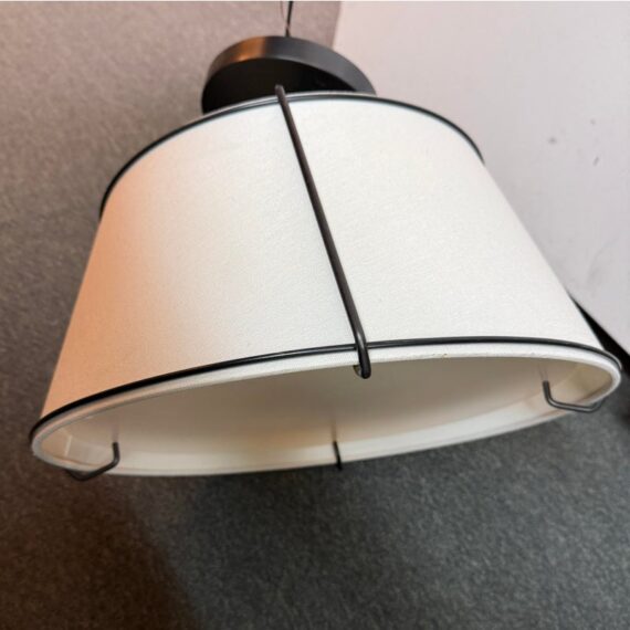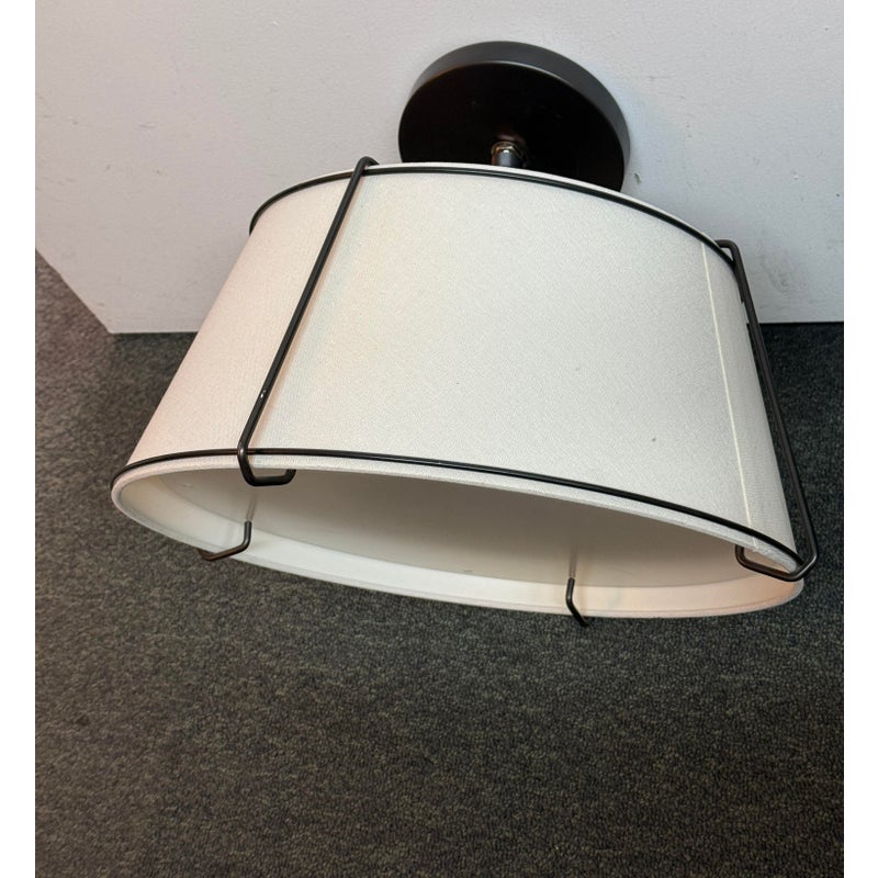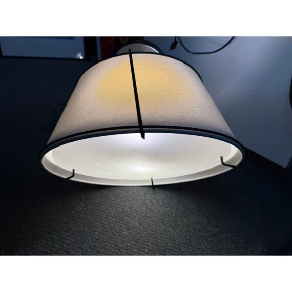 Design Plus Gallery presents a Conical Flush Mount Fixture from Rejuvenation. Lofty lines and linen shade adds a casual, breezy note, balancing its size and making this light an ideal option for ambient lighting in any room. There is a diffusion plate on bottom of the conical shade that is placed to soften the light. Oil rubbed brass is complemented against the softness of the sand linen shade. Light surface spots; otherwise good condition.