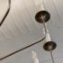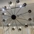 A solid brass in a silver finish twelve-light chandelier in the French Modern style with sleek flared arms radiating from a lozenge cluster. The delicate body is suspended from a slender rod and a length of chain, depending on overall height. In good condition, minimal wear from usage.