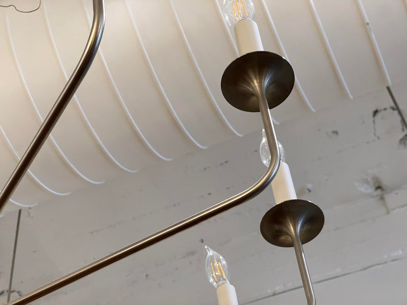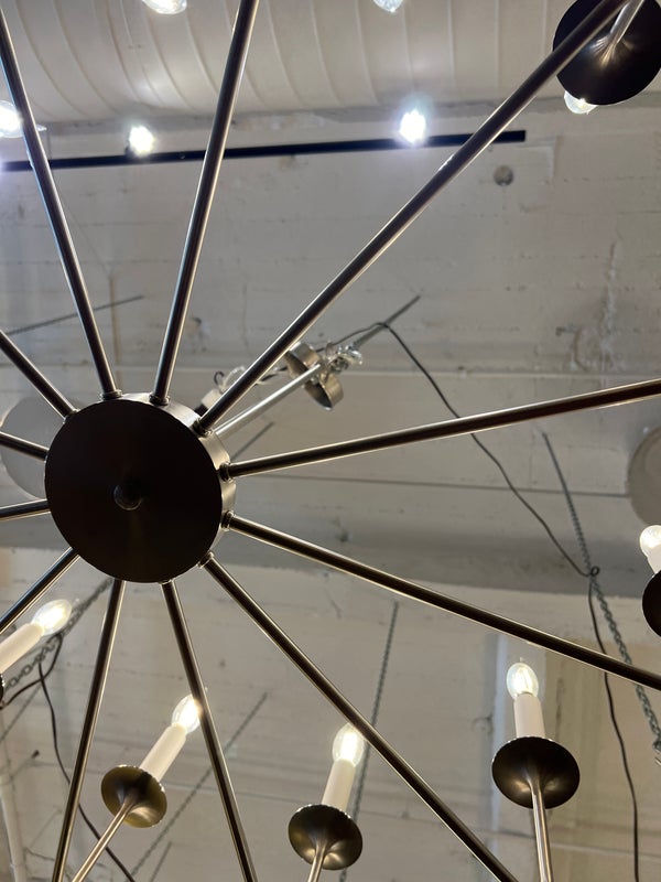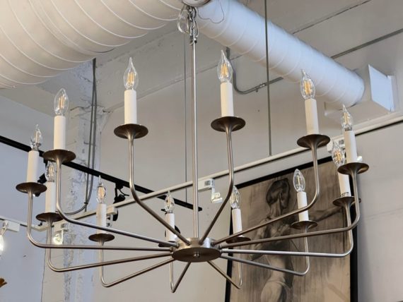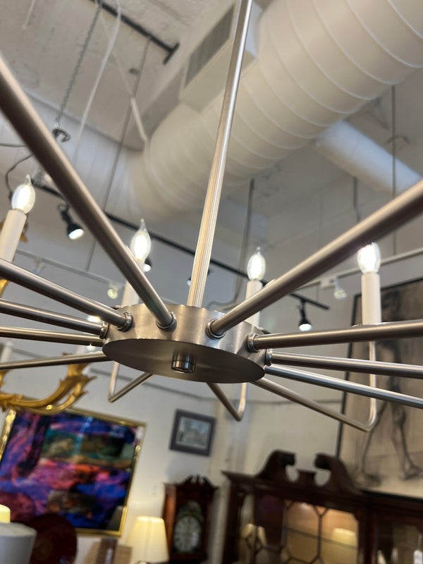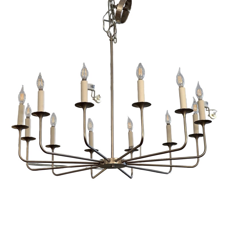 A solid brass in a silver finish twelve-light chandelier in the French Modern style with sleek flared arms radiating from a lozenge cluster. The delicate body is suspended from a slender rod and a length of chain, depending on overall height. In good condition, minimal wear from usage.