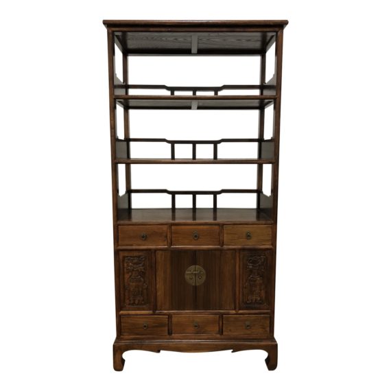 Design Plus Gallery presents a lovely Chinese Etagere. Inspired by antiquities, this contemporary piece features details such as carved panels and brass plate fittings. There are drawers and shelves behind doors, and lots of display area on the open shelves.