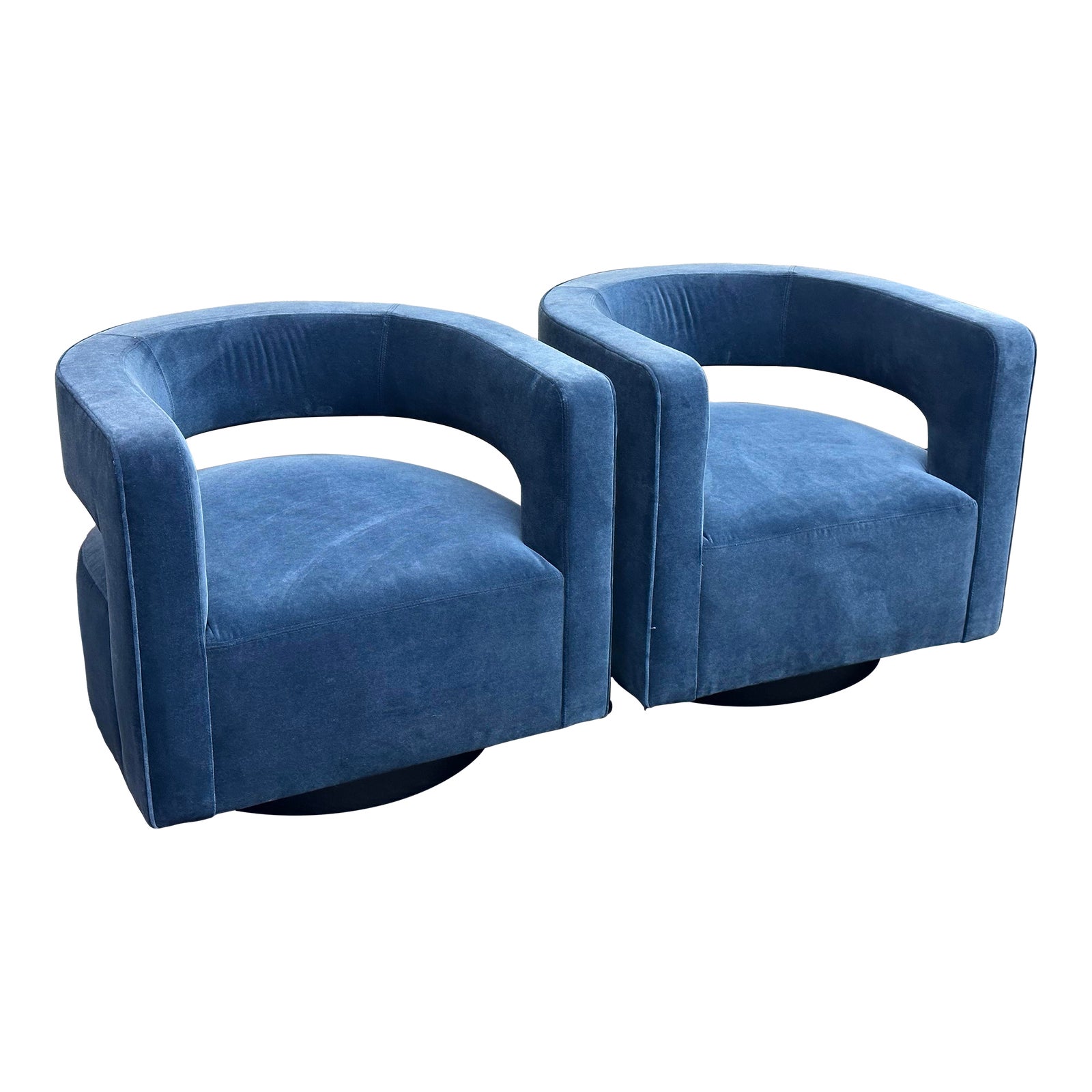 Design Plus Gallery presents a Pair of ‘Drew’ Curvy Swivel Chairs from Restoration Hardware. Their bold, geometric design evokes the originality of 70’s style furniture, complete with a swivel base for those swinging times. Design Plus has the Drew Chairs available in a vintage velvet in a striking Oceanic Blue. There is a solid oak base with ball-bearing mechanism creating a smooth, 360-degree swivel. Handcrafted in the USA. Good condition, some discoloration but overall consistent with age + use.