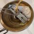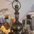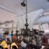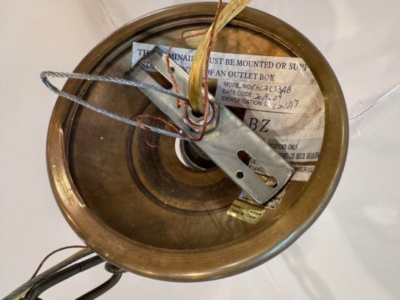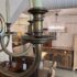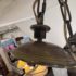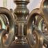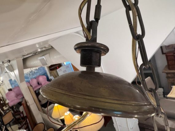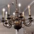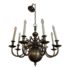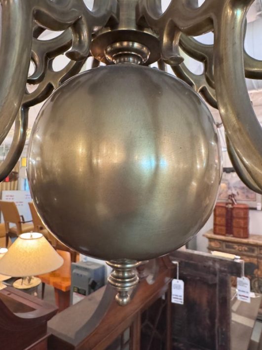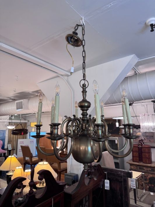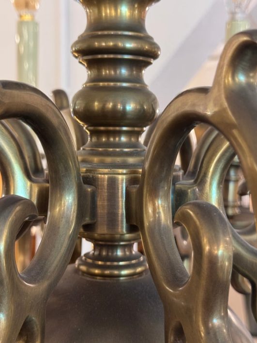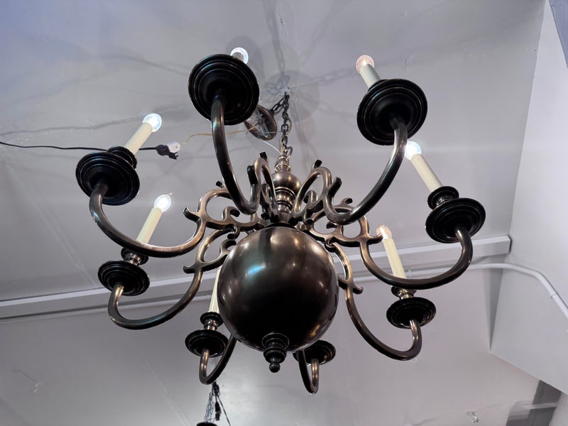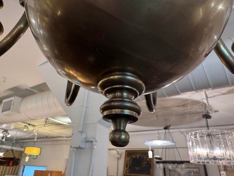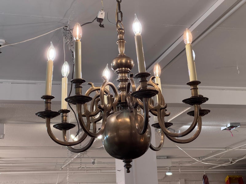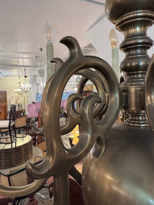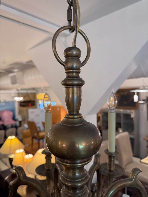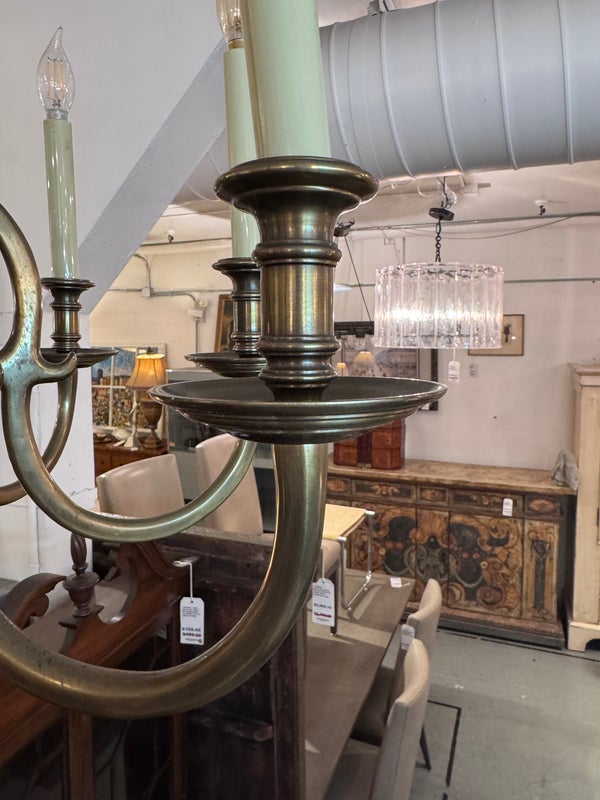 Design Plus Gallery presents an Antiqued Brass Chandelier from Early 21st Century Restoration Hardware. The body and arms have been constructed in the graceful forms of the Baroque, and formed of brass. The elegant candle-arms extending from a shaped column in a single tier, each ending in a shaped nozzle with a wax-tray. Is in good condition with wear that is consistent its age + use.