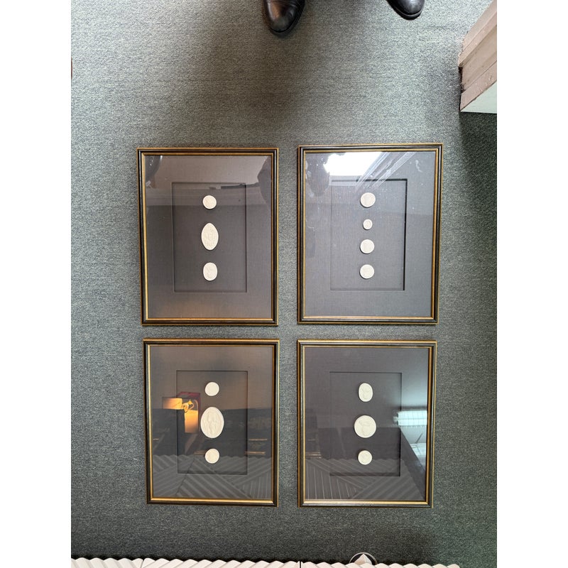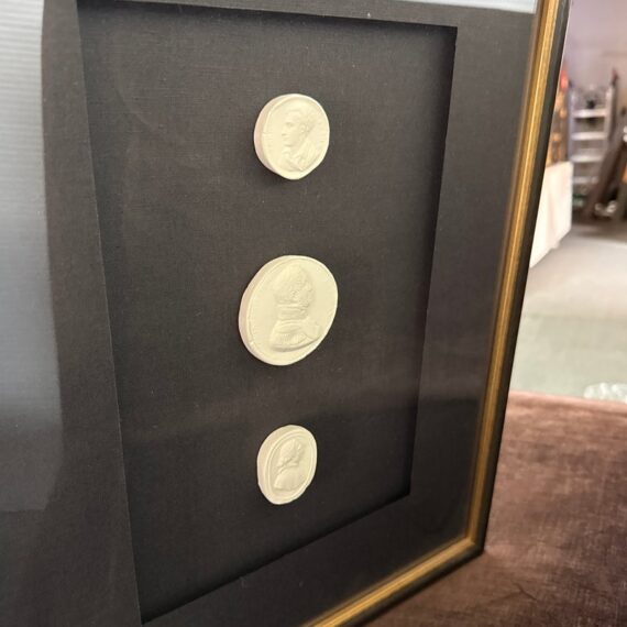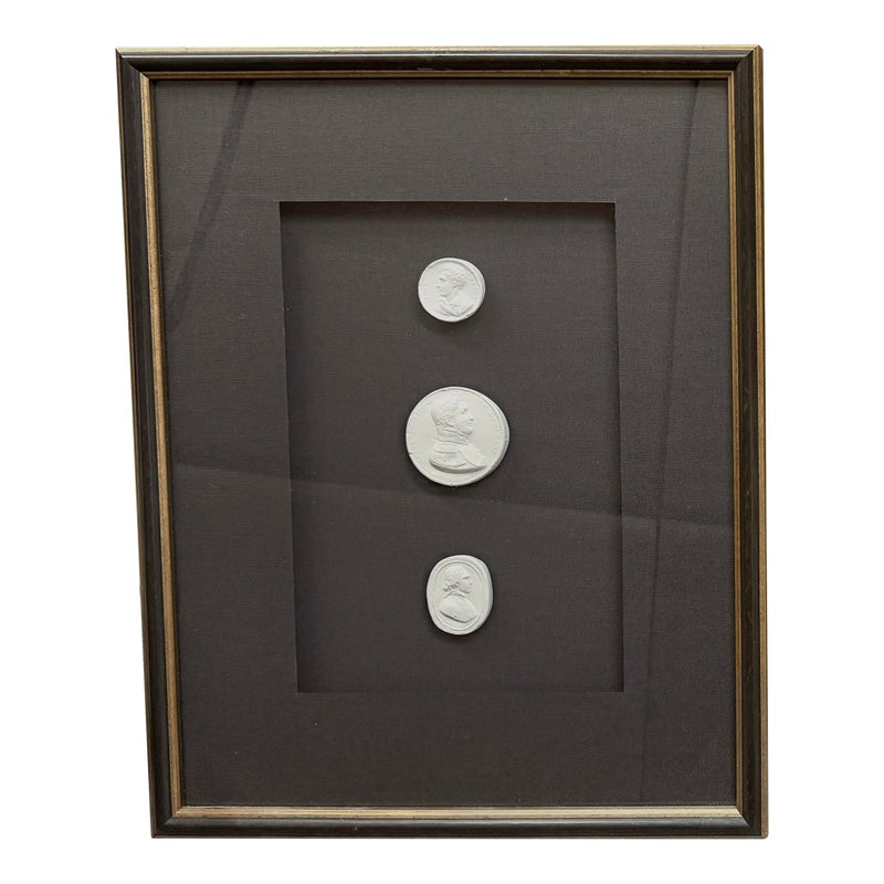 Design Plus Gallery presents a Set of Three Framed 19th Century Intaglio Reproduction by Restoration Hardware. Each original figure was carved, incised, or engraved into plaster so that it is dimensional. The #4 reproduction collection is mounted beautifully on black linen, matted and framed in black washed wood with gold filet. Little wear; condition is good.