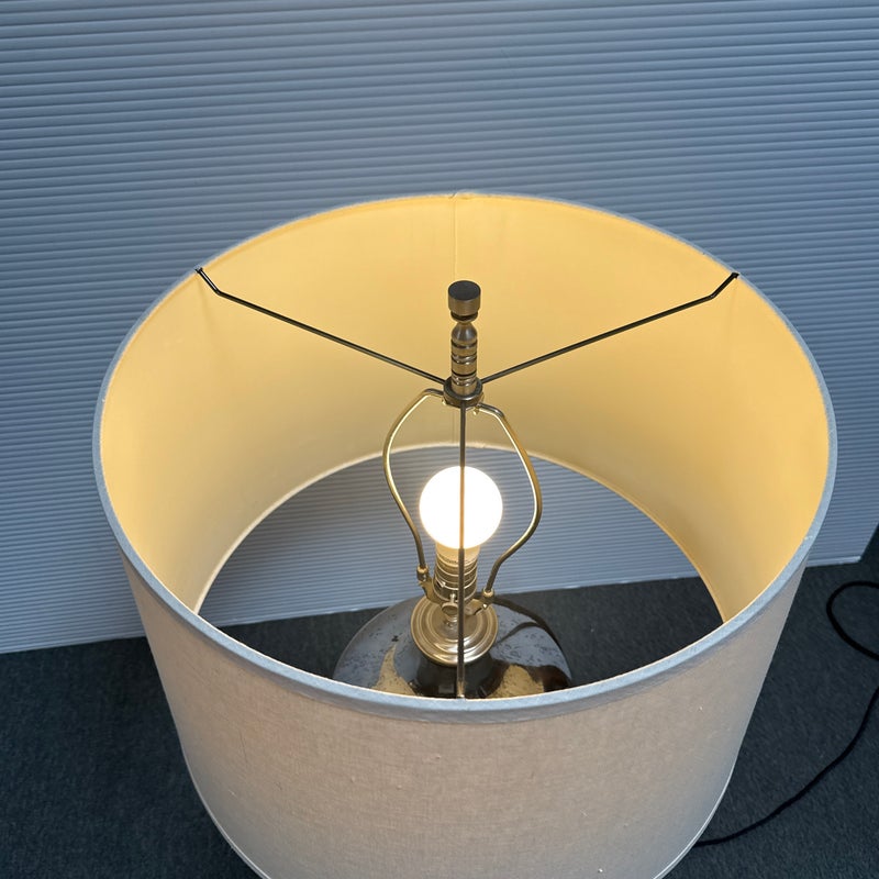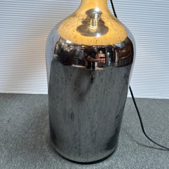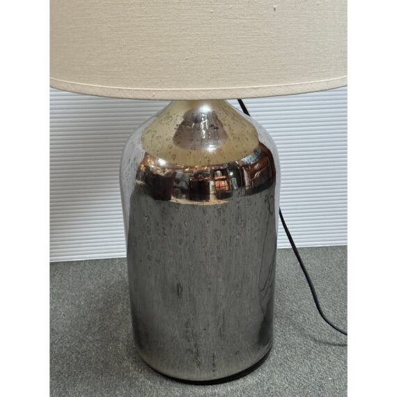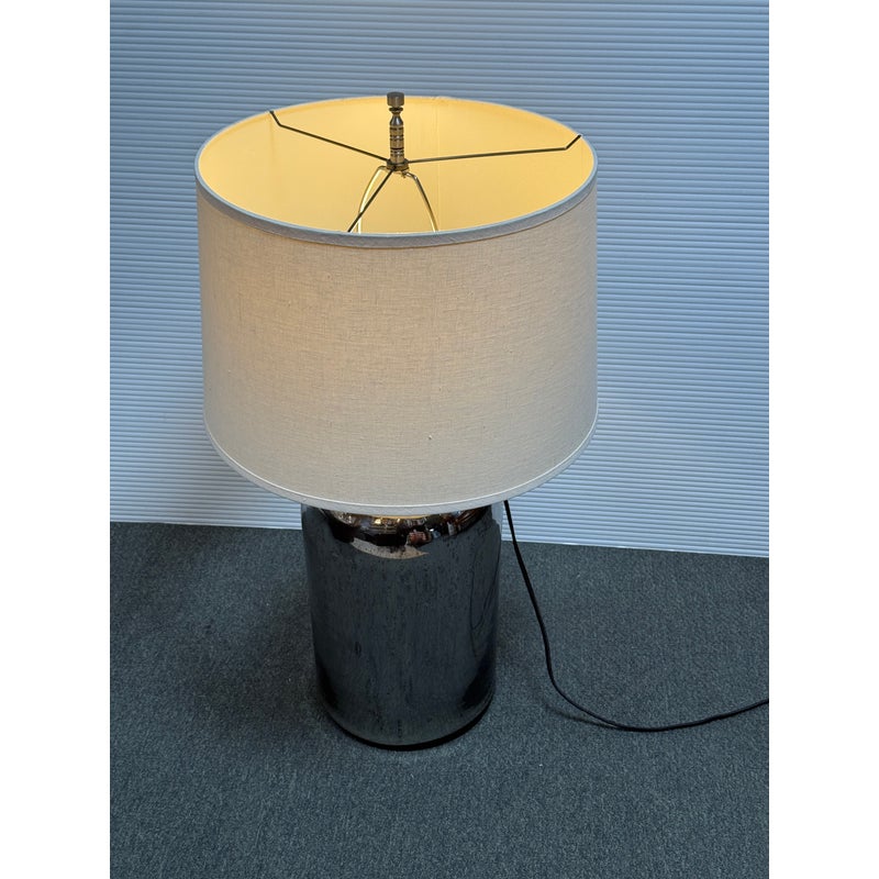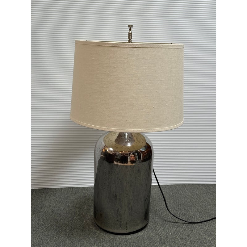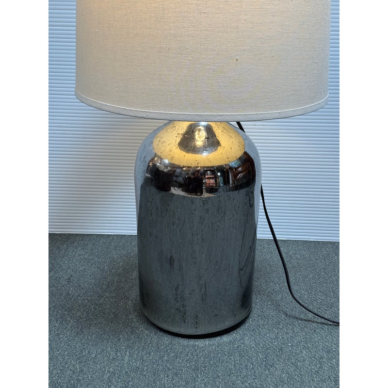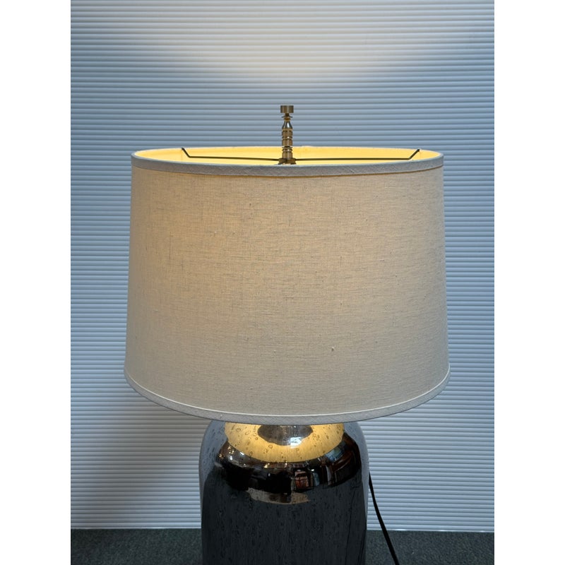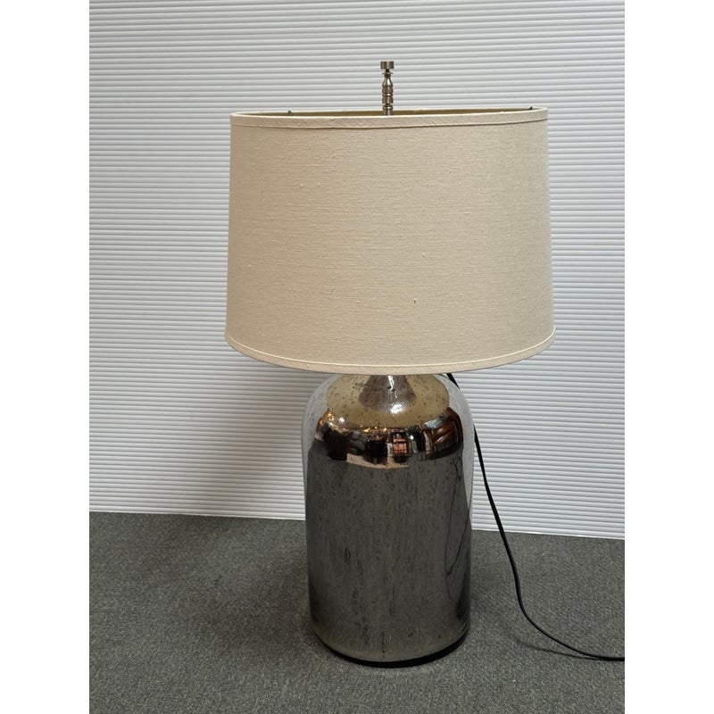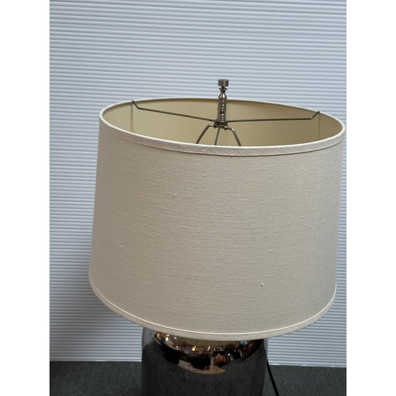 Design Plus Gallery presents the 19th Century Vintage Mercury Glass Table Lamp from Restoration Hardware. This lamp was inspired by mid-19th-century mercury glass, once a covetable alternative to household sterling. Originally made from vessels meant for essential oils + perfumes, the vintage bottles were repurposed and been given a distressed patina for an authentic timeworn appearance. The single-walled cast glass has a distressed patina for a more time-conditioned look. Topped with off white drum shade and finial. Wear is consistent with use; lamp is in good condition.