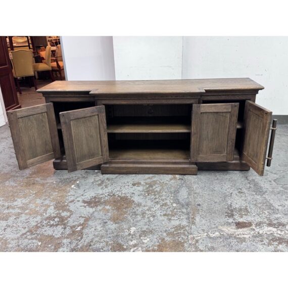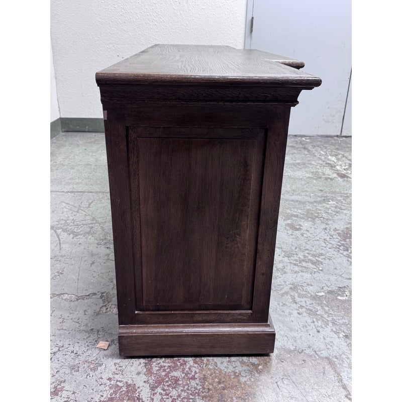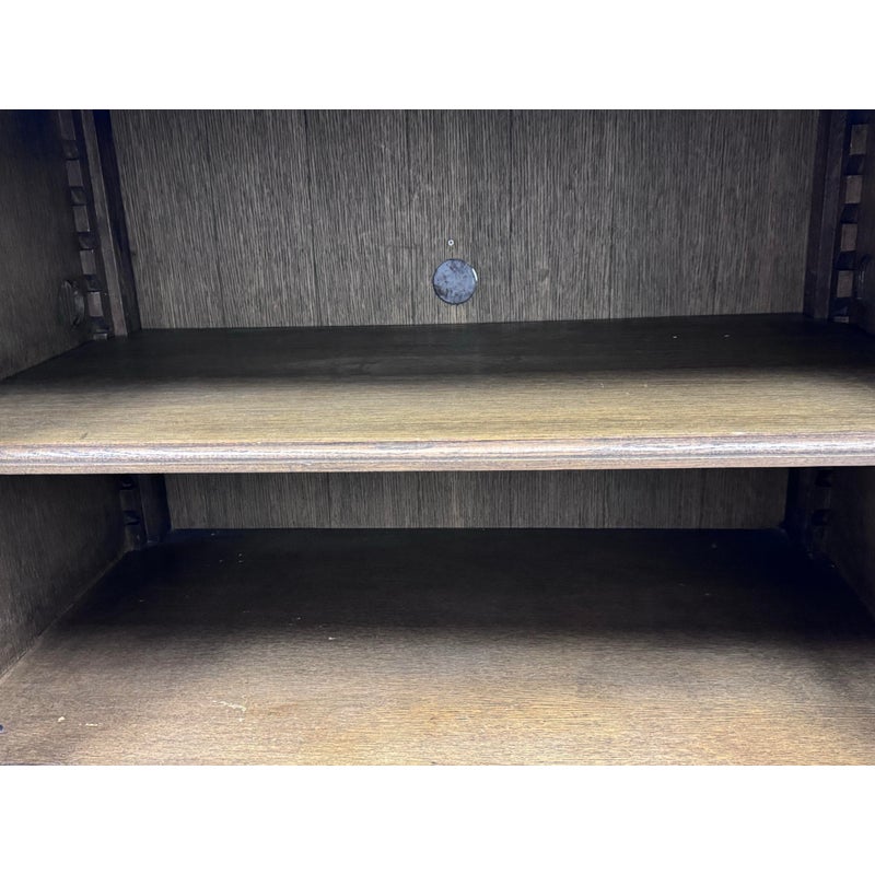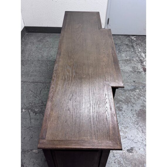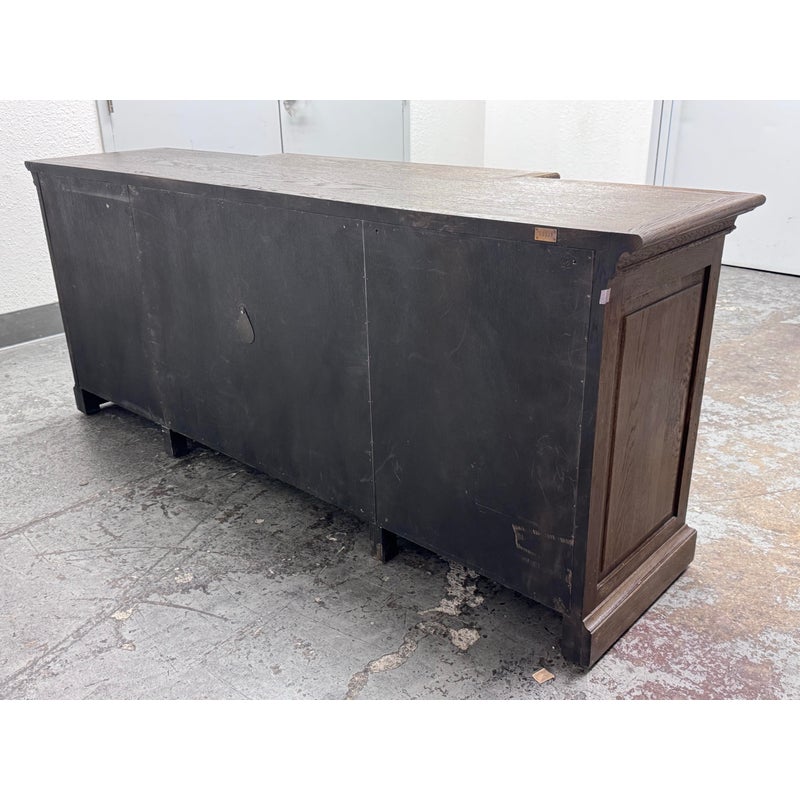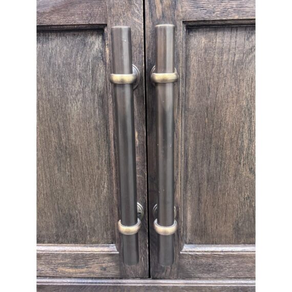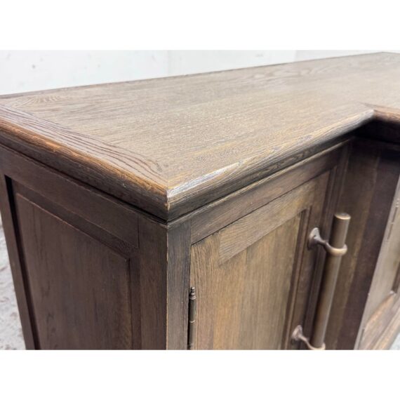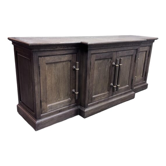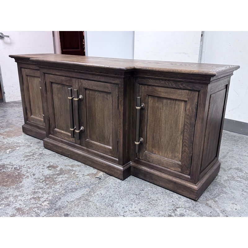 Design Plus Gallery presents a 20th Century English Brass Bar Sideboard. At the dawn of the 20th century, well-crafted cabinets like this were frequently employed by English shopkeepers to showcase and store their merchandise. True to its inspiration, this large scale cabinet exudes a sense of drama with its brass bar handles, elegantly molded cornice, and plinth-style base. The cabinet has been meticulously constructed from solid oak, adorned with a matte multi-step finish, and hand-applied wax. The interiors and adjustable beveled shelves were painted to harmonize with the exterior. Antiqued brass bar handles are securely fastened with cast metal hardware. This style is no longer in production with the brand and its condition is good for age and use.