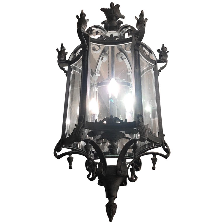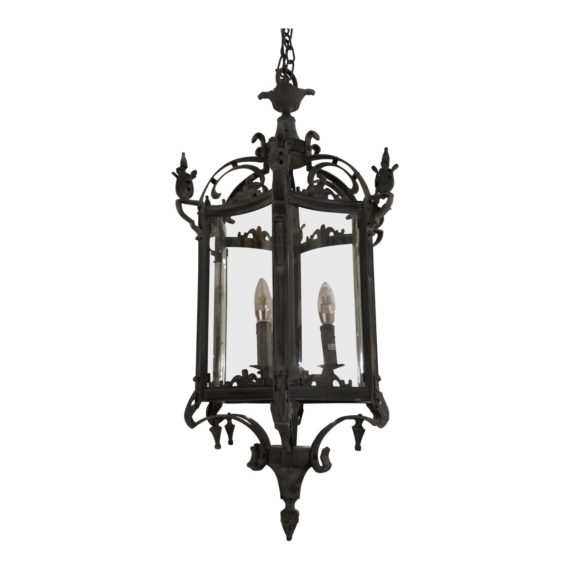 Design Plus Gallery presents a 19th C. Salerno Streetlight Pendant by Restoration Hardware. The Salerno Pendant is an updated version the 19th century Italian gas streetlights that once lighted the Amalfi Coast. Ornate metal frame in a zinc finish, six curved in glass sides. Consist of three light bulbs.