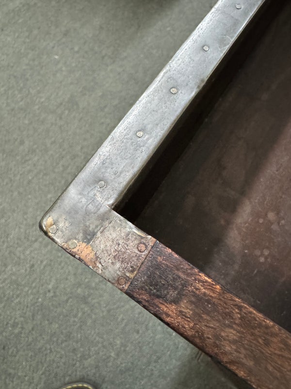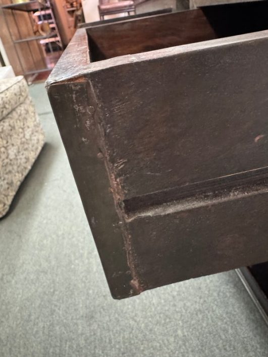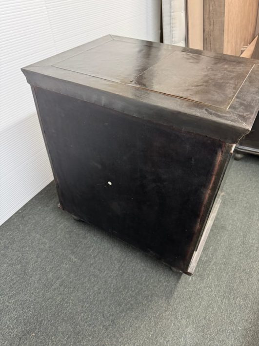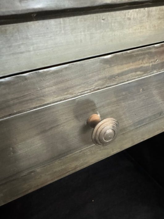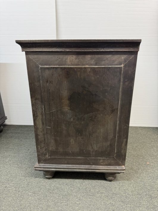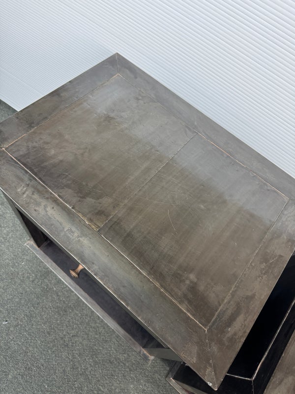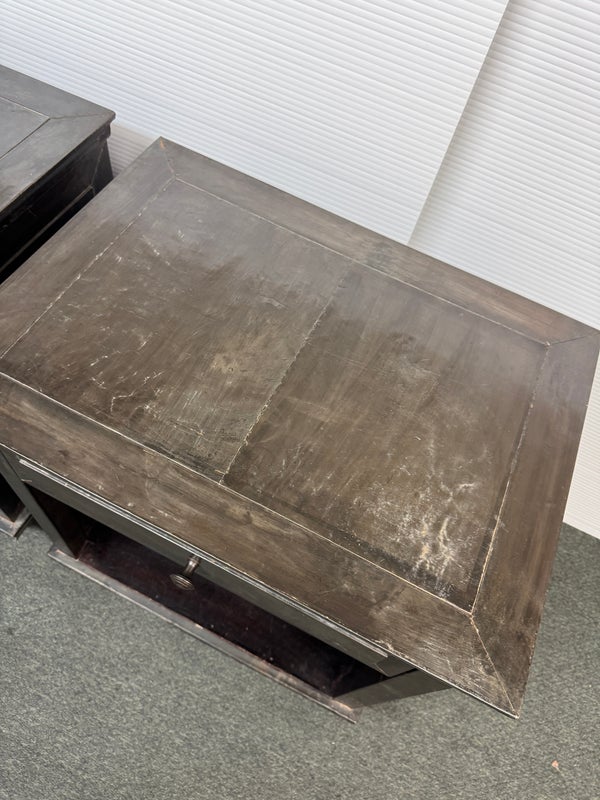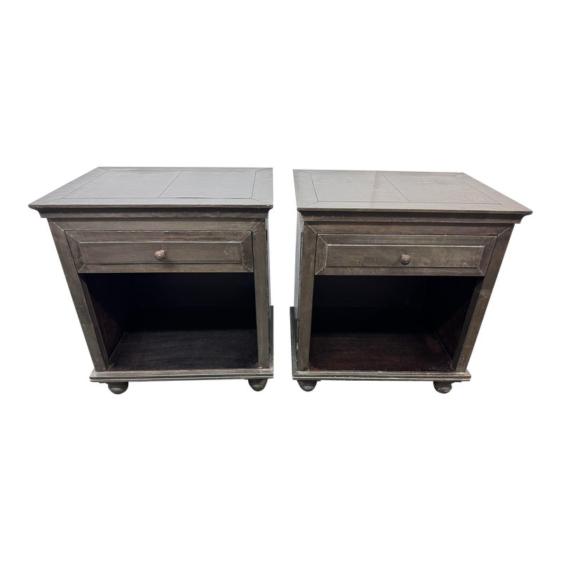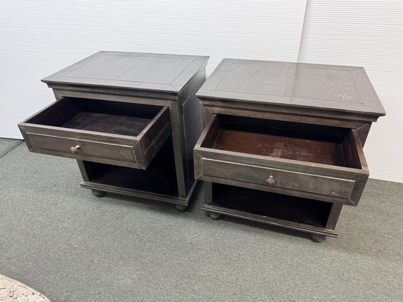 Design Plus Gallery presents a Pair of Amnesty Nightstands from Restoration Hardware. The bed side tables have a retangular top with subtle molding throughout. The upper single drawer is found on both identical tables with a round pull. Open cavity under each drawer. Bun feet at their base show etching to design. They both show visible wear and give a rustic European design style that Restoration Hardware is synonymous for. In good condition, visible and minimal wear from usage + age. Made in India.