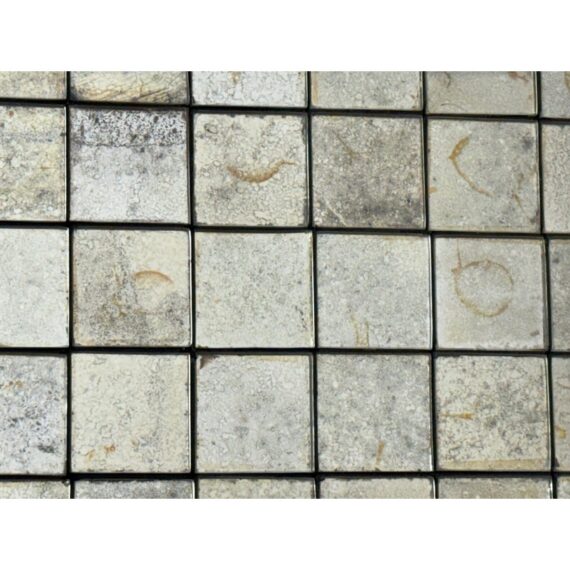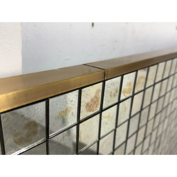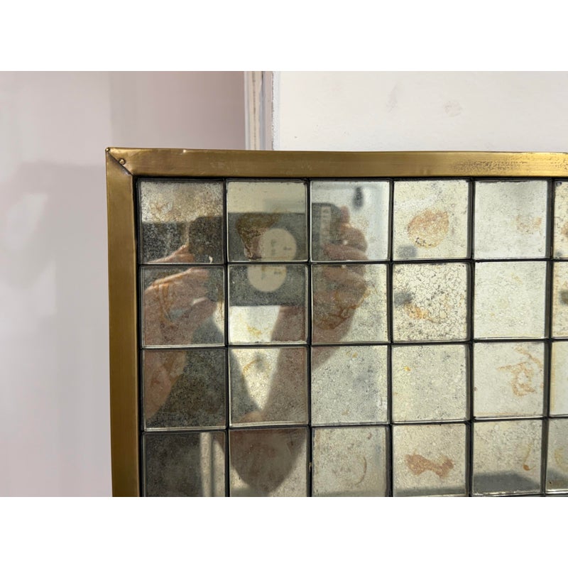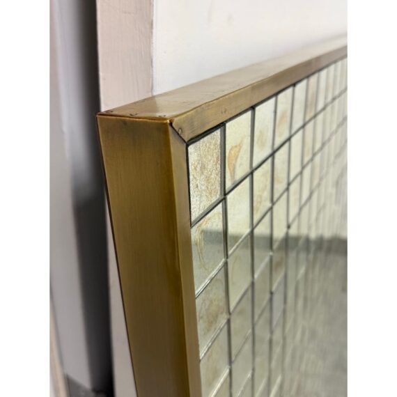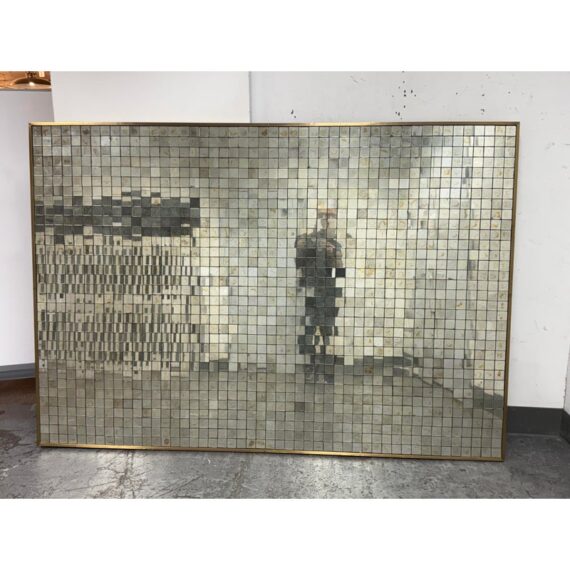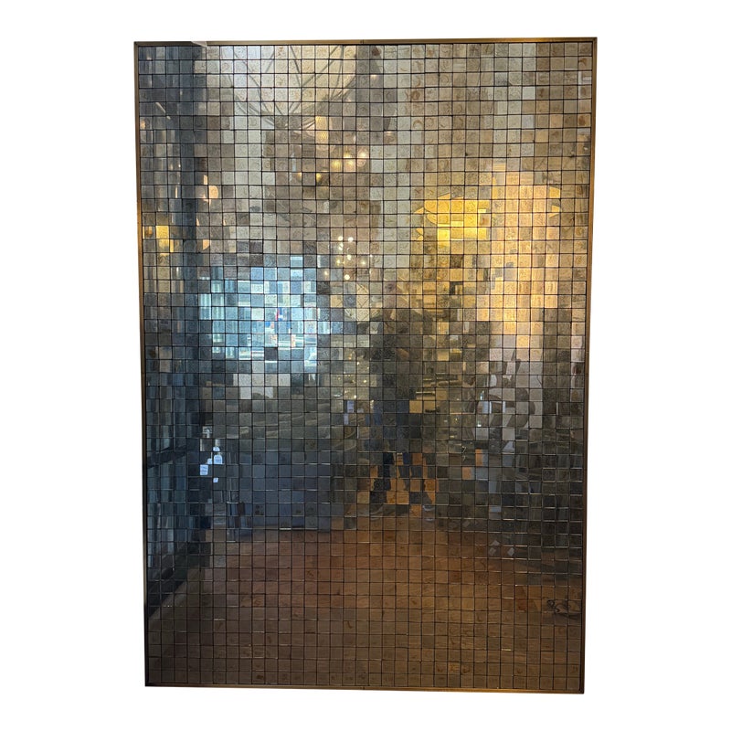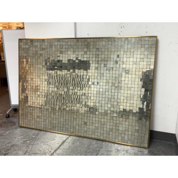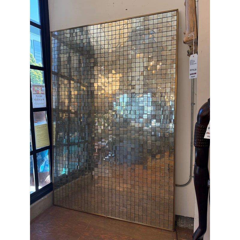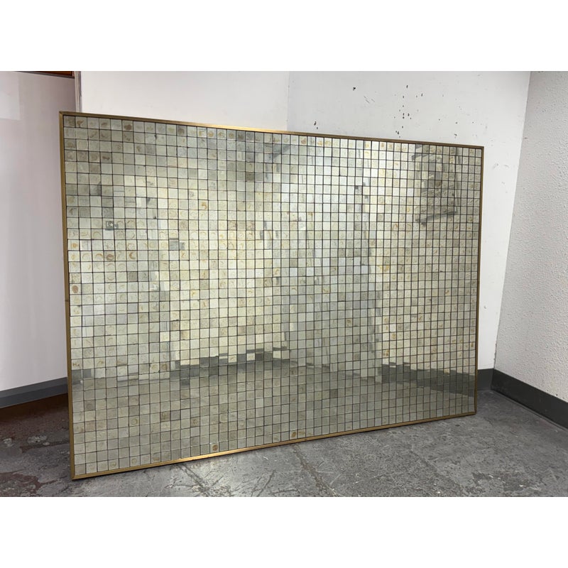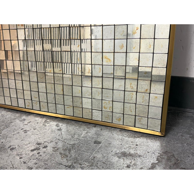 Design Plus Gallery presents the Antiqued Glass Mosaic Floor Mirror by Restoration Hardware. The decorative wall panel/art piece is artisan crafted from antiqued glass tiles, and the mirror exemplifies the bold scale and exuberance of 1970s design. The light-reflecting mosaic is counterbalanced by the burnished warmth of an aged brass frame. You will be able to let light prisms into your living space with the decorative piece. This style has been discontinued by the brand. Is in good condition with minimal wear from use.