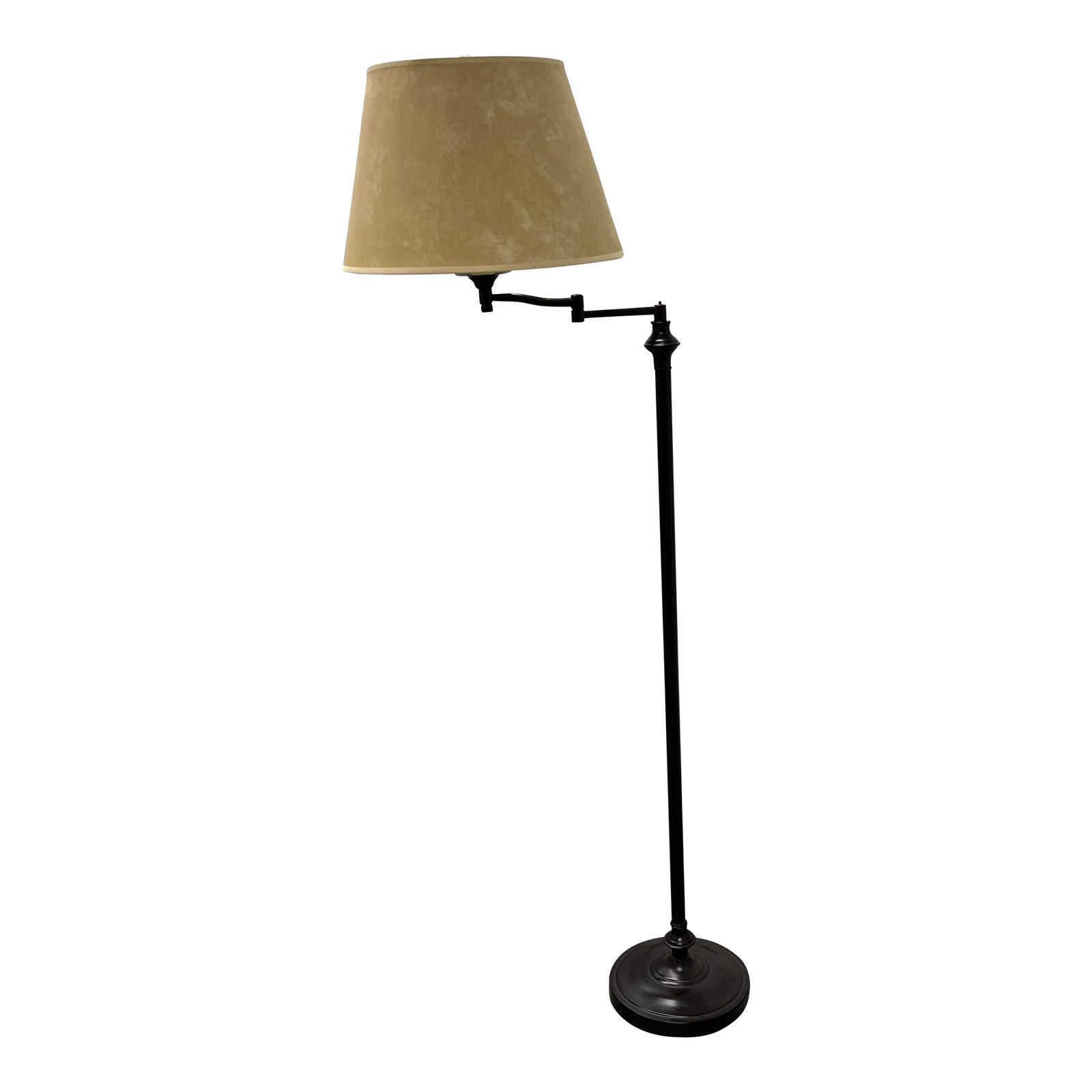 Design Plus Gallery presents a Restoration Hardware Floor Lamp. The body is constructed with metal in a black finish, and the base is round. The shade is a drum shade with minimal taper. The body features an articulating arm to direct lighting as preferred. Takes one bulb and uses a turn switch. Minor wear consistent with use; lamp is in good condition.