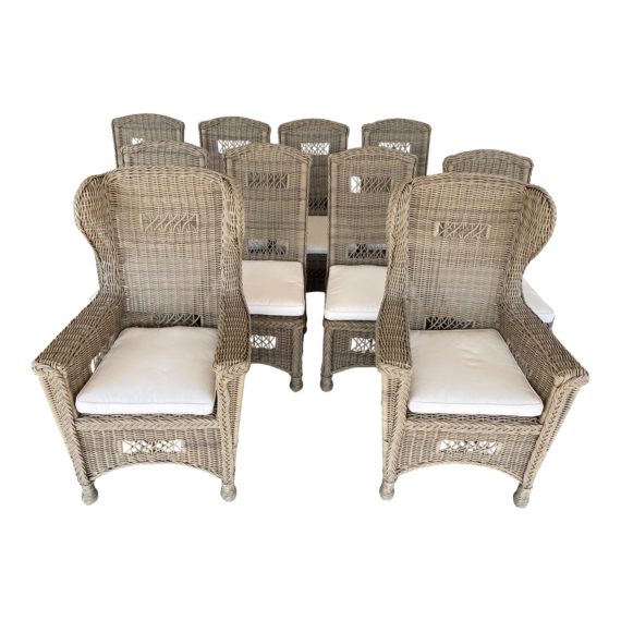 Design Plus Gallery presents a Set of Ten Bar Harbour Chairs from Restoration Hardware. This all-weather wicker set references the porches of the East Coast, early 1020’s, in durable hand-woven strands that resist fading, cracking and mildew. Each Chalk Finished piece has a braided outline, open-weave insets and egg-shaped feet for interest, and is built on a rustproof aluminum frame for durability. The pair of armchairs has a wingback silhouette. Easy Care fabric on seat cushions is weather friendly, resisting mildew, stains and fading.