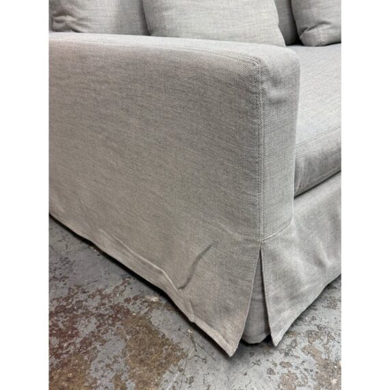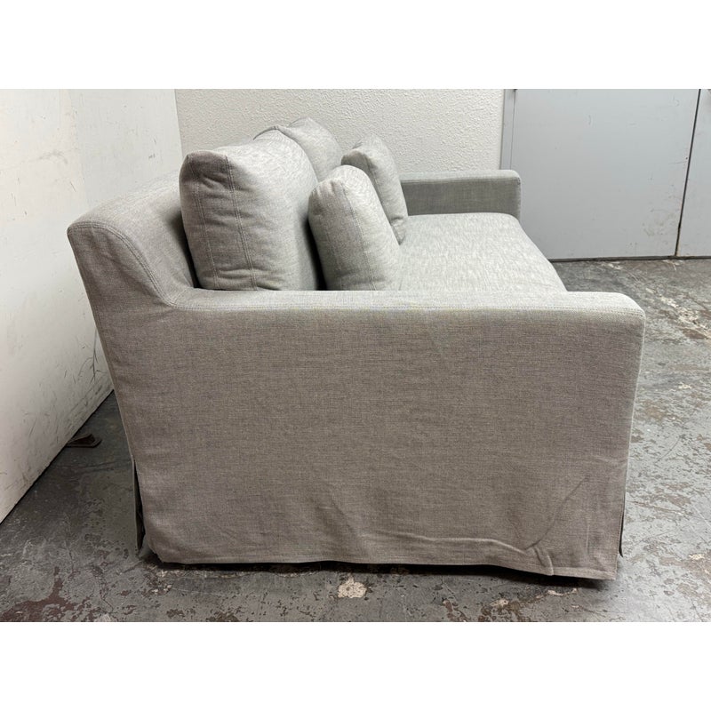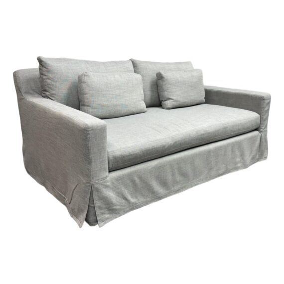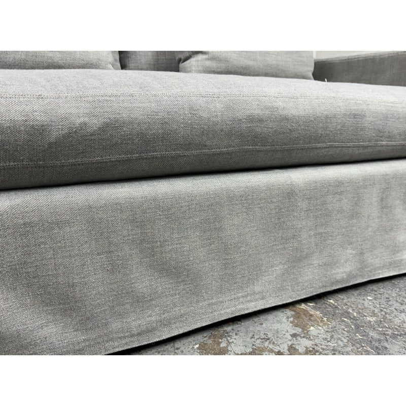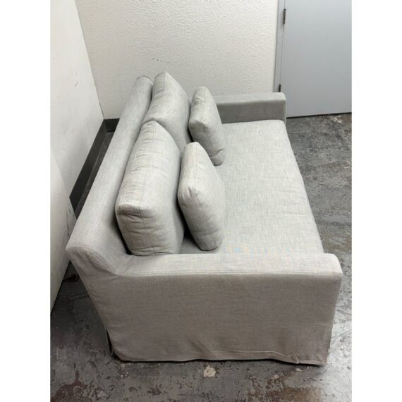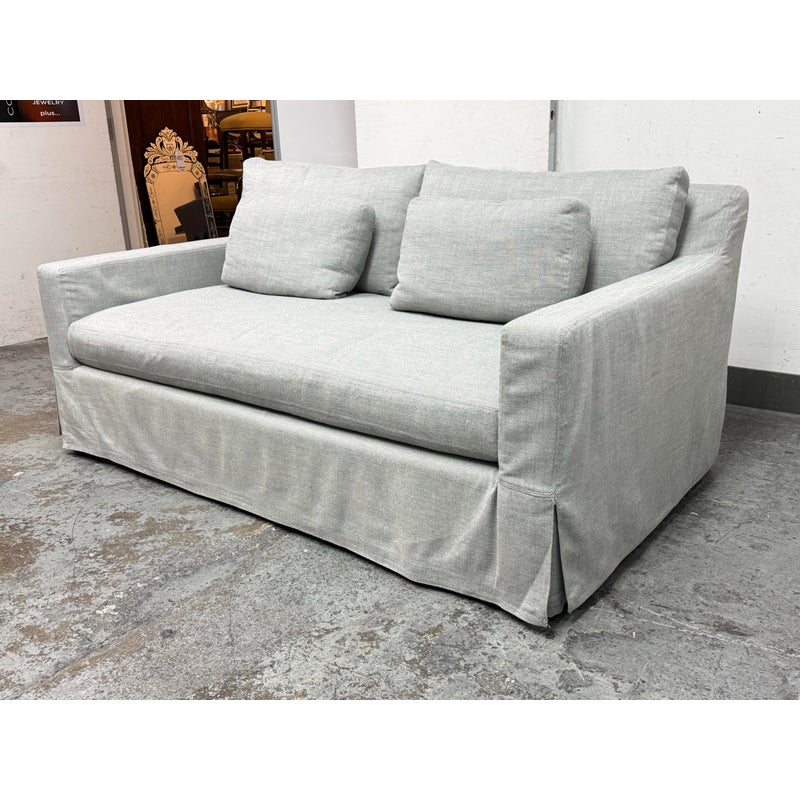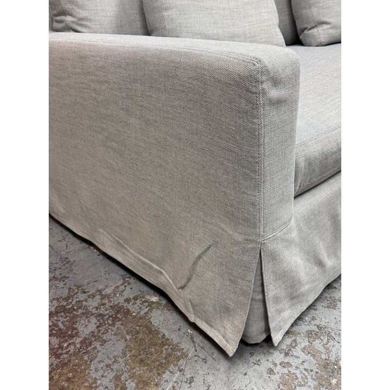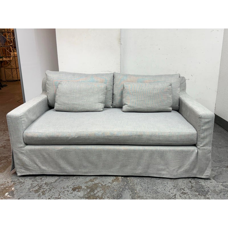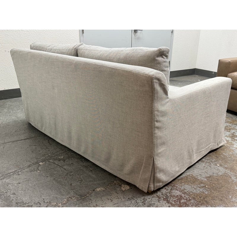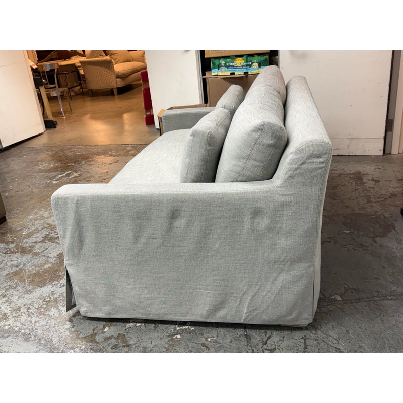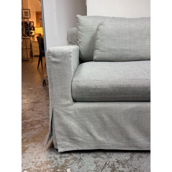Design Plus Gallery presents the Belgian Track Arm Slipcover Luxe Sofa from Restoration Hardware. A classic interpretation of the European-inspired track arm sofa. Deep in profile, sleekly streamlined and slipcovered for casual yet sophisticated appeal, it offers luxurious comfort. The sofa features heirloom-quality, eight-way hand-tied springs, considered the gold standard for comfort and longevity. The solid hardwood frame is bench-made by artisans using reinforced joinery with mortise-and-tenon construction, offering unmatched durability. in good condition, minimal wear.