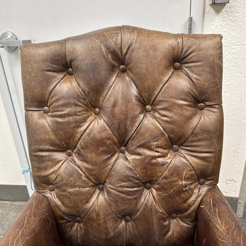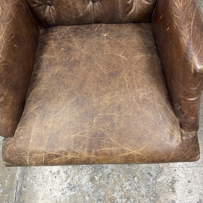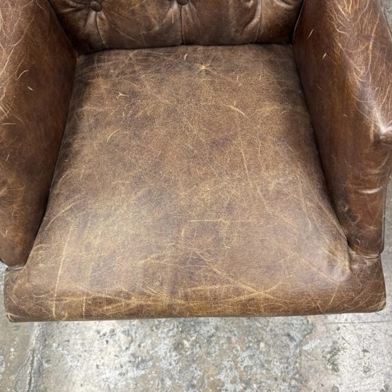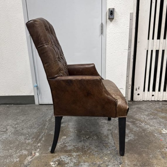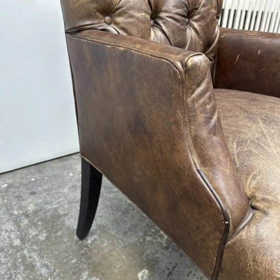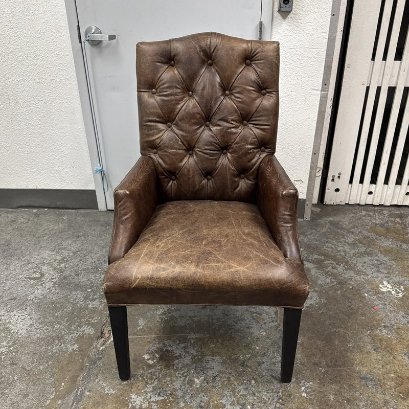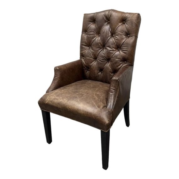 Design Plus Gallery presents the Bennett Parsons Brompton Cocao Leather Dining Arm Chair from Restoration Hardware. Deeply cushioned and generously sized, it’s a comfortable spot for dining and conversation. Due to its graceful curves + elegant silhouettes, this can double as a great home office chair. The chair shows signs of visible wear that are consistent with usage.