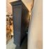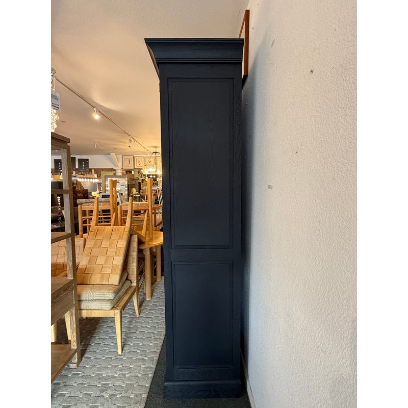 Design Plus Gallery presents a Shutter Single Armoire by Restoration Hardware. This charming, small scale armoire is crafted from solid hardwood, and has a black distressed painted finish and cast metal pulls. A timeless design features a lower cabinet with a removable shelf and an upper hutch with a removable shelf and clothing rod. A thoughtful combining of form and function, the Shutter Armoire imparts much-needed order, be it in the entryway or playroom, media center or bedroom. Made in Vietnam. Light surface wear; condition is good.