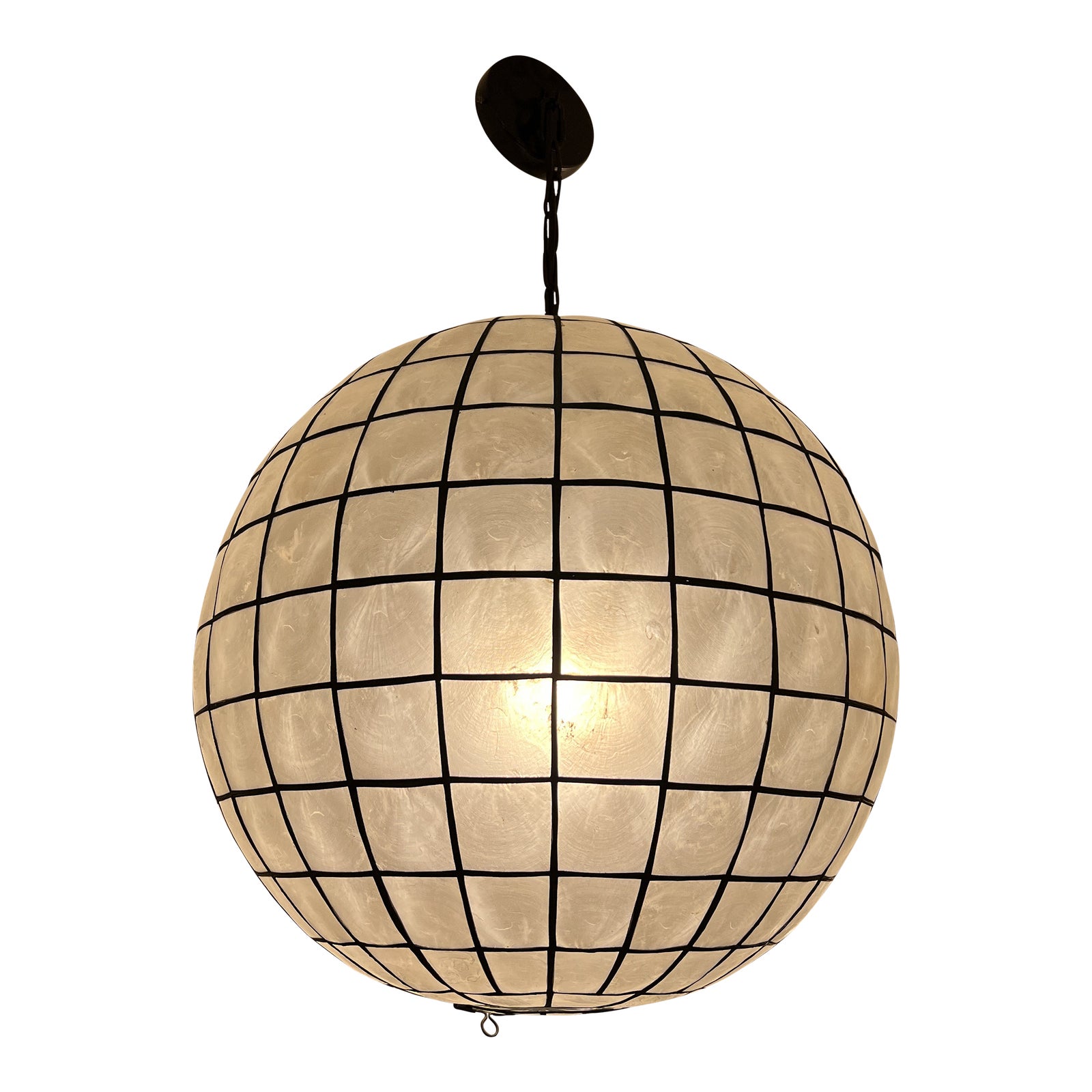 Design Plus Gallery presents a Capiz Shell Pendant by Restoration Hardware. Inspired by the seashell pendants that graced many fashionable 1960s interiors. Shell lighting offers mood-setting illumination through its pearlescent shell panes, each one cut from an individual natural shell and set in a slender metal grid. The translucent material filters and diffuses the light, casting a warm glow. The frame finish is a Matte Black Minor wear from usage. Wipe with a soft, dry cloth; avoid the use of all cleaners and abrasives, as they will damage the finish.