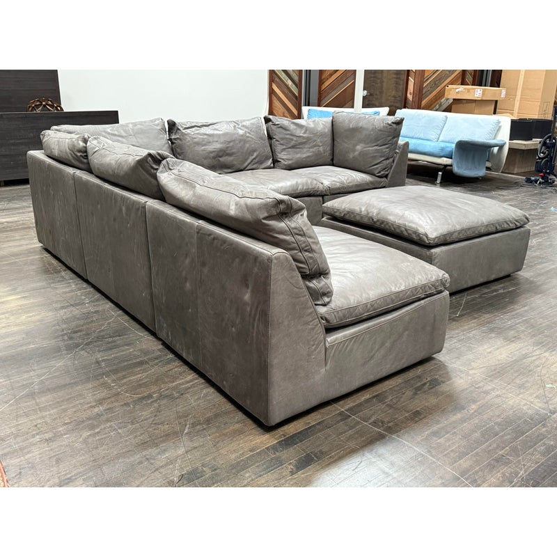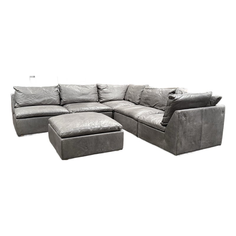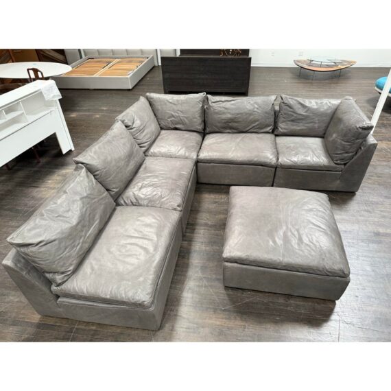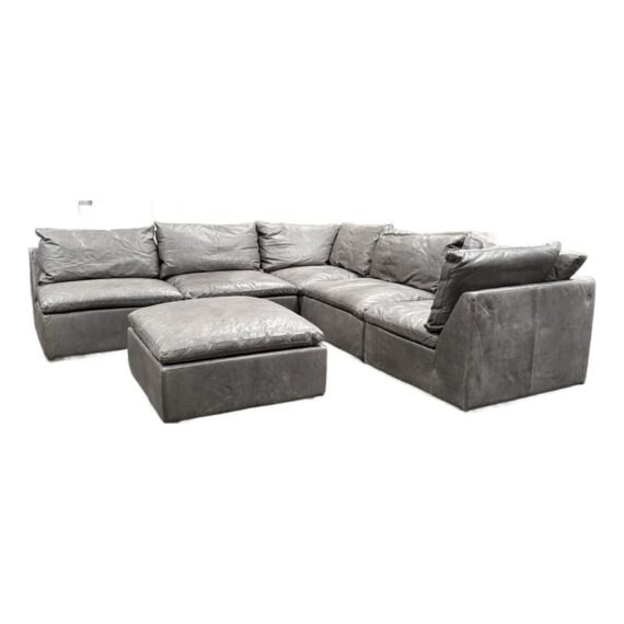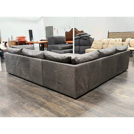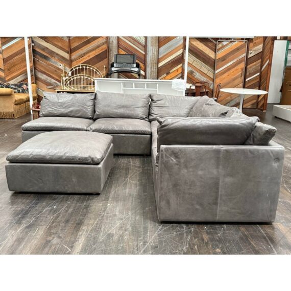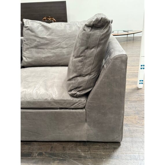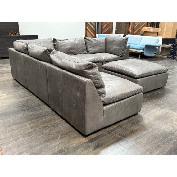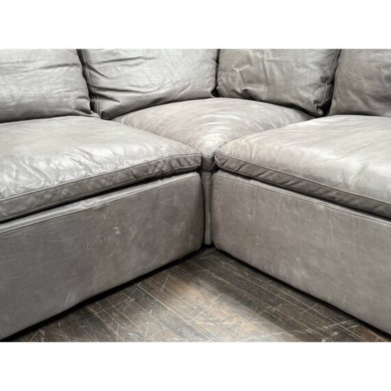 Design Plus Gallery presents the Cloud Modular Sectional from Restoration Hardware. This version of the brands Cloud is made up of four pieces; a corner piece, single armless chair, a full sofa, and ottoman. The Cloud was designed by Timothy Oulton and built for laid back lounging on what they believe to be the world’s most comfortable sofa. The Cloud features sink-in comfort of soft feather and down construction around a premium foam core for support. It’s a modern marriage of versatility, perfect proportions and unmatched comfort. Their Granite Cavalo leather wraps around its entirety and shows little visible wear for its usage. Made in Mexico.
