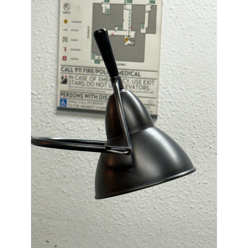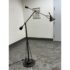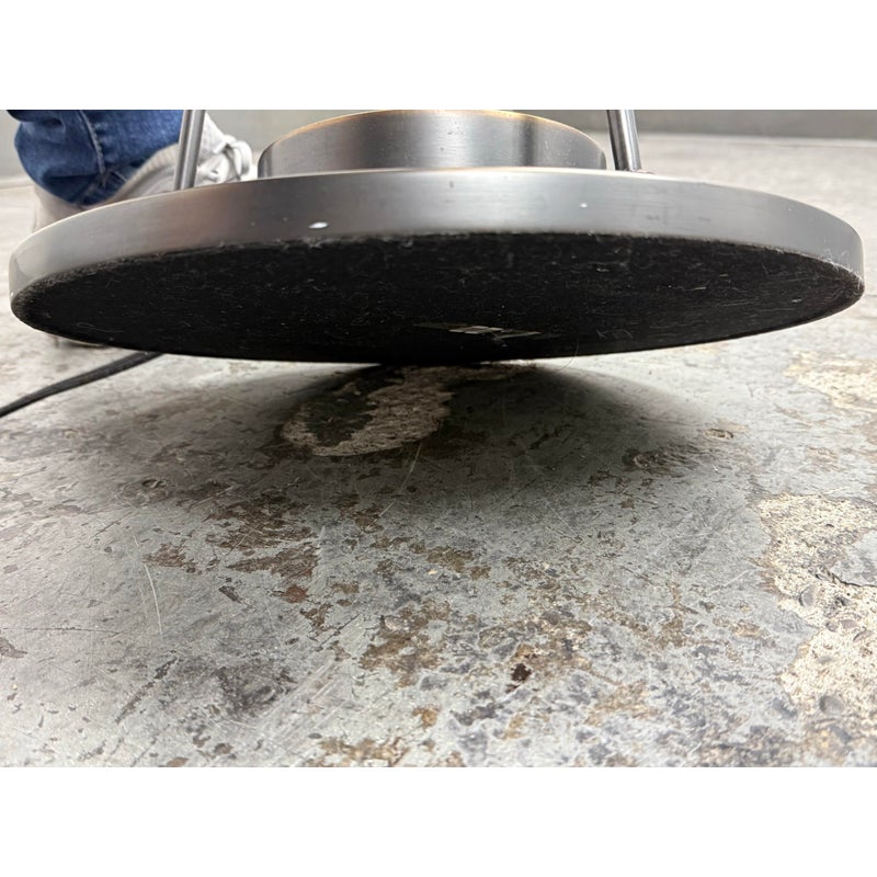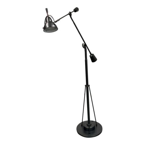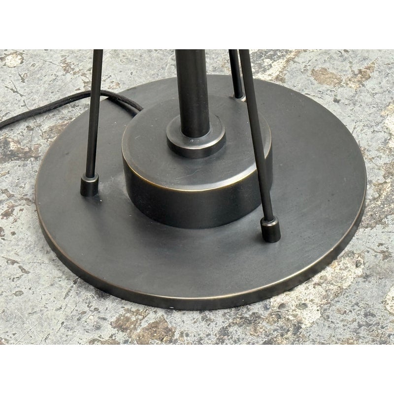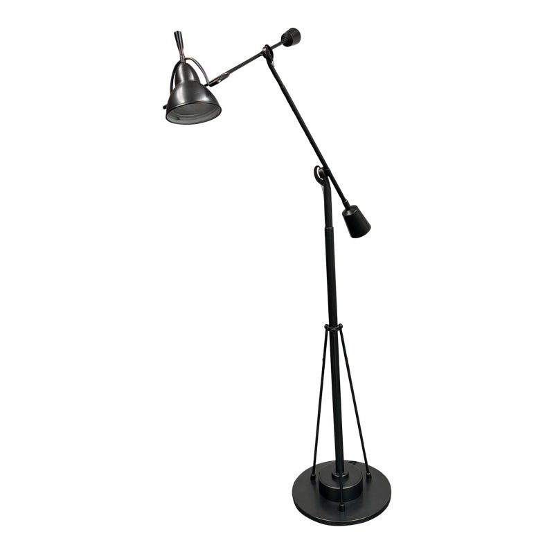 Design Plus Gallery presents the Counterpoise Task Floor Lamp from Restoration Hardware. Inspired by the counterpoise designs developed in Paris in the 1920s, this adjustable floor lamp pairs an articulated arm with a weighted balance element and a metal dome shade. The silhouette is linear and architectural, while the round base and slender support rods give the piece a measured industrial presence. Finished in a dark bronze-tone metal, the lamp includes a foot switch and visible maker labels. This is a discontinued model with the brand and is in good condition with visible and minimal wear from usage.