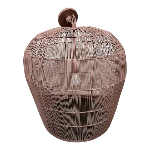 Design Plus Gallery presents the Wire Dome Pendant by Restoration Hardware. The classic industrial dome gets an updated look in new colorful materials. Slim wires wrap vertically around the basic steel frame, creating the linear weave. Light from the single 100W bulb (not included) filters through, creating a play of shadows. Pendant was painted dark pink post purchase; no evidence of wear otherwise.