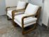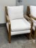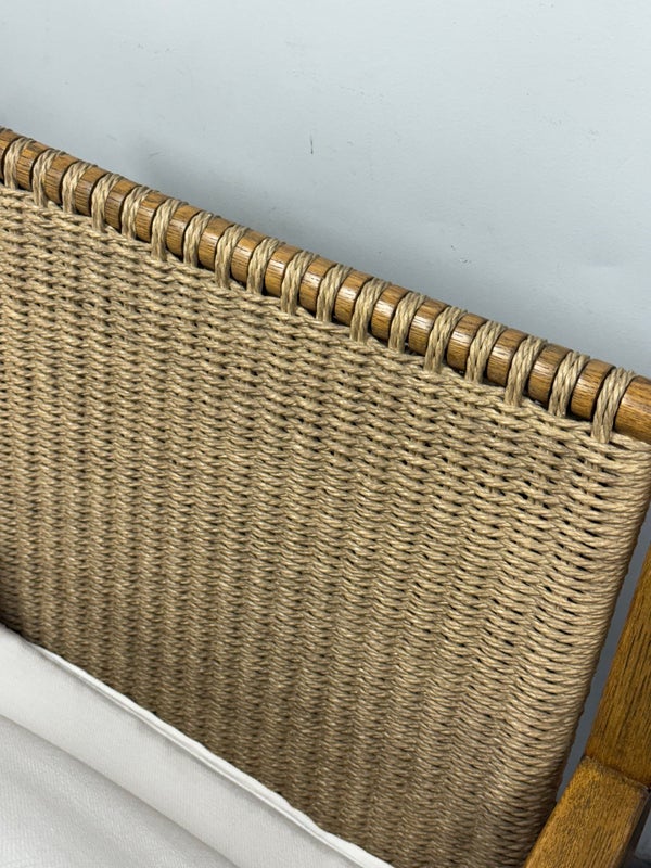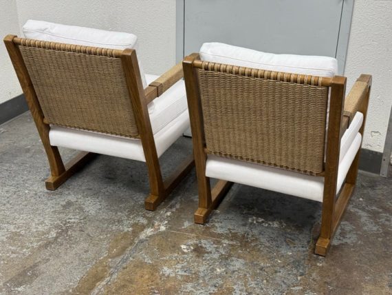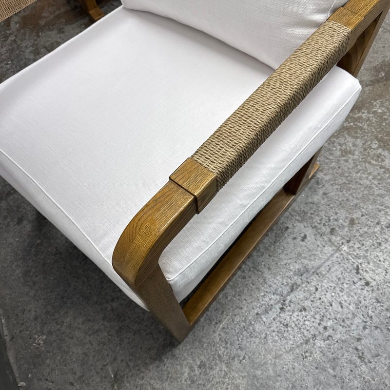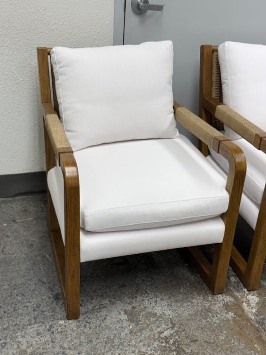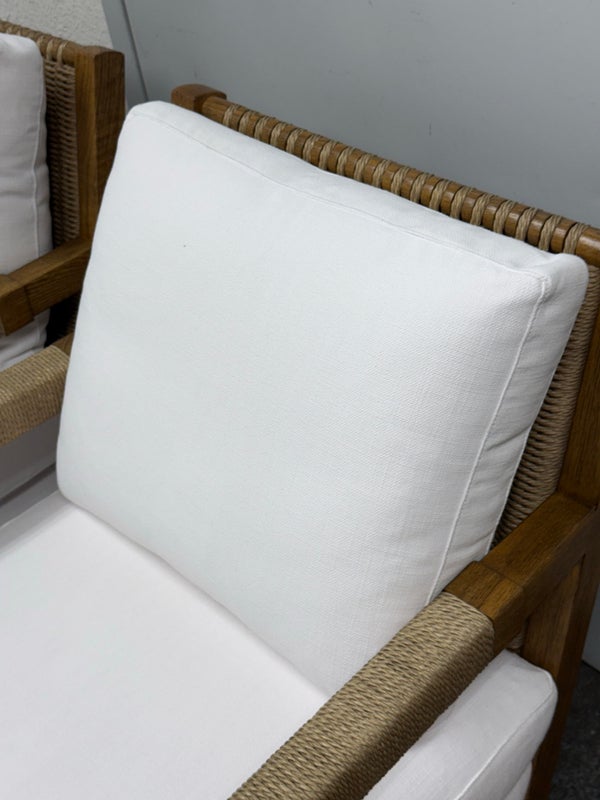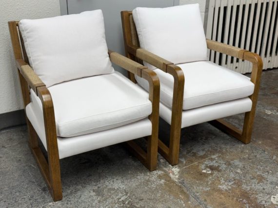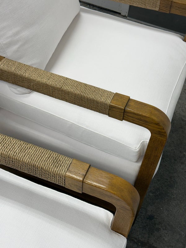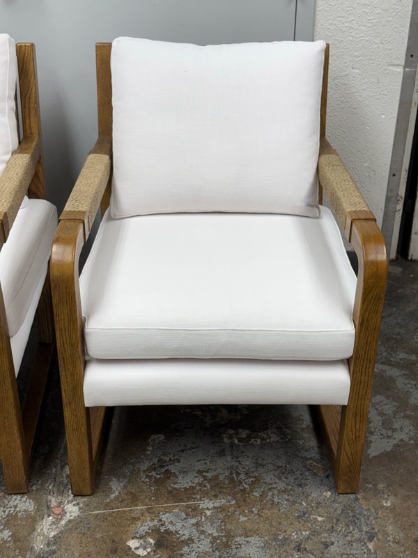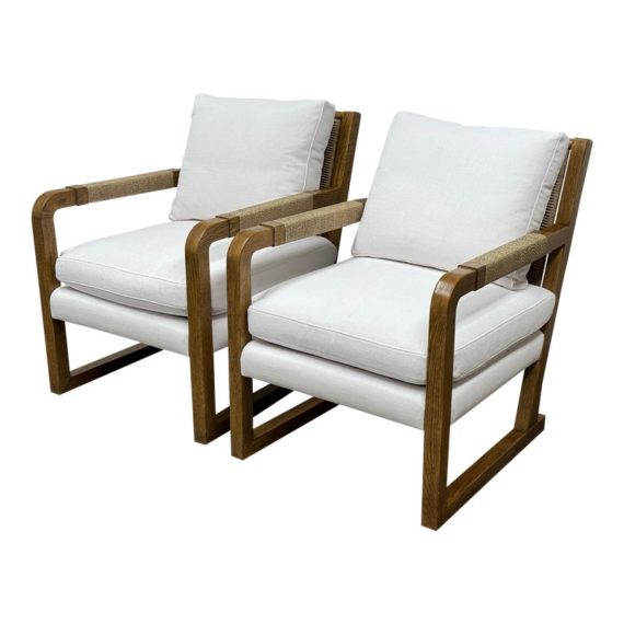 Design Plus Gallery present a Pair of Eagan Lounge Chairs from Restoration Hardware. With softened geometric lines and a distinctive mix of materials, the softened chair from the Van Thiels is inspired by the bold, streamlined forms of British midcentury furnishings. Masterfully handcrafted of solid oak, the sculptural openwork frame with rope-wrapped arms provides an airy architecture for the plush upholstered seat. Redefine you comfortably chic living area in your home with these easy, breezy and sophisticated chairs. They are both in good condition with minimal signs