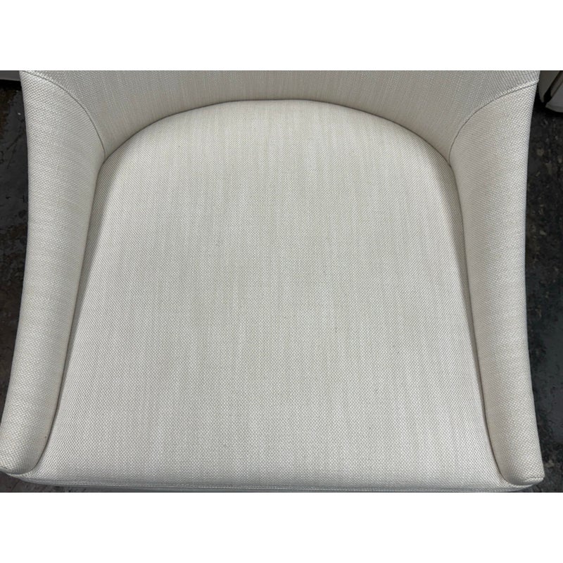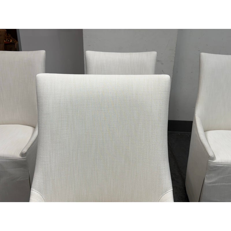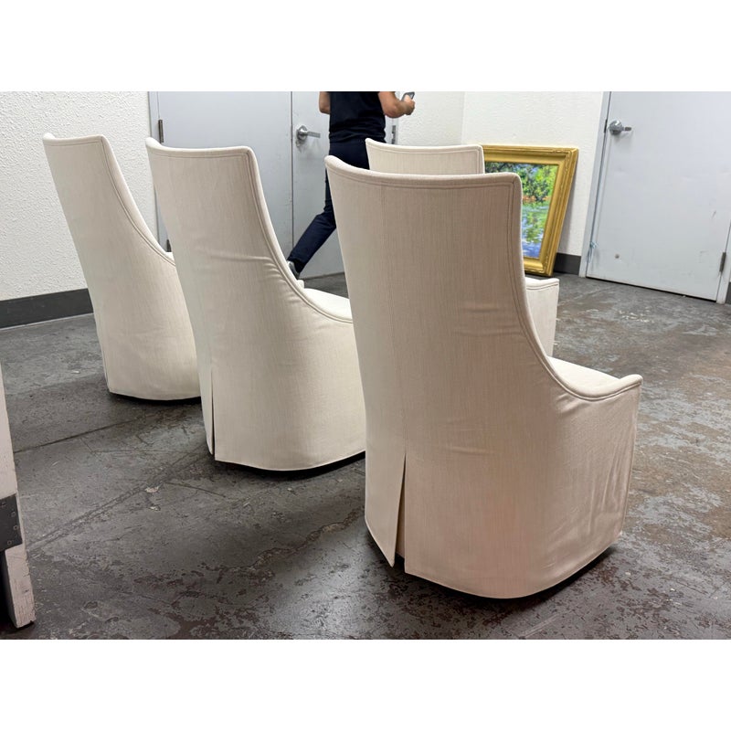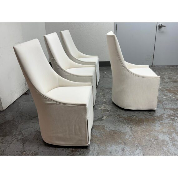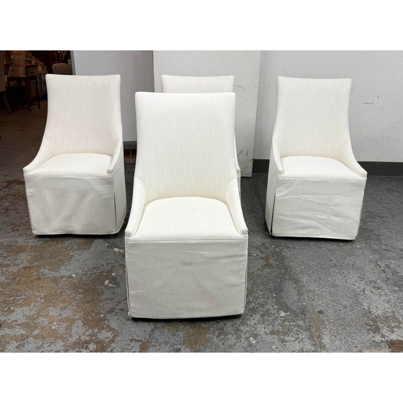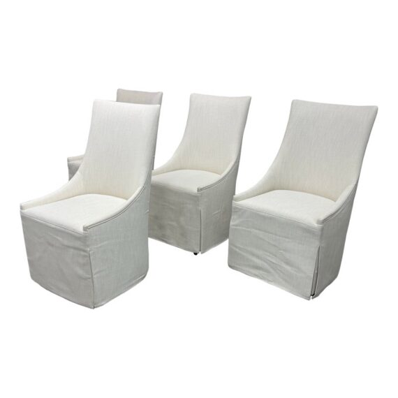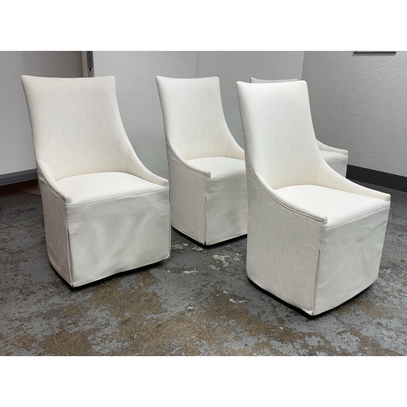 Design Plus Gallery presents a Set of Four Ella Skirted Fabric Dining Side Chairs from Restoration Hardware. The chairs embraces the sculptural curves and tailored elegance of 1940s furnishings. Masterfully handcrafted with high back and comfortably padded seat, its tailored skirt adds casual yet sophisticated appeal. The chairs have casters for easy mobility. In good condition, visible and minimal from usage. Made in Vietnam.