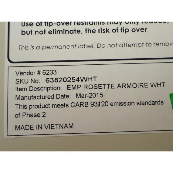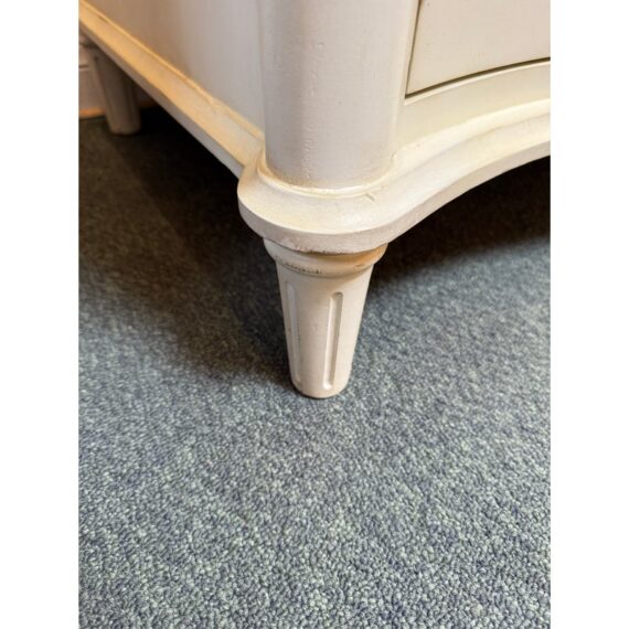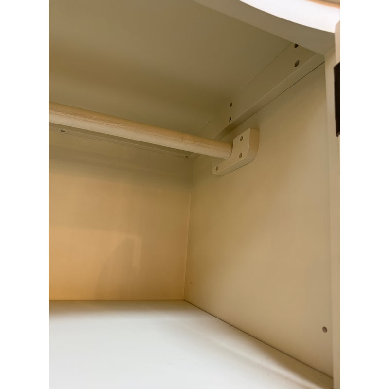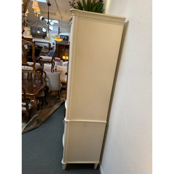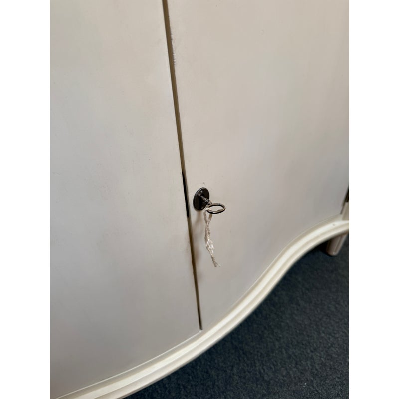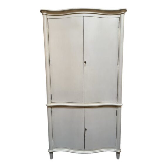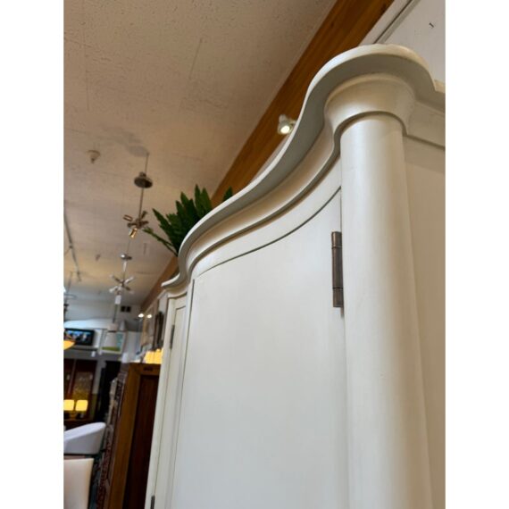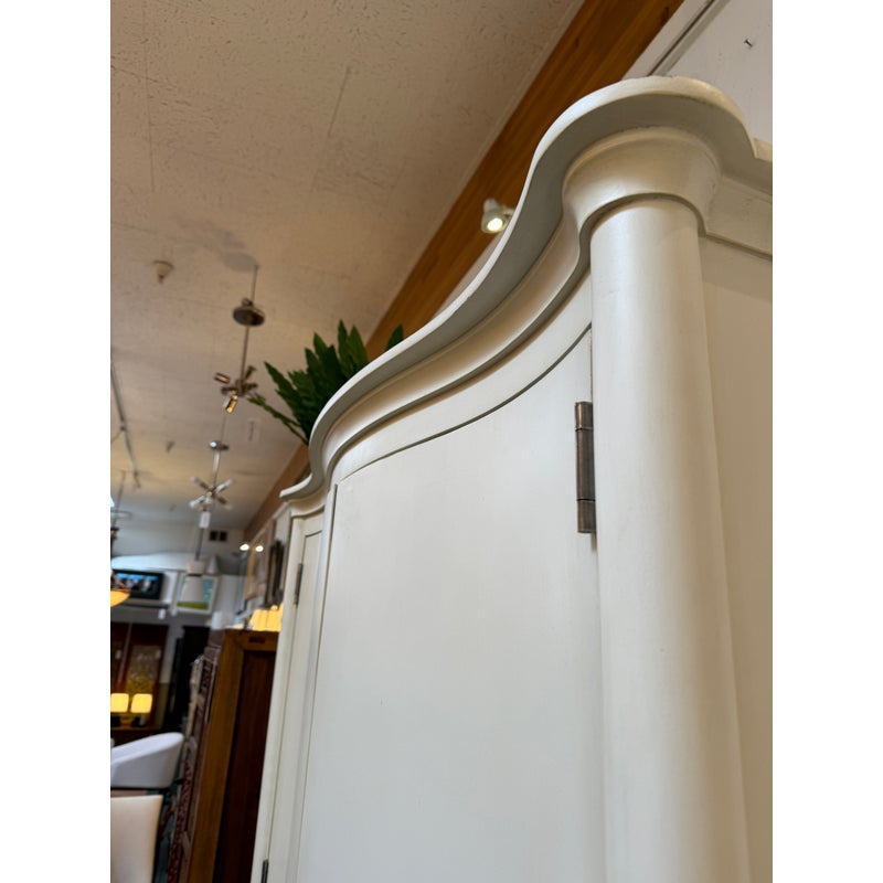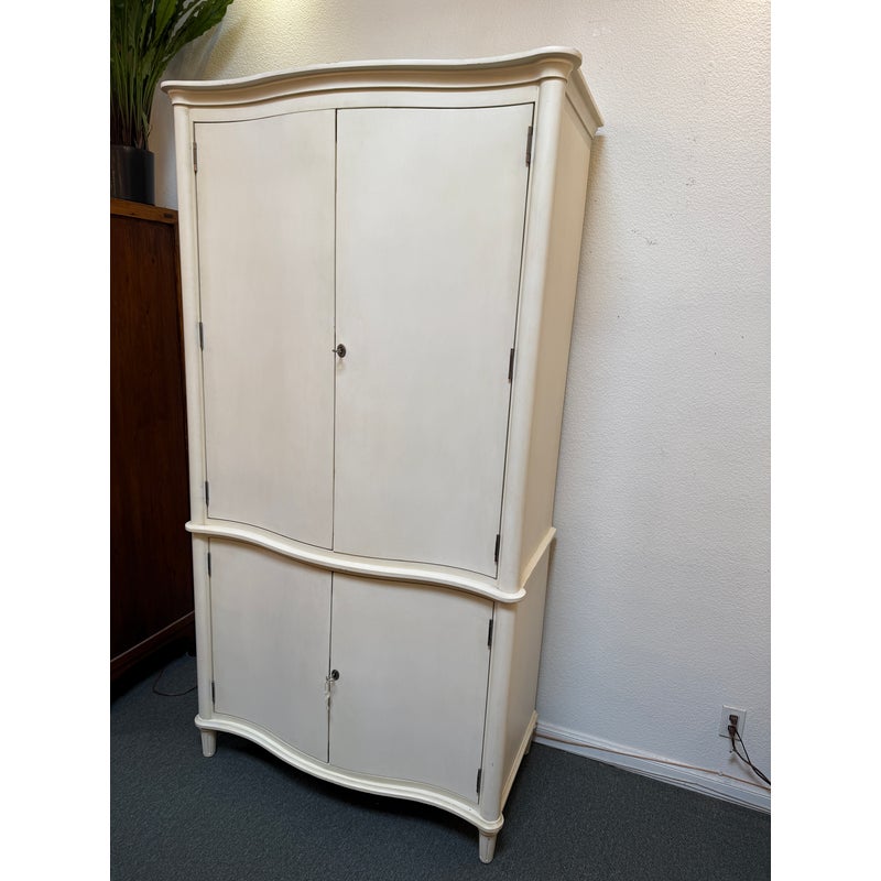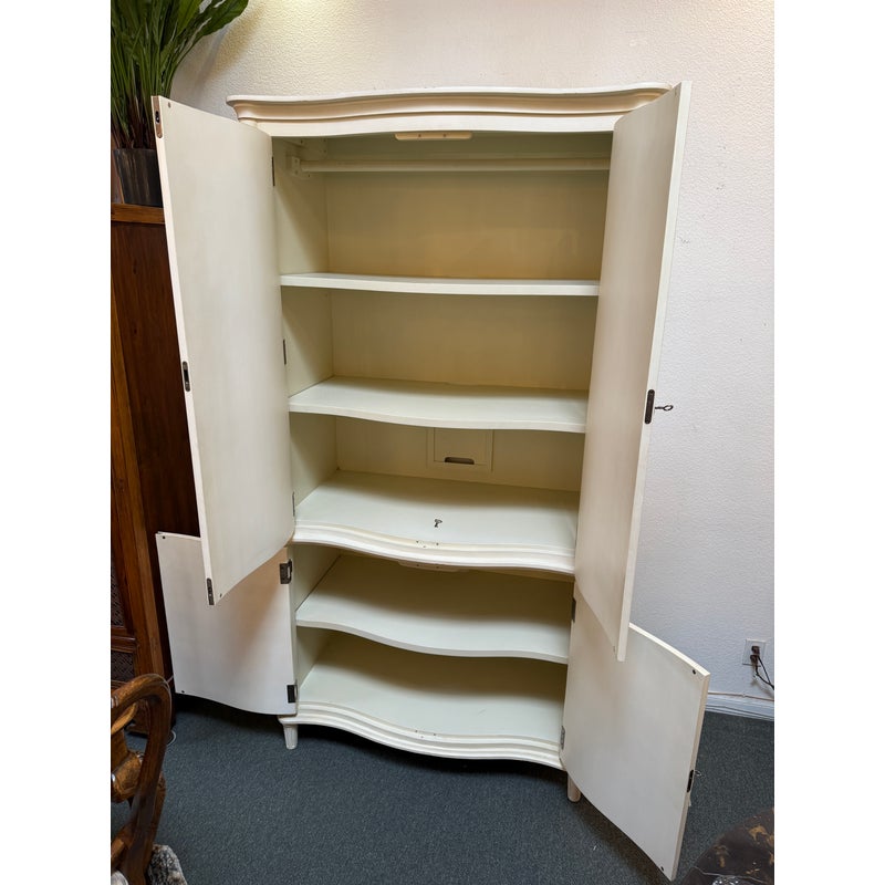 Design Plus Gallery presents the Empire Rosette Wardrobe Armoire from Restoration Hardware. This cabinet is made of solid hardwood with a distressed antique white finish lightly embellished with antique nickel hardware. The bow front upper section has a pair of adjustable shelves and a removable hanging bar for clothes storage, as well as cord access. The lower section contains an adjustable shelf. Mortise-and-tenon joinery and English-dovetailed drawers insure quality and longevity and stands on tapered legs. The style of armoire has been taken out of production with Restoration Hardware, get it while you can! Light surface wear; condition is good for age and use.